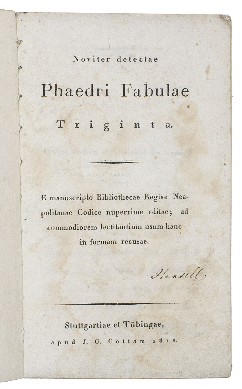 The fables were edited already in 1809 by G.A. Cassitto and in 1811 by Cataldo Jannello. In 1812 there were even three editions: Paris, Renouard and one in Jena. Our edition is probably after the Jena-edition, which was considered to be not very accurate. Besides, many scholars raised doubts about the authorship of Phaedrus. Nevertheless it still remains an interesting collection of fables.