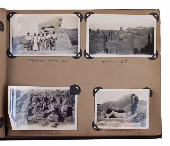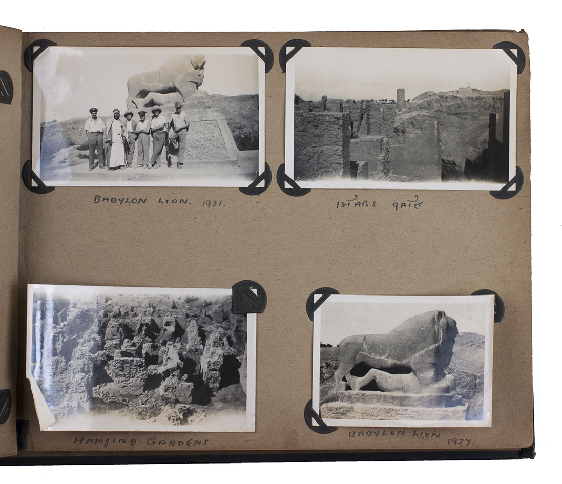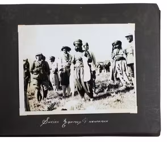 A collection of about 275 photographs made by an RAF pilot, Sergeant William Reynish, during his service in Iraq ca. 1928-1933 and Malta 1933, and during a brief visit to Egypt. Most have captions written on the album leaves clearly identifying the scenes. Some photos show scenes of daily life in Iraq (Bagdad, Hinaidi, Mosul and other cities, as well as the surrounding countryside) with local people, shops, buildings, landscapes, ruins, monuments, etc. Others show the British troops and their activities, vehicles, airplanes (including crashed ones), etc. The portraits include an unidentified sheik with a falcon and an Arabic man smoking a hookha water pipe. The Kurdish Sheik Mahmud Barzanji of Sulaimaniyah, rebelled against the Iraqi army around June 1930 but the RAF bombed his people's villages from September 1930 to April 1931, when he finally surrendered to Major W.C.F.A. Wilson, administrative inspector at Mosul. Several photographs cover the sheik and his surrender.