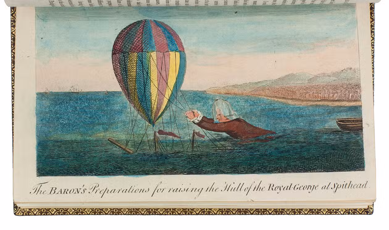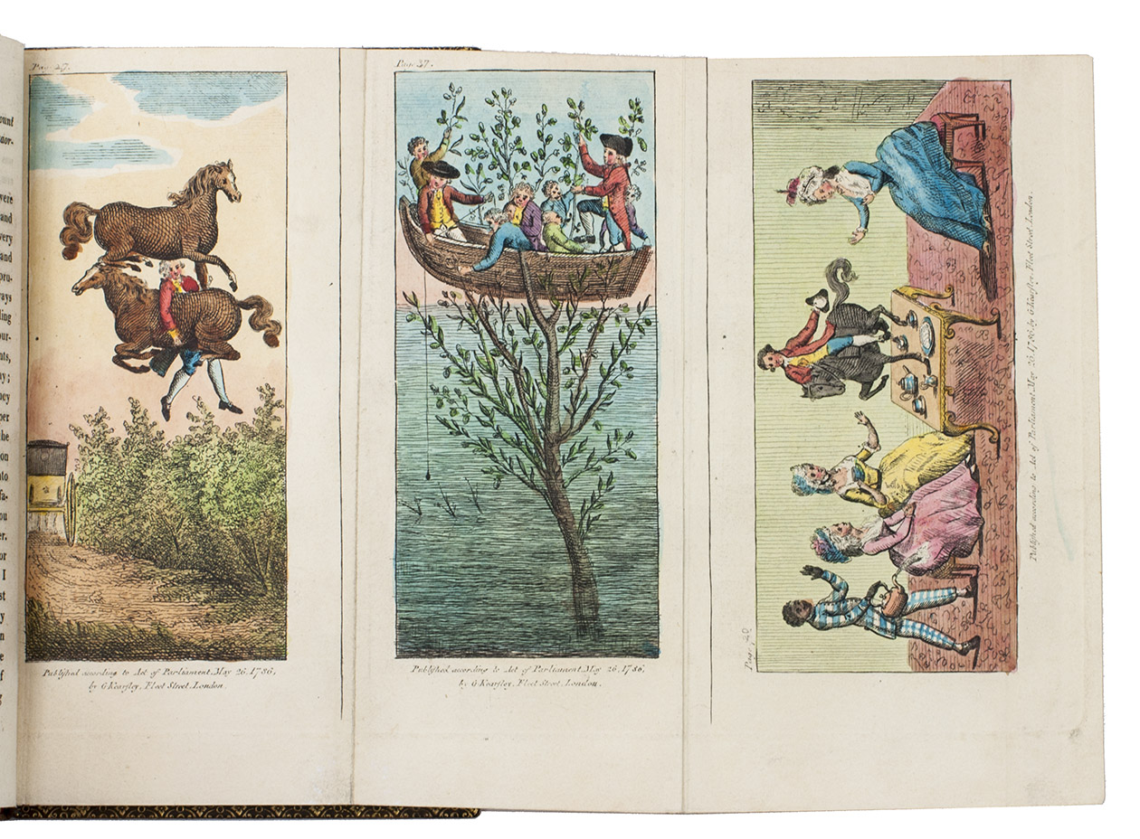 London, R.S. Kirby, 1819. 2 parts in 1 volume. 12mo. With a hand-coloured portrait of Baron Munchhausen as a frontispiece, and 27 hand-coloured engraved plates, including 8 folding. Contemporary gold-tooled calf, with a red morocco title label lettered in gold on the spine, gold-tooled board edges and turn-ins, marbled endpapers, bound by Wallis (stamp on verso of first flyleaf). Kept in a marbled paper (and brown calf fore edge) slip case. XII, 179, [1] pp.