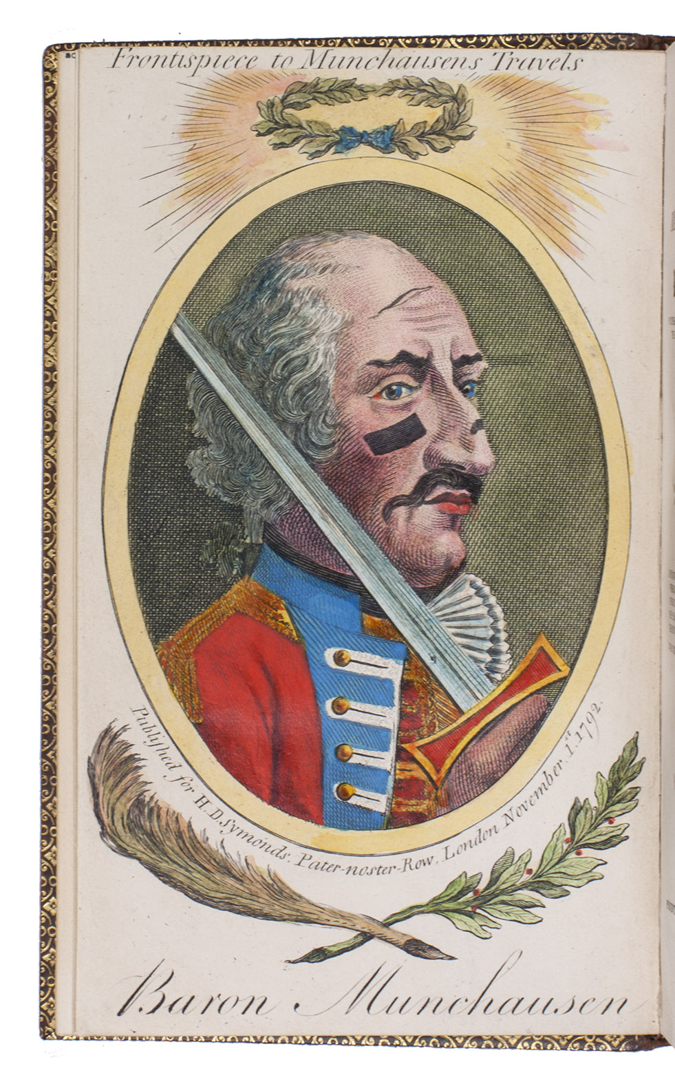 Beautifully bound later English edition of The surprising adventures of Baron Munchausen by Rudolf Erich Raspe (1736-1794), first published in Oxford in 1786. Raspe was a German librarian, writer, and scientist, and is best known for his present collection of tall tales, which was originally a satirical work with political aims. The work contains stories about the fictional character "Baron Munchausen", which is based on Karl Friedrich Hieronymus baron von Münchhausen (1720-1797), a German nobleman who served in the Russian army against the Ottomans. He is known for telling tall tales about his adventures, which were then used as a source for fantastical folktales and literary fiction.