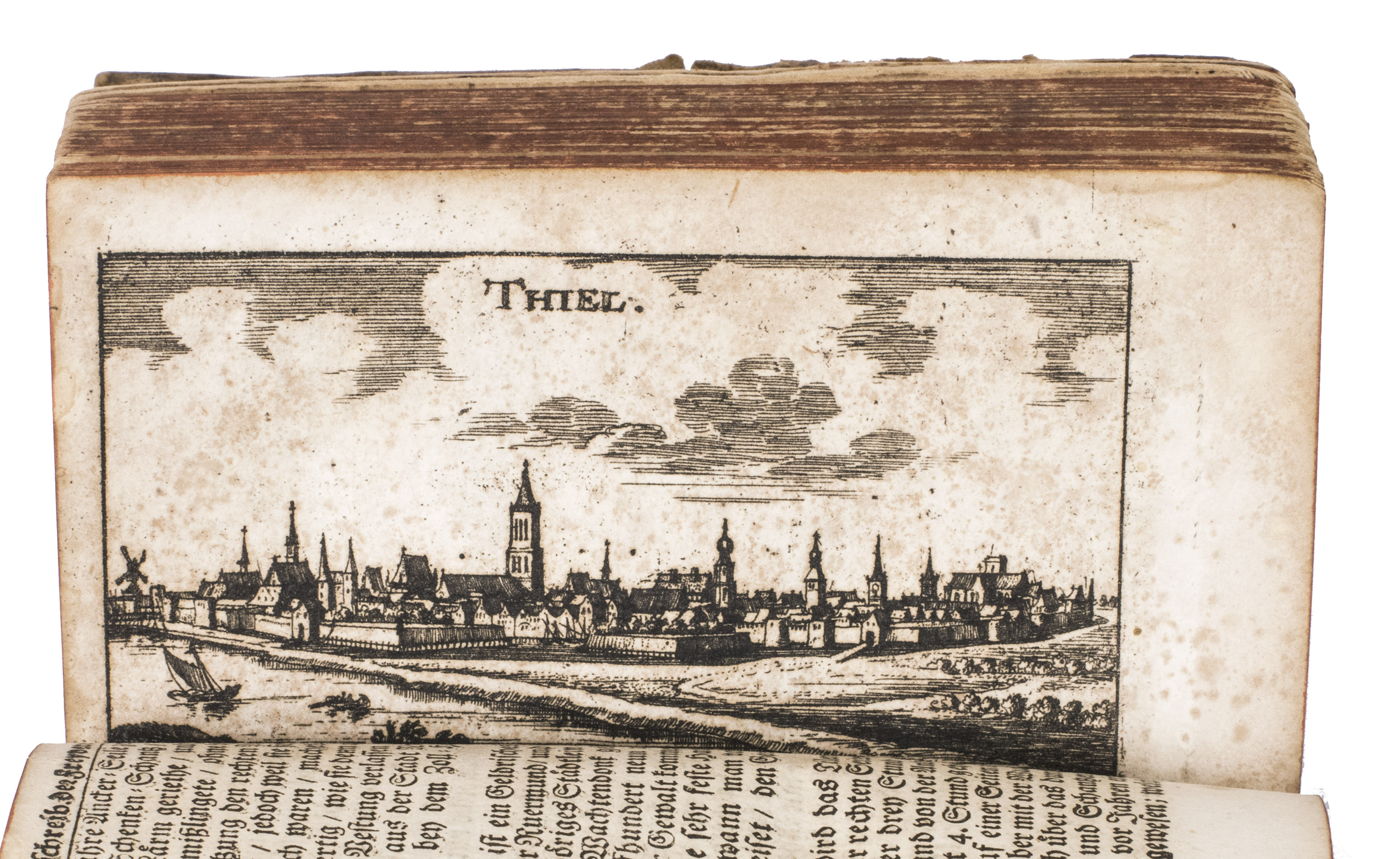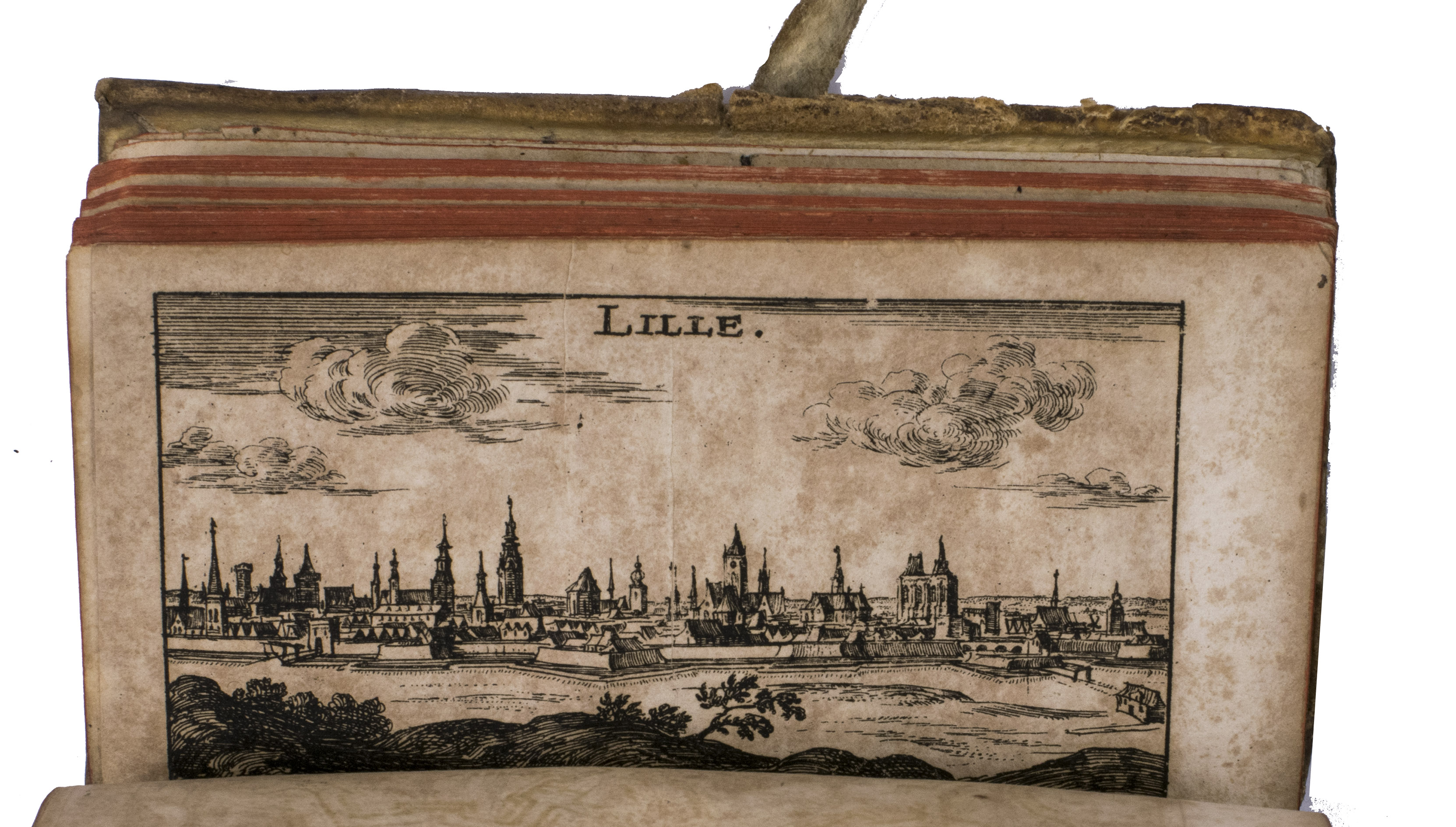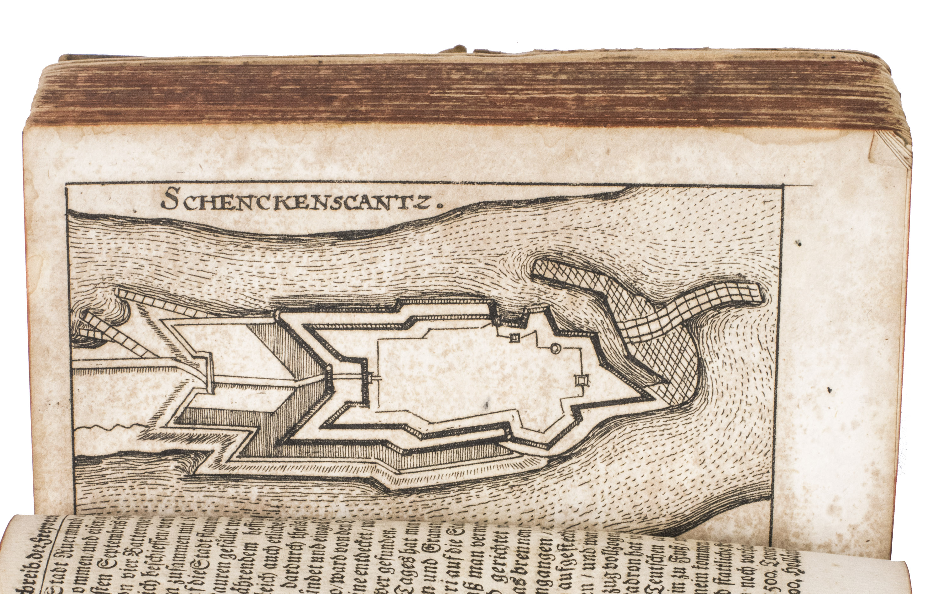 Frankfurt am Main and Leipzig, Christoph Riegel, 1691. 12mo. With a folding engraved frontispiece, 61 full-page engraved plans, and 59 full-page engraved views of the cities and fortifications of the Low Countries. Contemporary vellum with an oval supralibros mounted in the centre of both boards, red edges, leather closing ties. [8], 1078, [8] pp. + 120 engravings.