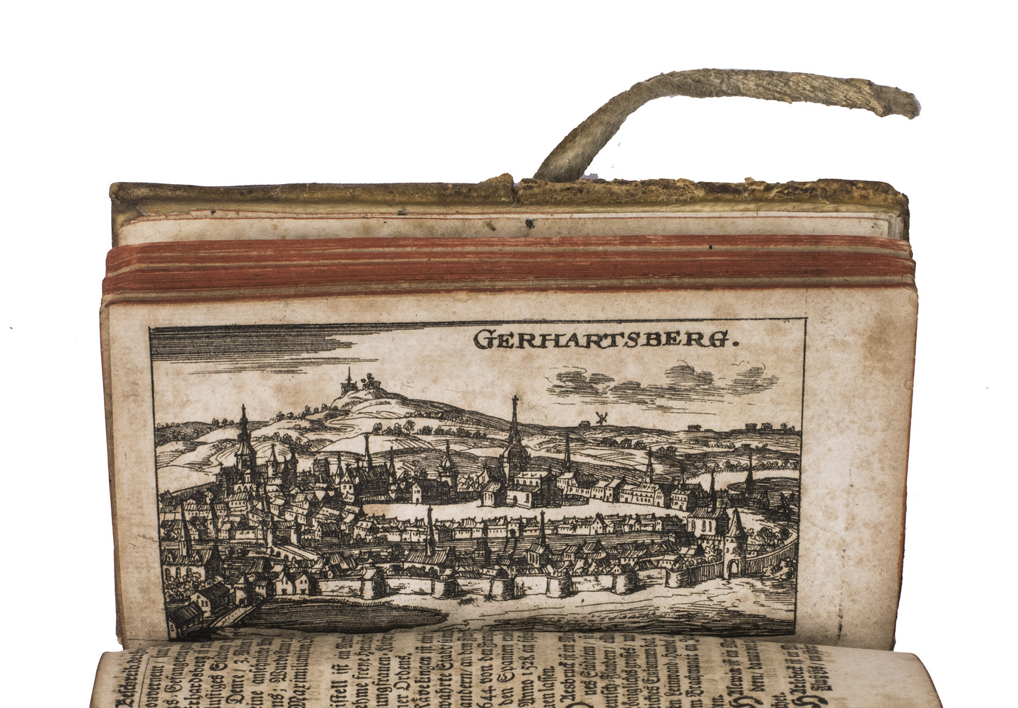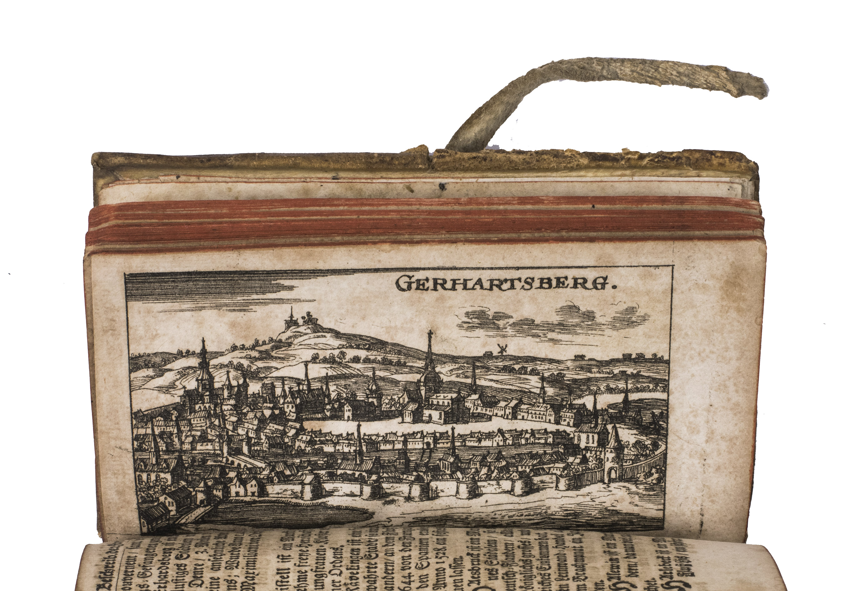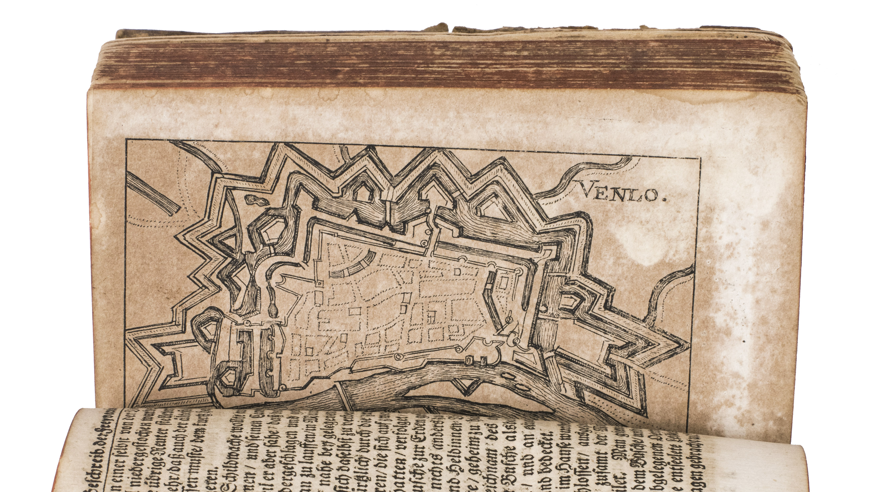 Frankfurt am Main and Leipzig, Christoph Riegel, 1691. 12mo. With a folding engraved frontispiece, 61 full-page engraved plans, and 59 full-page engraved views of the cities and fortifications of the Low Countries. Contemporary vellum with an oval supralibros mounted in the centre of both boards, red edges, leather closing ties. [8], 1078, [8] pp. + 120 engravings.
