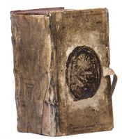 The vellum is rubbed, affecting the clarity of the supralibros, the spine has been restored, lacking 4 of the 6 closing ties. The work is somewhat browned and foxed, a small hole in leaf I7 (pp. 205-206) with some loss of text. Otherwise in good condition. Georgi, I, 136; USTC 2550794 (13 copies); VD17, 39:107693D.