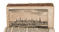 Frankfurt am Main and Leipzig, Christoph Riegel, 1691. 12mo. With a folding engraved frontispiece, 61 full-page engraved plans, and 59 full-page engraved views of the cities and fortifications of the Low Countries. Contemporary vellum with an oval supralibros mounted in the centre of both boards, red edges, leather closing ties. [8], 1078, [8] pp. + 120 engravings.