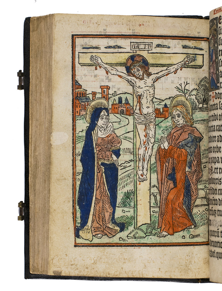 Caerr, p. 73, notes that Kervers present first publishers device is "universally recognised as a master-piece". It has been suggested that Kervers criblée blocks were metal cuts rather than woodcuts. The crucifixion scene facing the opening of the Canon is a more traditional woodcut. Caerr, p. 51, suggests Kerver reached the pinnacle of his success in his stylistic evolution in or around 1506, fully incorporating Renaissance tastes in the period 1505-1514 and perfecting the criblée technique used for his present publishers device and initials. The present edition is also a very early example of the use of abstract typographic ornaments. The preliminaries include a calendar of feast days and most of its less common Saints days printed in red suggest a Franciscan connection.