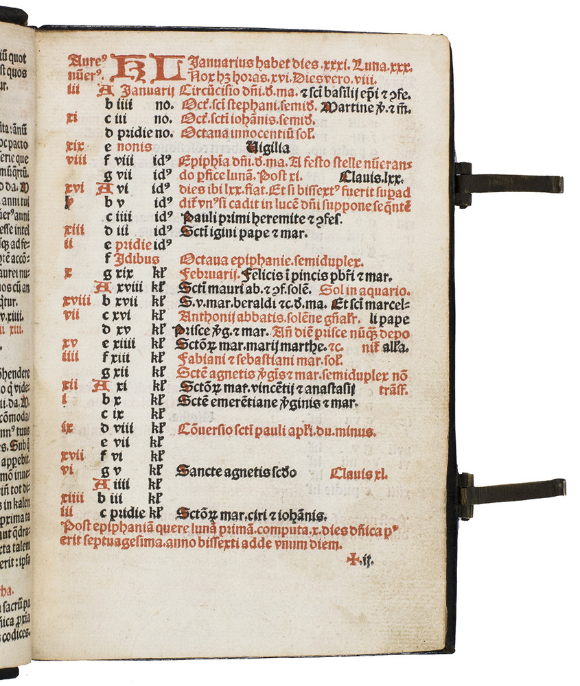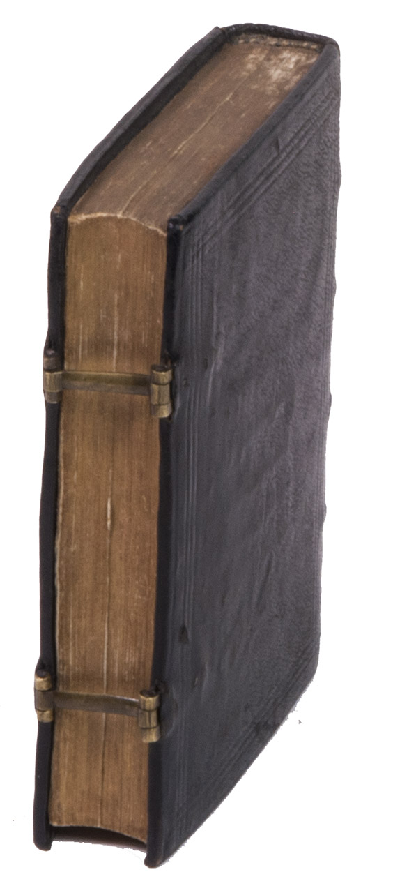 With an inscription in the head margin of the title page, partly shaved and difficult to read; the engraved publishers device of the Antwerp printer and publisher Jean Baptiste III Verdussen (1698-1773) on the front and back pastedown, serving as his bookplate (see above). Also with an 1831 owners inscription of S.[?] De Ram on a free endleaf facing the title page. The rubricator or an early owner has added several notes in red in the calendar. Further with an occasional early marginal manuscript note, some shaved. Four words in the Canon have been deliberately erased as an editorial revision. With an 8 cm tear into one leaf , the running heads of a few others shaved, the title-page slightly soiled, a 3 mm hole in leaf 232 (E4) affecting 2 or 3 words, some tiny marginal wormholes in a few leaves and some water stains in the endpapers, otherwise in very good condition. The binding shows a few small defects, one slightly affecting the gold lettering on the front board, but is also generally very good. A rare and beautifully produced missal, and the second major display of Kervers stunning criblée initials, all coloured by a contemporary hand, as are the woodcut and Kerver's device. Thierry Caerr, Imprimerie et réussite sociale à Paris ...: Thielman Kerver ..., 2000, 2 vols. (www.enssib.fr/bibliotheque-numerique), 117 (4 copies, erroneously described as a folio); Catalogue ... bibliothèque de feu ... Jean de Meyer (Ghent, 2-5 November 1869), lot 33 (8vo, 23 March 1506, not mentioning Kerver, but with "alma Parisiorum Academia"); Pettegree, French books 68270 (not noting Kervers name) & 68271 (erroneously described as a folio) (1 of the same 4 copies); Frank Isaac reworked by David Shaw, frenchpostincunables.djshaw.co.uk, IS000343; USTC 68270 (not noting Kervers name) & 180236 (erroneously described as a folio) (same copy as Pettegree); Catalogue ... de la bibliothèque de M. Jean François van de Velde (Ghent, 1831), lot 1360 (with an extra woodcut inserted facing leaf 58); Catalogus librorum Joannis Baptistae Verdussen (Antwerp, widow of Hieronymous Verdussen, 15 July 1776), liturgy lot 45 (the present copy); Weale & Bohatta, Bibliographia liturgica (1928), 982 (23 March 1506, 2 copies) & 985 ([11] February 1506, not noting Kervers name, no copy located), both on p. 147 in the 1886 ed.; WorldCat 152428895, 315474570, 843131050, 843131052, 906577964, 1063178422 (5 copies plus 2 ghosts); not in Adams (no Kerver missal before 1515); Davis, Fairfax Murray (French), (no Kerver missal); Mortimer, Harvard (French), (no Kerver missal before 1574); SUDOC; catalogue.bnf.fr.