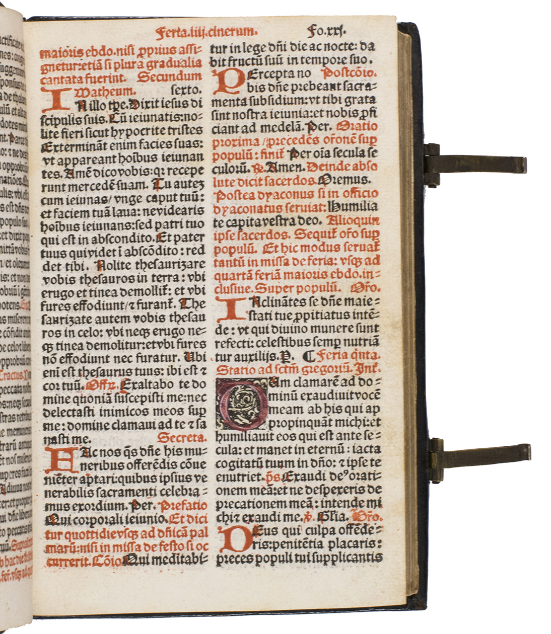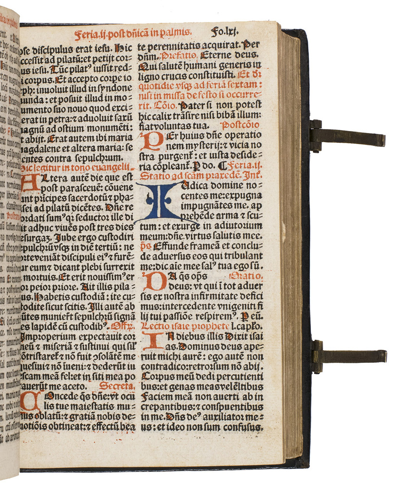 [Paris], Thielman Kerver, [colophon: anno domini 1506. x. kalendas apriles = 23 March 1507]. 8vo. Printed in red and black throughout in 2 columns, with Kervers finely executed criblée armorial device on the title page, a crucifixion woodcut, hundreds of impressions of at least 28 finely executed lombardic initials with decorations, as well as dozens of spaces left for manuscript initials, about half with printed guide letters, and a two-impression plainchant music type. The capitals are rubricated throughout. The main text is set in a rotunda gothic type, and the Canon in a larger textura gothic. The woodcut crucifixion, Kervers device and the criblée initials are all coloured by a contemporary hand. Gold- and blind-tooled black goatskin morocco (1st half of the 18th century), the front board dated "ANNO|DOMINI|1506" in gold, and the spine-title "MISSALE|ROMANUM" in gold, marbled endpapers, gilt edges, 2 brass fastenings. [8], 233, [3] ll.