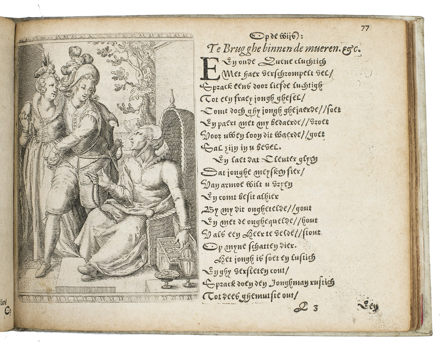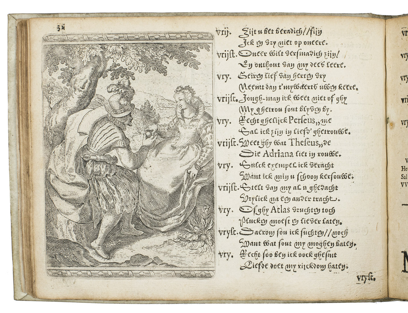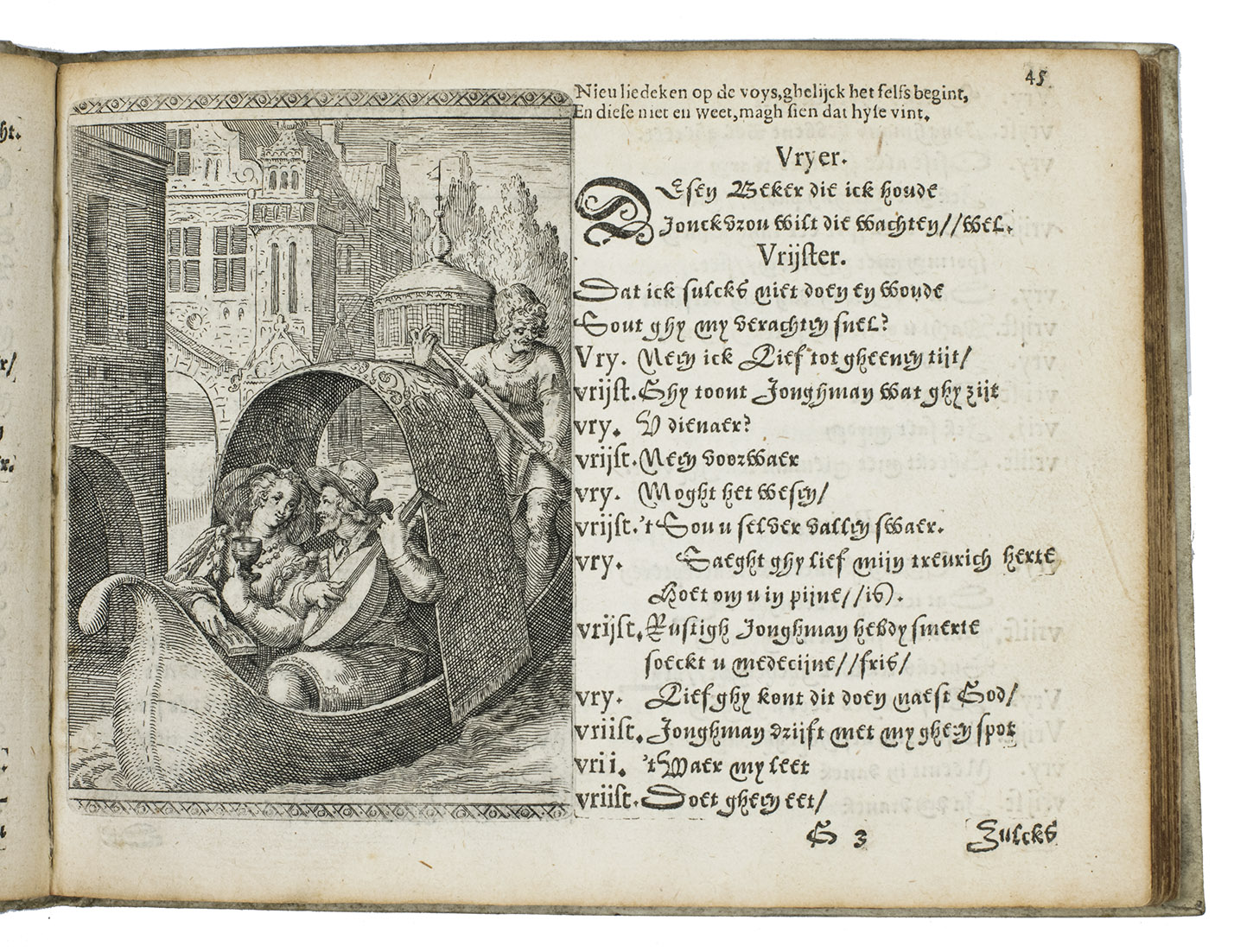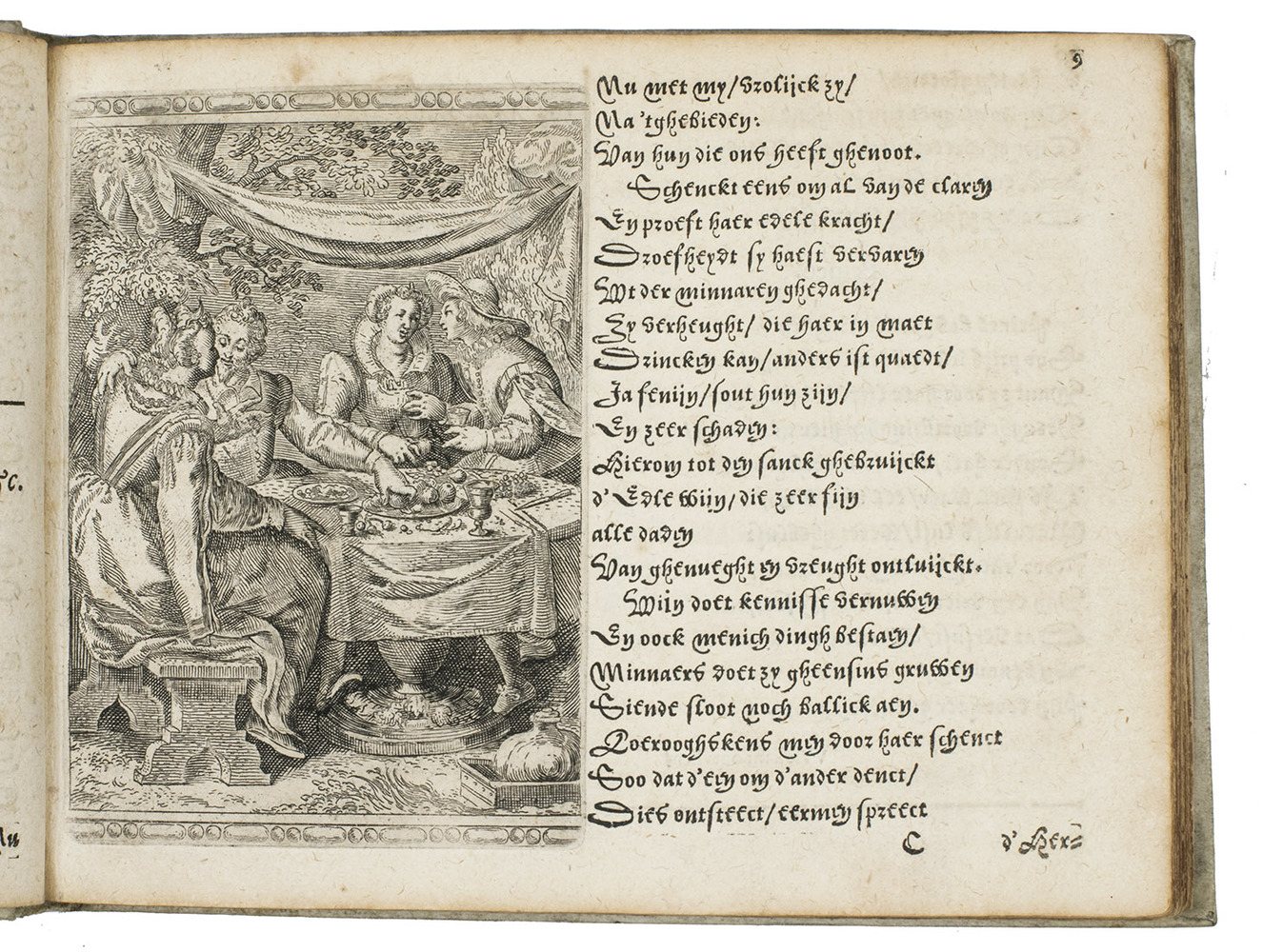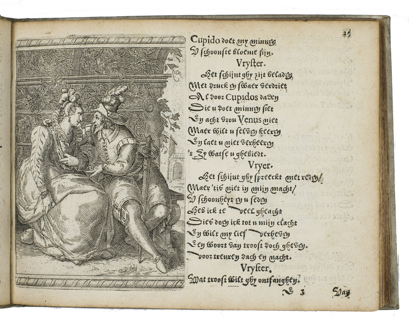 Rare fourth edition (the second to include the new early work of Hoofd and Vondel) of one of the most important and rarest Dutch songbooks, published for the "jeunesse dorée". Songbooks were a very popular genre in the Netherlands during the last quarter of the 16th and first of the 17th centuries - the beginning of the Dutch golden age. These songbooks were mostly printed in oblong format, and were undoubtedly connected with the new genre of the love-emblem book, so characteristic for the new Dutch Republic.