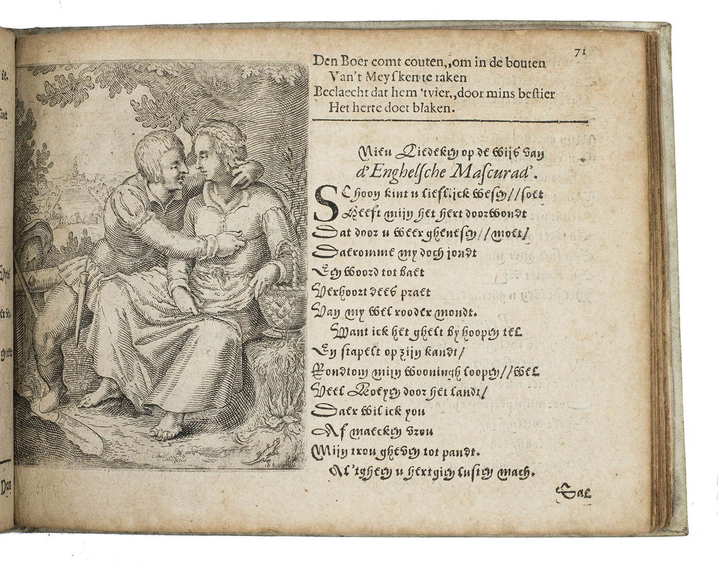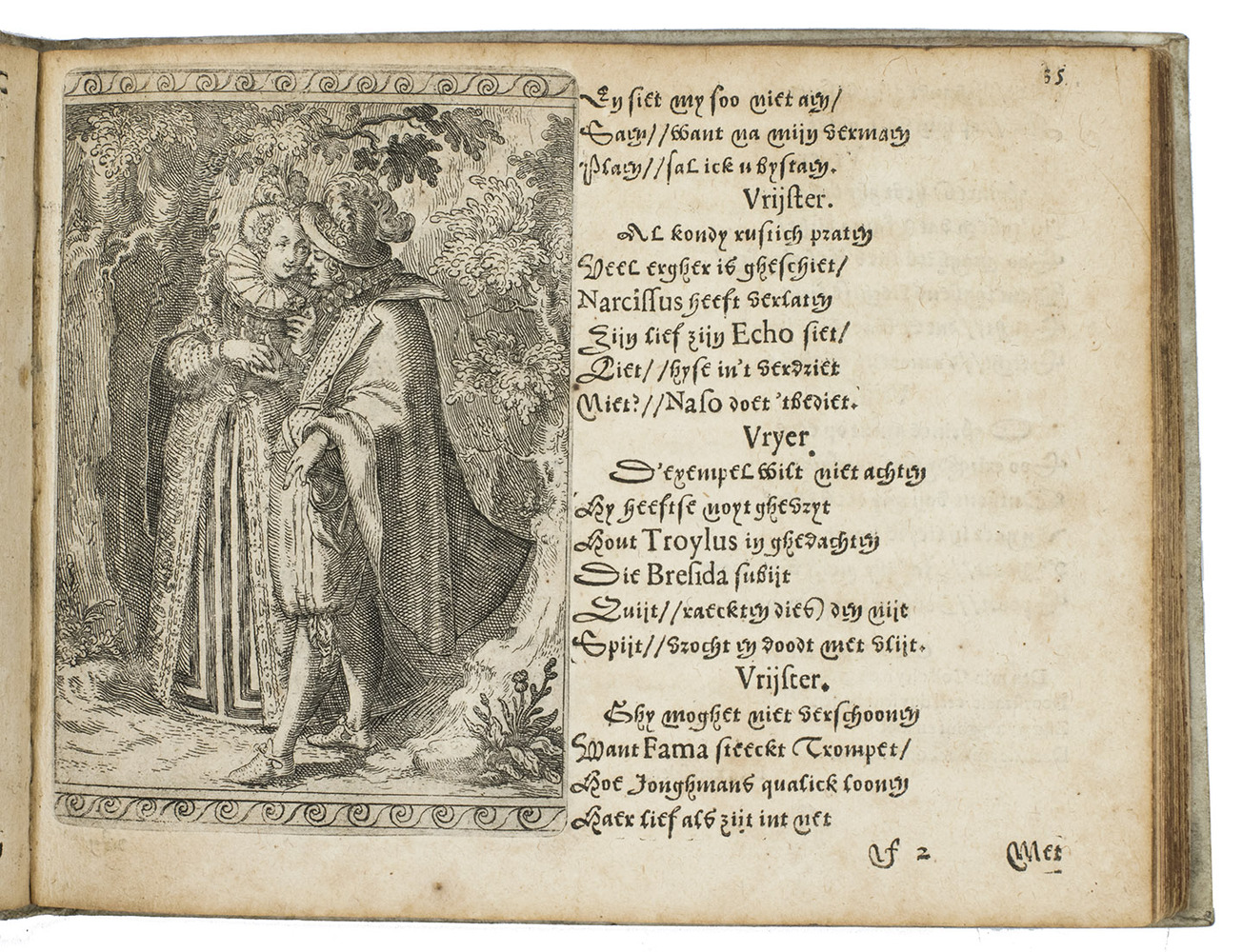 Among the songs and poems that Dirck Pietersz. Pers added in the third and fourth editions, moreover, are four poems by the young Pieter Cornelisz. Hooft (1581-1647) and at least three by the young Joost van den Vondel (1587-1679), as well as two by Karel van Mander and translations of two Pierre de Ronsard poems by Jacob van der Schuere. The publication of poems by two of the greatest Dutch poets of the 17th century makes this songbook extremely important for the Hooft and Vondel philology and bibliography.