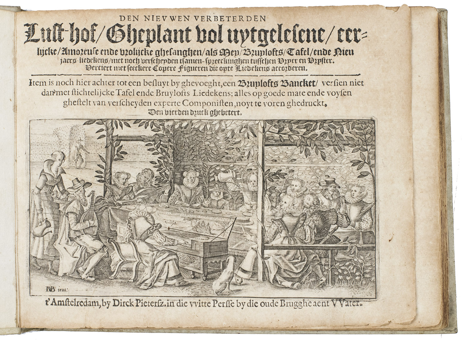 The beautiful large engraving that appears on both title-pages shows a company making music and drinking wine in a bower in a garden. At least on the second title-page it represents a wedding feast. It was drawn by the painter and engraver David Vinckboons (1576-1633) from Malines (Mechelen), who moved to Antwerp in 1579 and to Amsterdam in 1591, and is signed with his monogram, "DVB inv:".