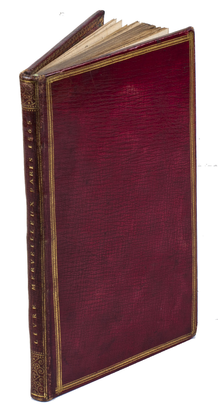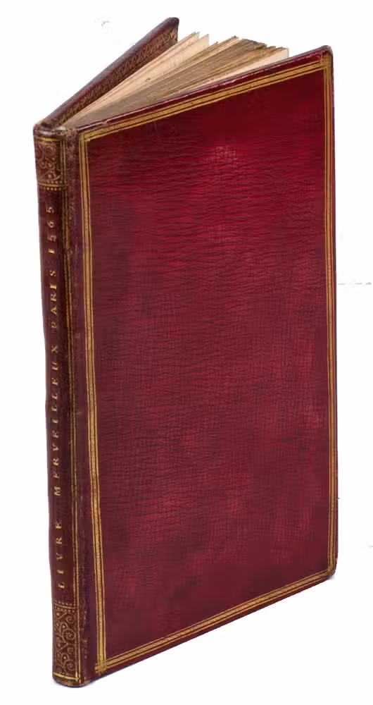 Paris, Thibault Bessault, 1565. 8vo. With Bessault's woodcut device on the title-page. 18th-century French grained red morocco (ca. 1745?), gold-tooled spine with pointillé ornaments, each board framed with thin-thick-thin fillets with a rosette(?) stamped over their intersections at the corners, gold-tooled turn-ins, gold fillets on the board edges, gilt edges. [54] ll.