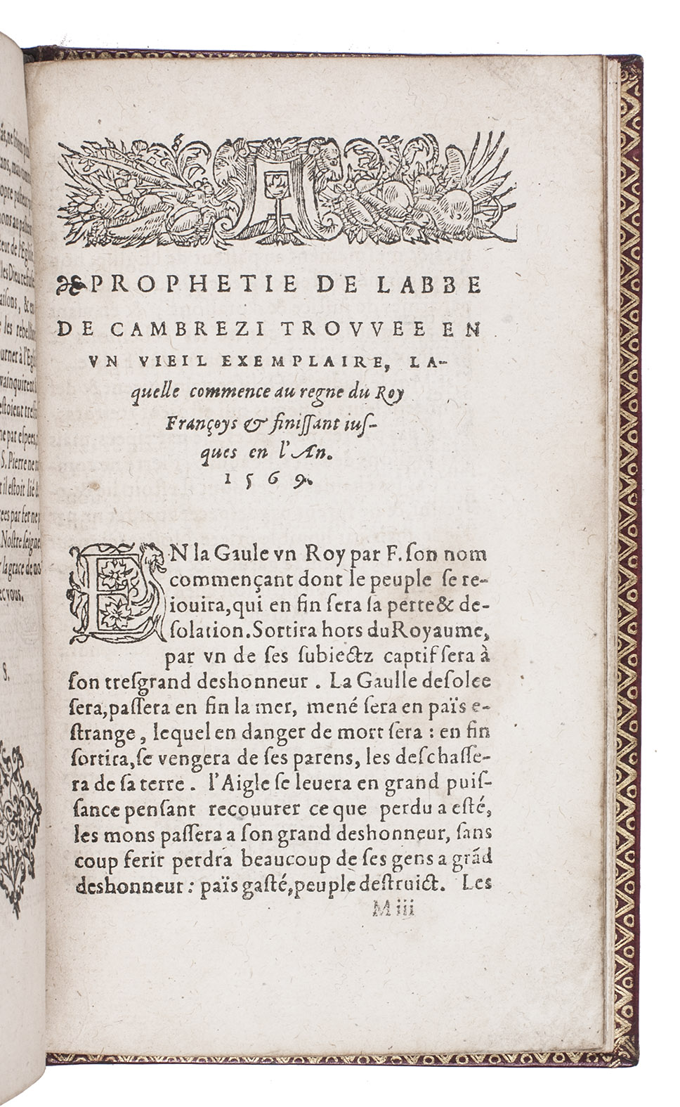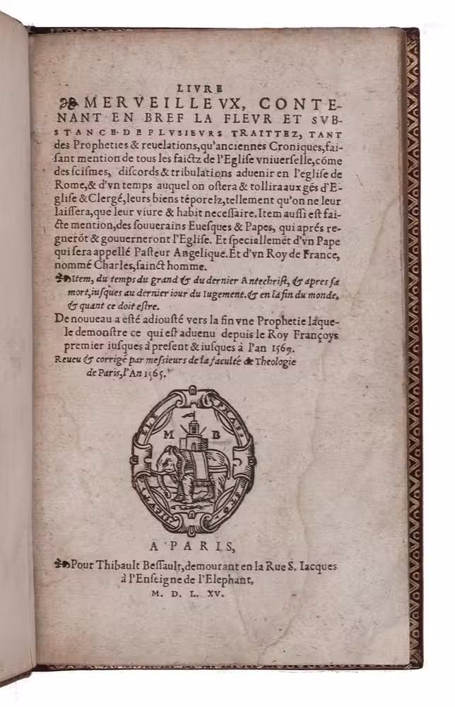 Extremely rare (third copy known?) and much sought second dated French edition (Bessault published the first earlier in the same year, but augmented it for the present edition) of a collection of fascinating and very intriguing prophecies about the Catholic Church and the coming of the Antichrist, dedicated by the Italian Franciscan hermit Tellesforo da Cosenza (presumably the compiler and perhaps even author) to "Anthoine, noble Duc de Gennes", meaning Antoniotto Adorno (1340-1398), who was 6th Doge of Genoa. The Avignon Papacy had been notorious for its corruption before 1377 and Tellesforo claims the prophecies were compiled from the writings of Gioacchino da Fiore (ca. 1130-1202), so they supposedly foretold Avignon's past troubles, giving credence to their predictions of further troubles still to come. It also predicts a new royal house in France in 1584, not far off of the Bourbons in 1589. Renouard attributes the French translation to Guillaume Postel (1510-1581).
