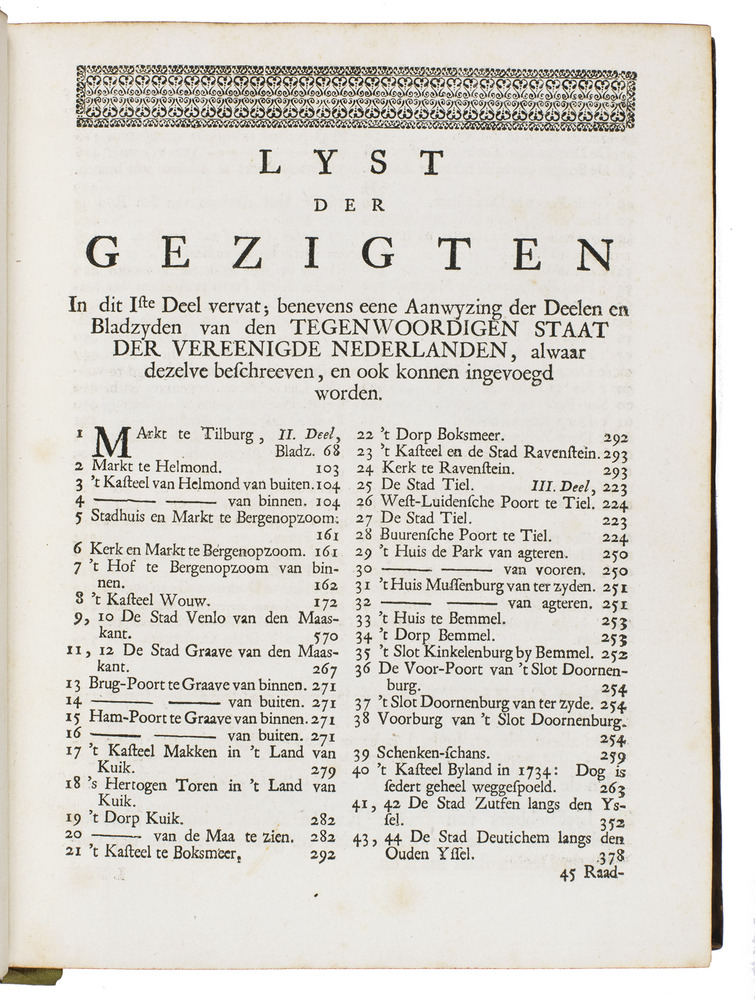Rare complete set of one of the finest series of views of the Netherlands of the 18th century. The work provides nearly 850 views of Dutch towns, and is therefore one of the largest illustrated topographical works that was published in the Netherlands at the time. The present set includes the very rare tenth part, which is nearly always missing, making complete sets exceptionally rare. We have only been able to trace three complete copies in sales records of the past hundred years, and the Dutch short title catalogue (STCN), has recorded only two in institutions.The first nine parts of the work were published by Isaak Tirion (ca. 1705-1765) and his wife between 1745 and 1774. It was produced to compliment the 23-volume Tegenwoordige staat der vereenigde Nederlanden (1739-1795), which contained descriptions of the whole country, but relatively few illustrations. Tirion himself published volume 1 to 6 between 1745 and 1757. Several years after his death, between 1773 and 1774, his widow published volume 7 to 9. The 10th part, Het verheerlykt Kleefschland, was subsequently produced by several other publishers to supplement Het verheerlykt Nederland, and contains another 91 views.