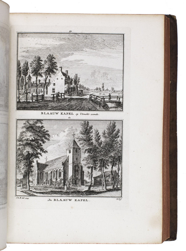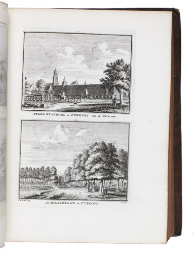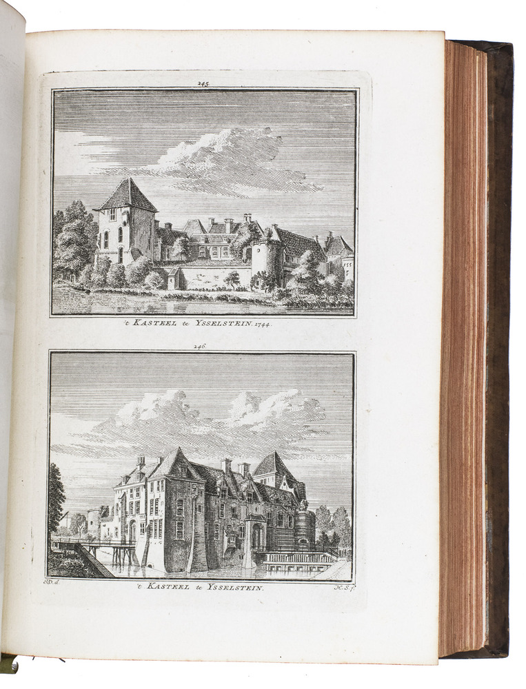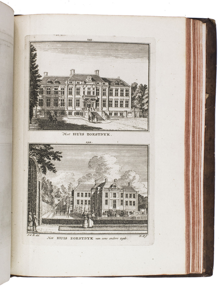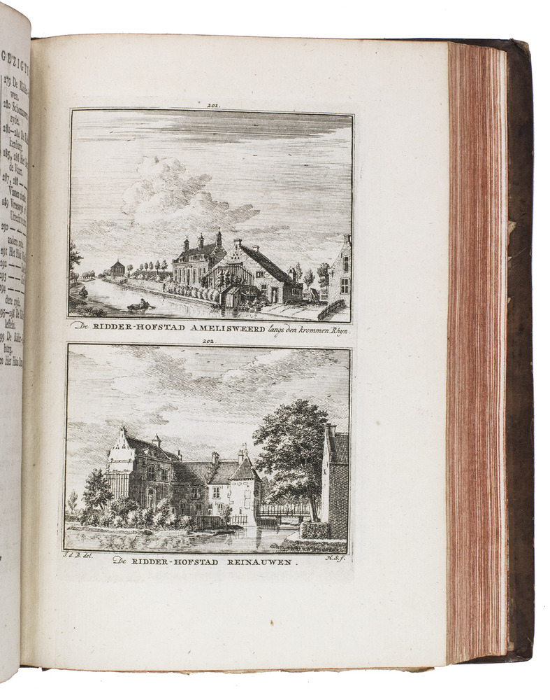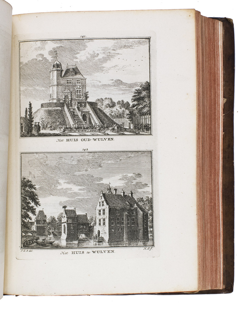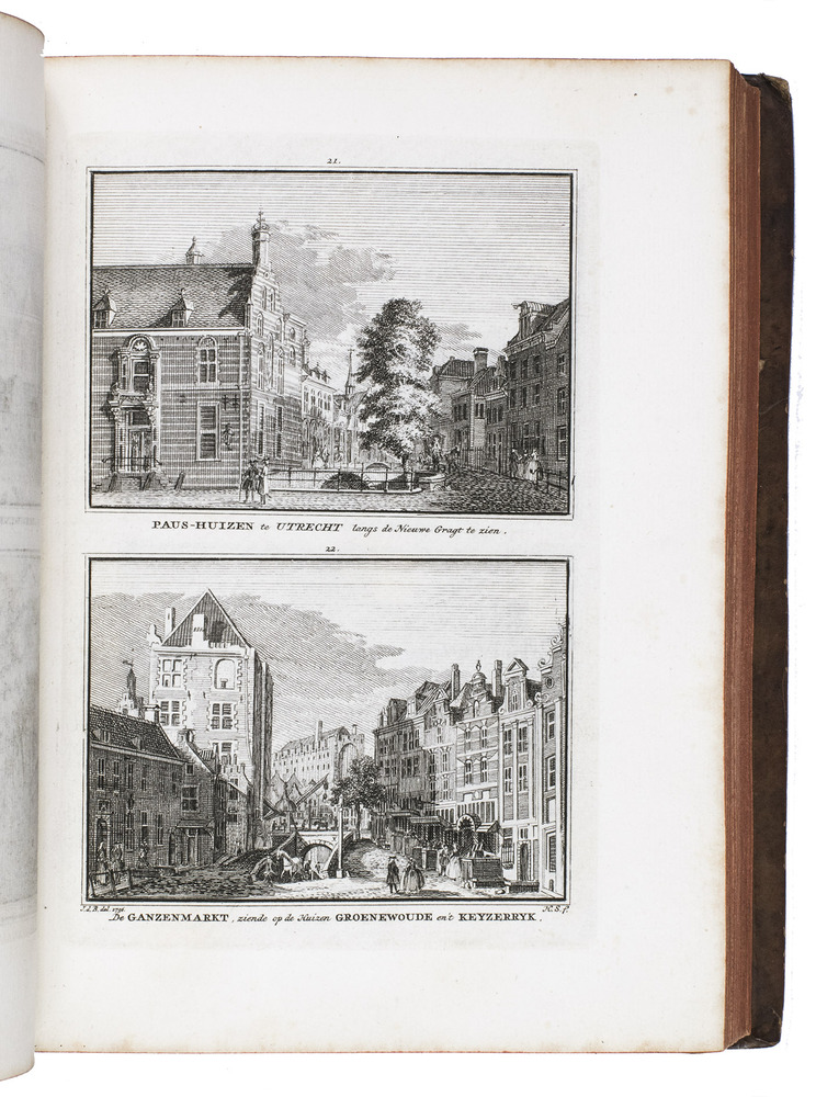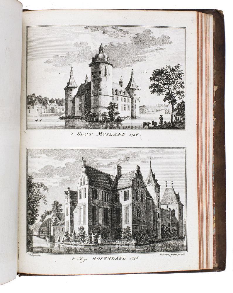 Each volume is dedicated to an individual province or region, but three are dedicated to Utrecht only. After Tirion's death, the original plan to depict every region individually was changed. The work contains plates and views of buildings and scenery in the provinces of Noord-Holland, Gelderland, Rijnland, Delfland, Zuid-Holland, Zeeland, and Utrecht. The 843 beautiful views were made by some of the most famous Dutch artists of the time: Hendrik Spilman, Hendrik de Winter, A. van Swyndrecht, A. van Broekhuizen, Cornelis Pronk, Abraham de Haan, and Jan de Beijer.With a brown paper shelf mark label mounted at the head of the spine of the first volume ("58"). The edges and corners of the boards are somewhat scuffed, the boards are slightly rubbed, lacking a small chip of leather at the foot of the spine of the second volume. Some of the title-pages are browned, but otherwise internally very clean, with only an occasional stain. Overall in very good condition. Ad 1: STCN 204508606 (24 copies, of which 15 incomplete); Tiele 1034; ad 2: STCN 316060445 (2 copies).