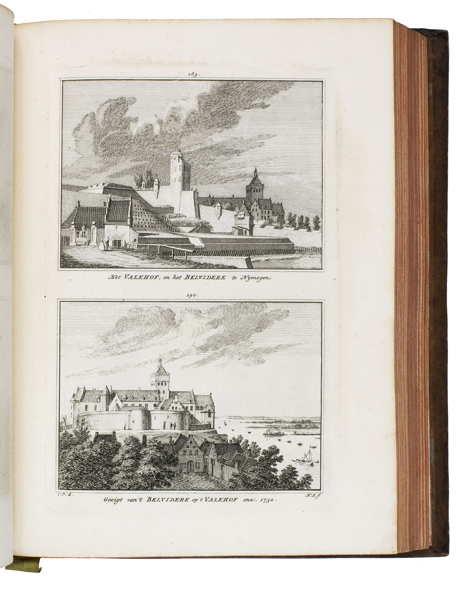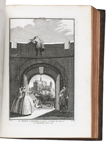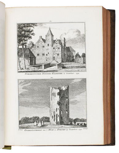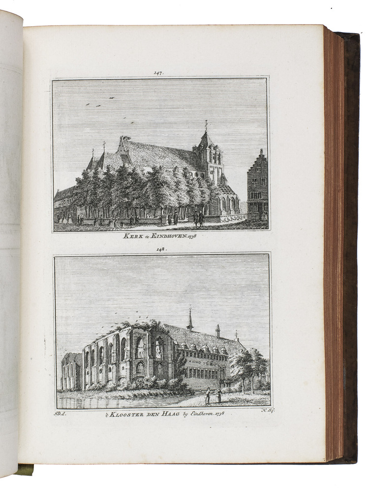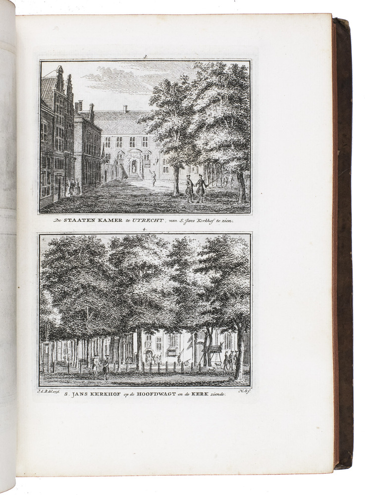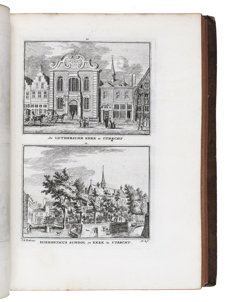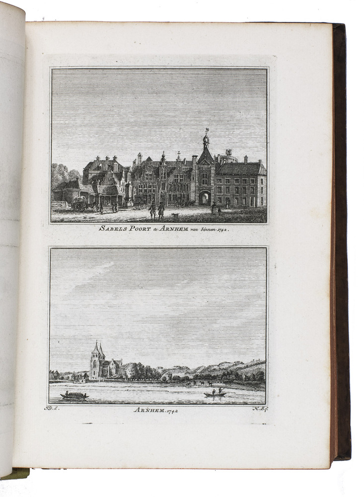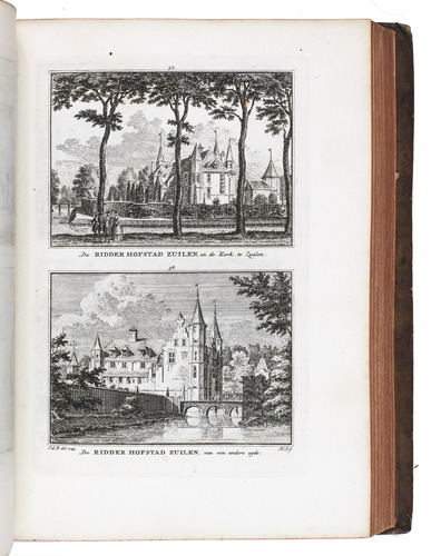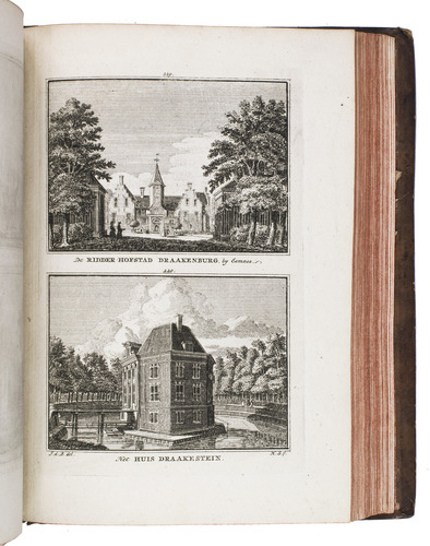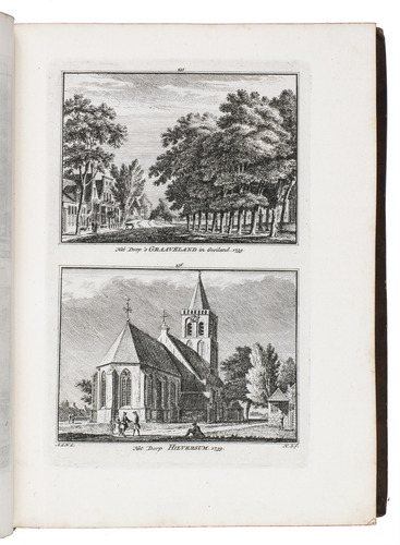 Each volume is dedicated to an individual province or region, but three are dedicated to Utrecht only. After Tirion's death, the original plan to depict every region individually was changed. The work contains plates and views of buildings and scenery in the provinces of Noord-Holland, Gelderland, Rijnland, Delfland, Zuid-Holland, Zeeland, and Utrecht. The 843 beautiful views were made by some of the most famous Dutch artists of the time: Hendrik Spilman, Hendrik de Winter, A. van Swyndrecht, A. van Broekhuizen, Cornelis Pronk, Abraham de Haan, and Jan de Beijer.With a brown paper shelf mark label mounted at the head of the spine of the first volume ("58"). The edges and corners of the boards are somewhat scuffed, the boards are slightly rubbed, lacking a small chip of leather at the foot of the spine of the second volume. Some of the title-pages are browned, but otherwise internally very clean, with only an occasional stain. Overall in very good condition. Ad 1: STCN 204508606 (24 copies, of which 15 incomplete); Tiele 1034; ad 2: STCN 316060445 (2 copies).