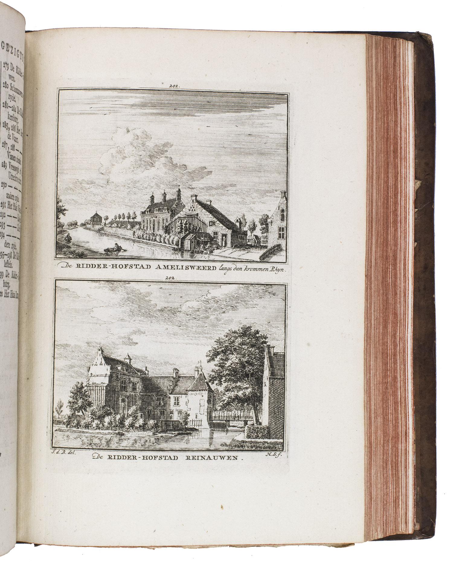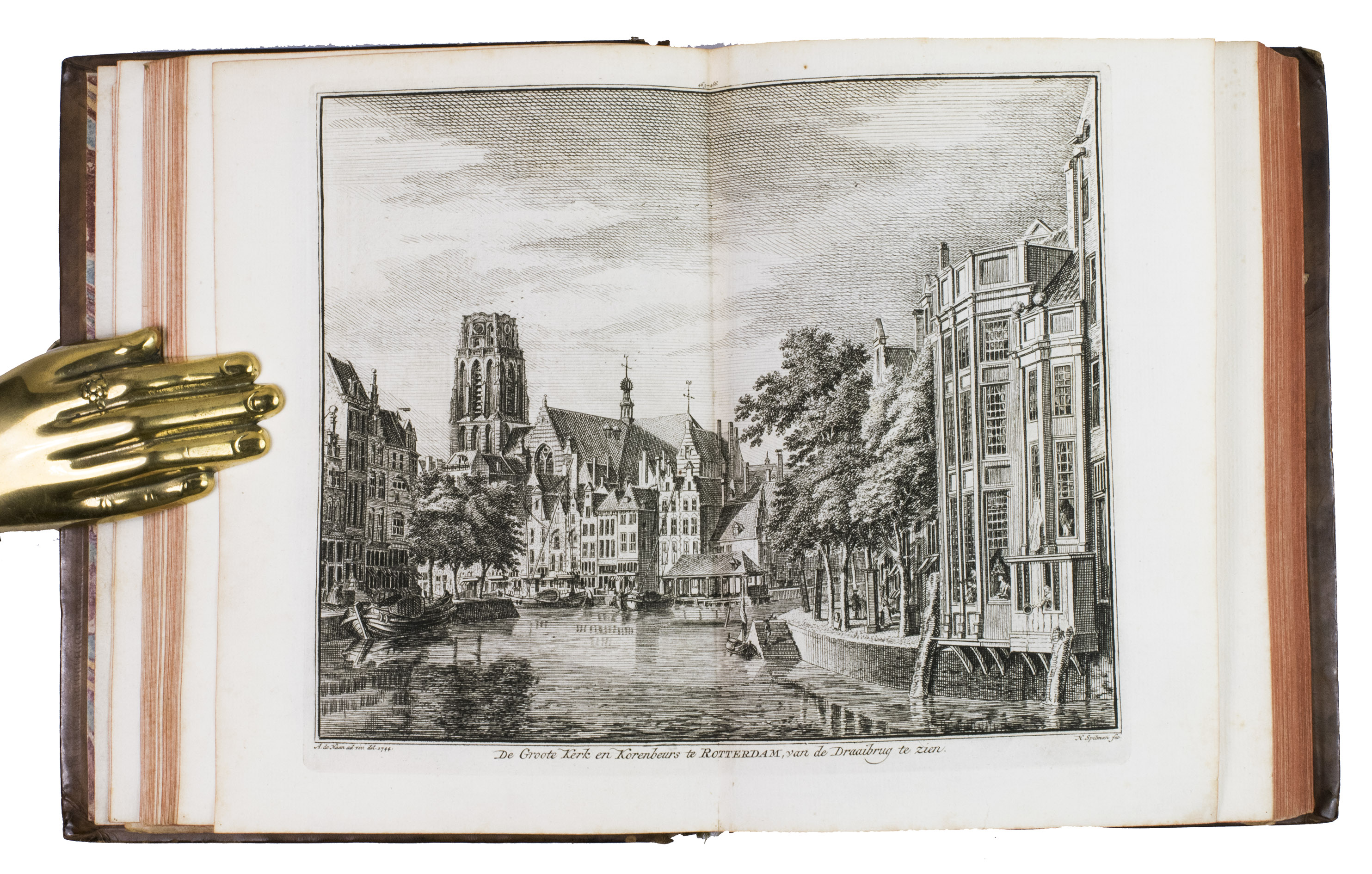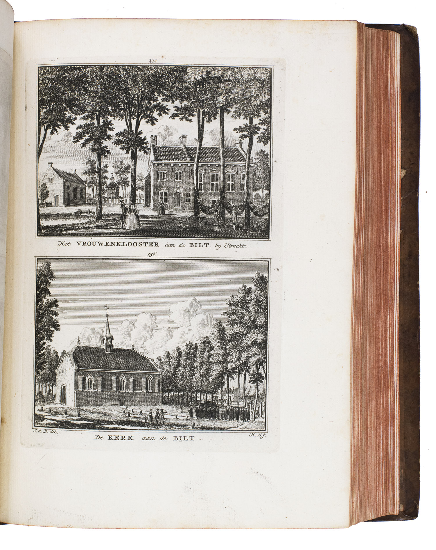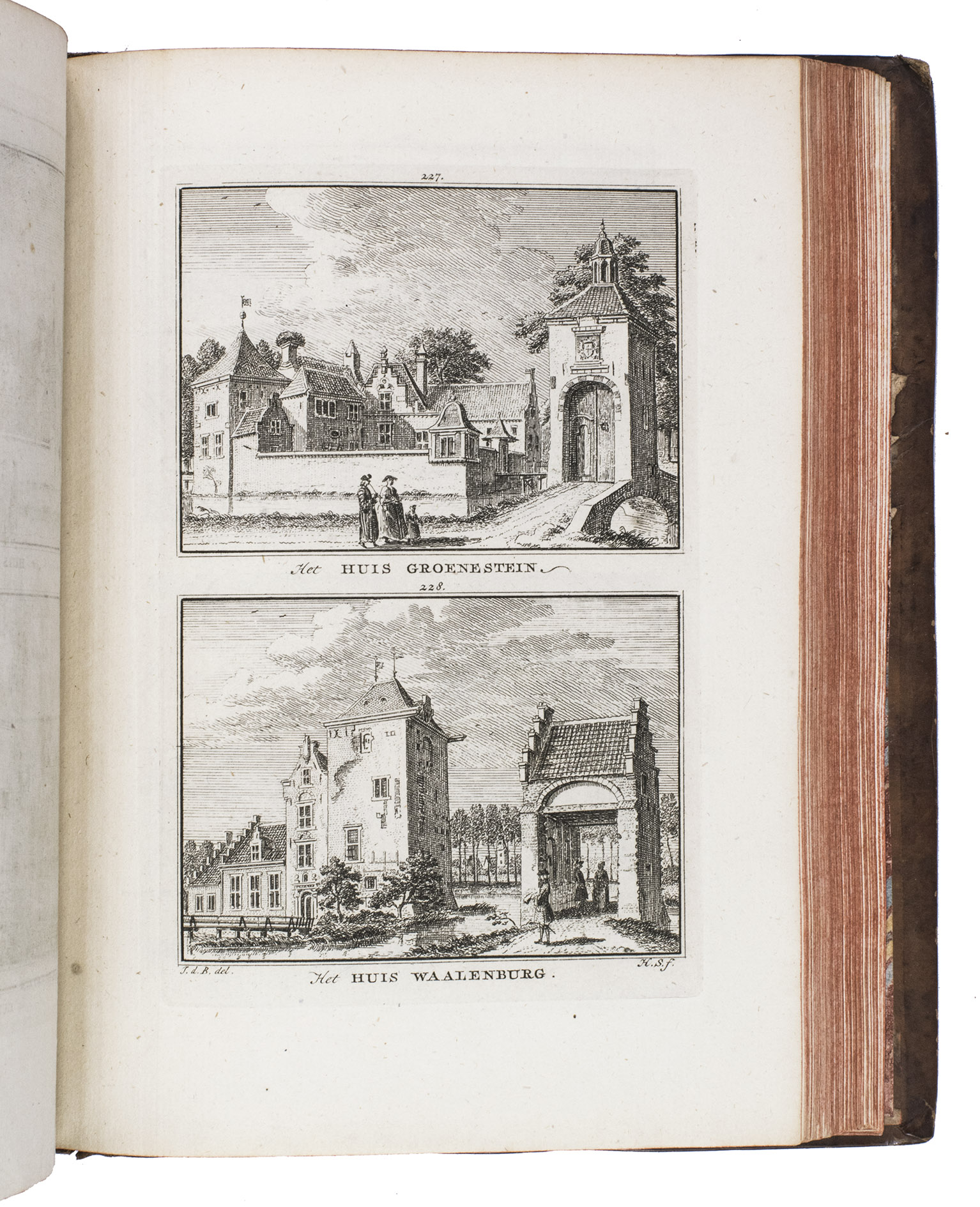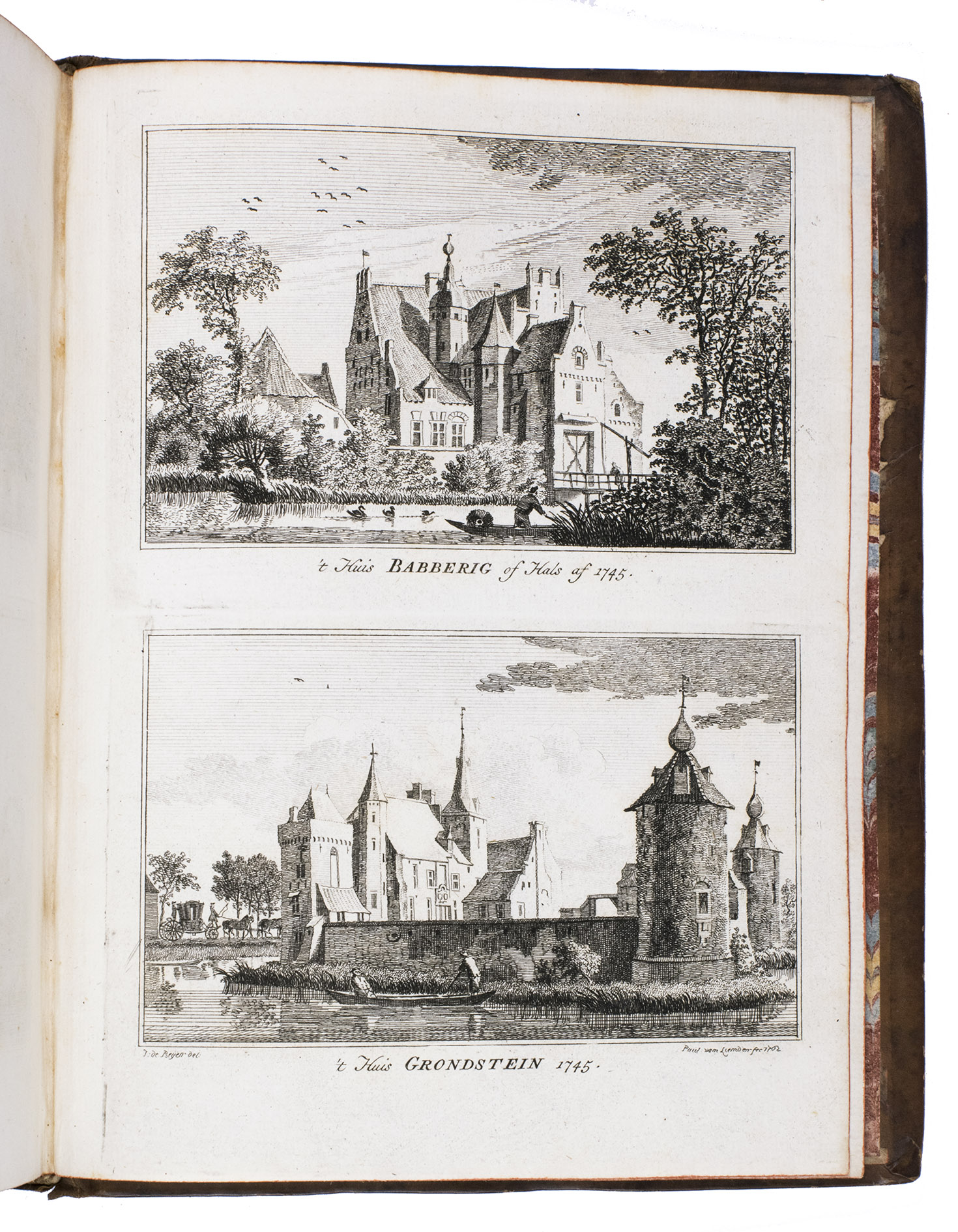 Each volume is dedicated to an individual province or region, but three are dedicated to Utrecht only. After Tirion's death, the original plan to depict every region individually was changed. The work contains plates and views of buildings and scenery in the provinces of Noord-Holland, Gelderland, Rijnland, Delfland, Zuid-Holland, Zeeland, and Utrecht. The 843 beautiful views were made by some of the most famous Dutch artists of the time: Hendrik Spilman, Hendrik de Winter, A. van Swyndrecht, A. van Broekhuizen, Cornelis Pronk, Abraham de Haan, and Jan de Beijer.With a brown paper shelf mark label mounted at the head of the spine of the first volume ("58"). The edges and corners of the boards are somewhat scuffed, the boards are slightly rubbed, lacking a small chip of leather at the foot of the spine of the second volume. Some of the title-pages are browned, but otherwise internally very clean, with only an occasional stain. Overall in very good condition. Ad 1: STCN 204508606 (24 copies, of which 15 incomplete); Tiele 1034; ad 2: STCN 316060445 (2 copies).
