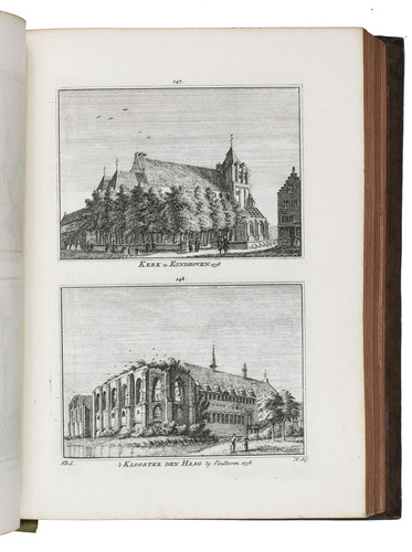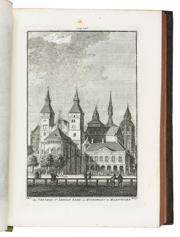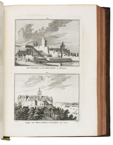 Amsterdam, Isaak Tirion and widow of Isaak Tirion, 1745-1774. 10 parts in 2 volumes. 4to. With 843 engraved views, mostly 2 views per plate, some double page, the title-page of the first part is printed in red and black. With: (2) [IDEM]. Het verheerlykt Kleefschland of kabinet van Kleefsche oudheden en gezichten van steden, dorpen, sloten, adelyke huizen, kerken, torens, poorten; en andere stad- en land-gebouwen in Kleefschland (...) dienende tot een aanhangzel van het verheerlykt Nederland, by I. Tirion uitgegeeven.