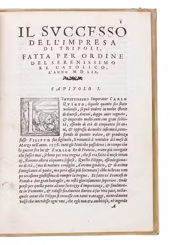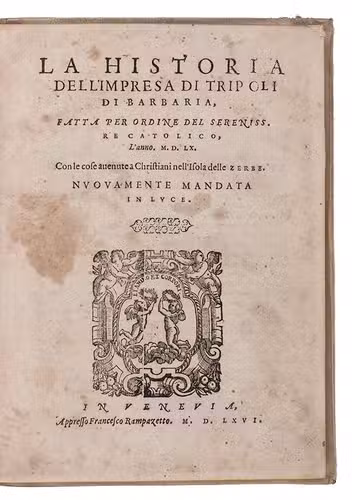 Second edition (first dated), of Alfonso de Ulloa's account of the Siege of Tripoli (1551), the Battle of Djerba (1560) and the Great Siege of Malta (1565): a series of conflicts between a large Christian Mediterranean Alliance and the Islamic Ottoman Empire for control of the Mediterranean.