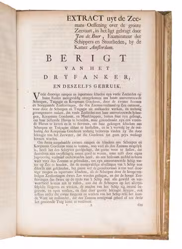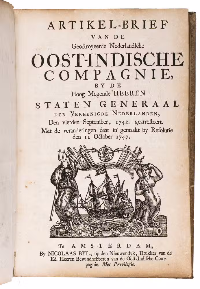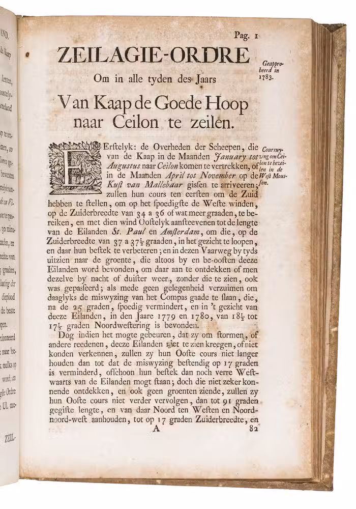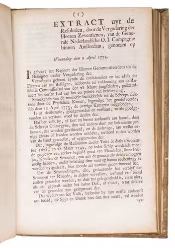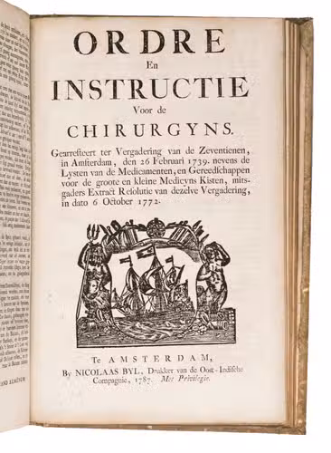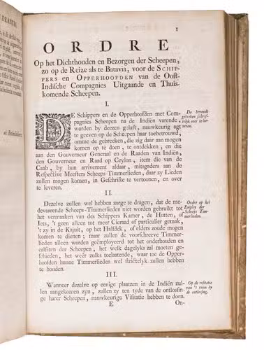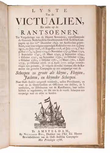 A collection of 23 rare printed works published by the Dutch East India Company (VOC), including orders, resolutions, instructions (including sailing instructions). lists of provisions and other official documents concerning the VOC's shipping and trade in the East Indies, Ceylon (Sri Lanka), India, the Cape and elsewhere. It includes an account of the use of a so-called sea anchor (to stabilize a ship when it cannot anchor to the sea bed), discussions of the problems of dumping oils, tar or other floating materials and an account of nautical firefighting equipment with two woodcut illustrations. The collection gives a very detailed picture of regulations and expectations not only for a ship's crew and officers, but also for its chaplains, physicians, carpenters and others.