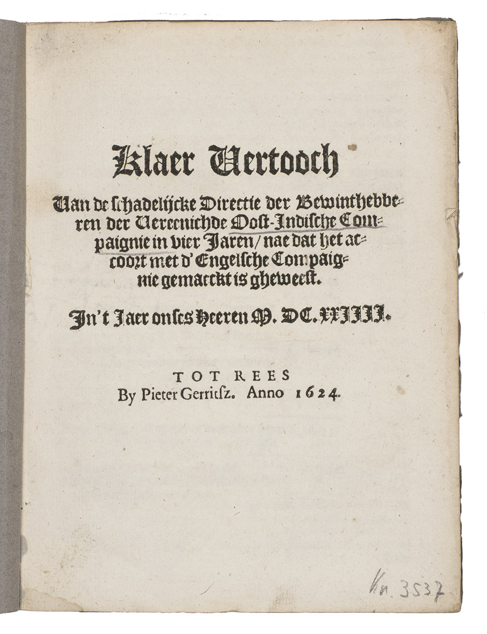 Good condition, small damage of removed label on paper wrapper binding. Asher 83; Knuttel 3537; Landwehr, VOC, 903; E. Laspeyres, Geschichte der volkswirthschaftlichen Anschauungen der Niederländer und ihrer Literatur zur Zeit der Republic, p. 296, No. 56; STCN 860871568; USTC 1033594.