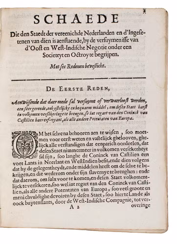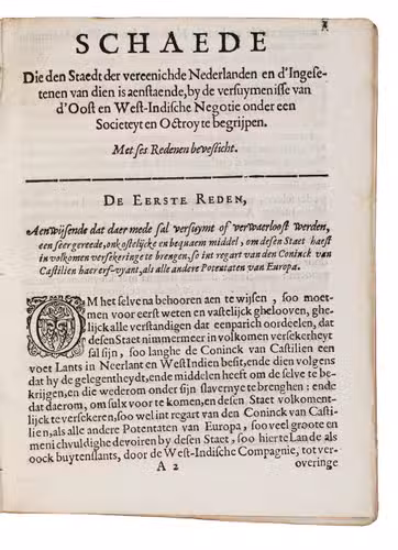 An anonymous pamphlet passionately urging the Dutch East and West India Companies (VOC and WIC) to join forces and form a single united company and lamenting what the author, in the title, describes as the "damage that the state of the United Netherlands and its people have suffered by the failure of the East and West India Companies to negotiate a single charter and company". The author presents six detailed numbered arguments (he calls each a "reden", literally a reason or the grounds) to support his claim, the first with parts numbered I-XX. The proposed merger of the two companies never took place. Arguments one (part X) to four explicitly refer to the trade in or conquest of Brazil in general (it was in Dutch hands from 1630 to 1654) and the first to Pernambuco in particular, and nearly all refer to the West Indies (a term that at this time included Brazil).