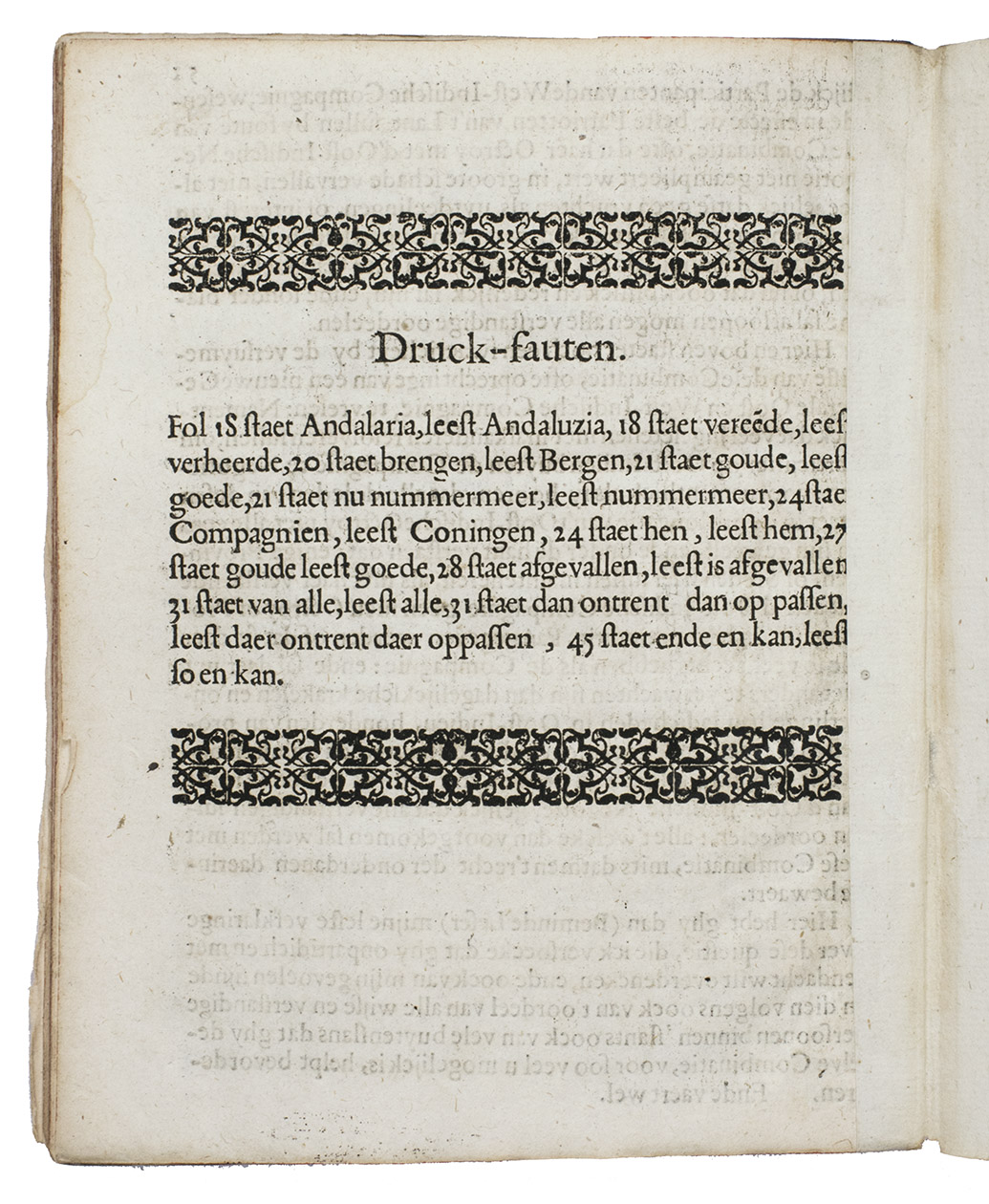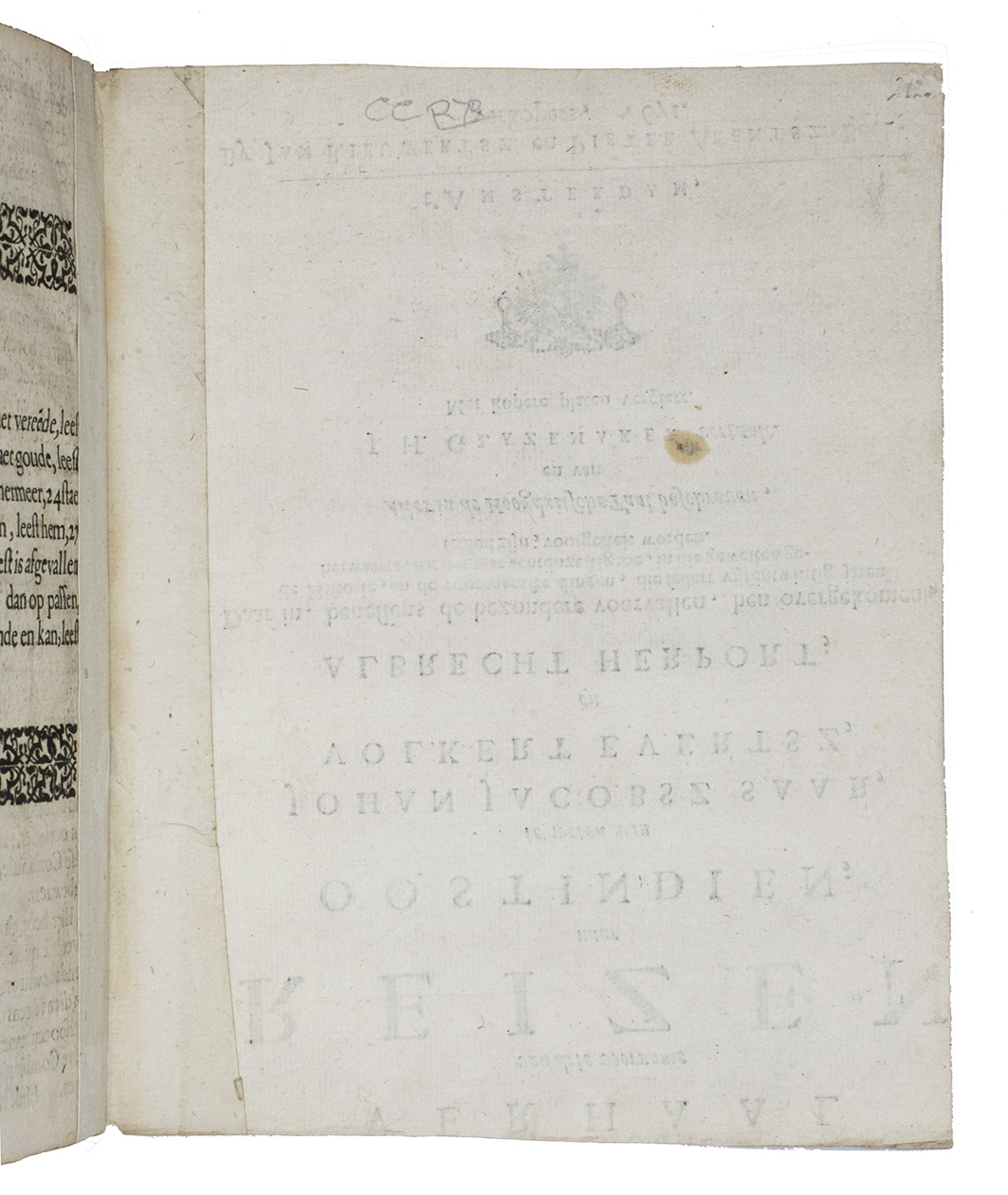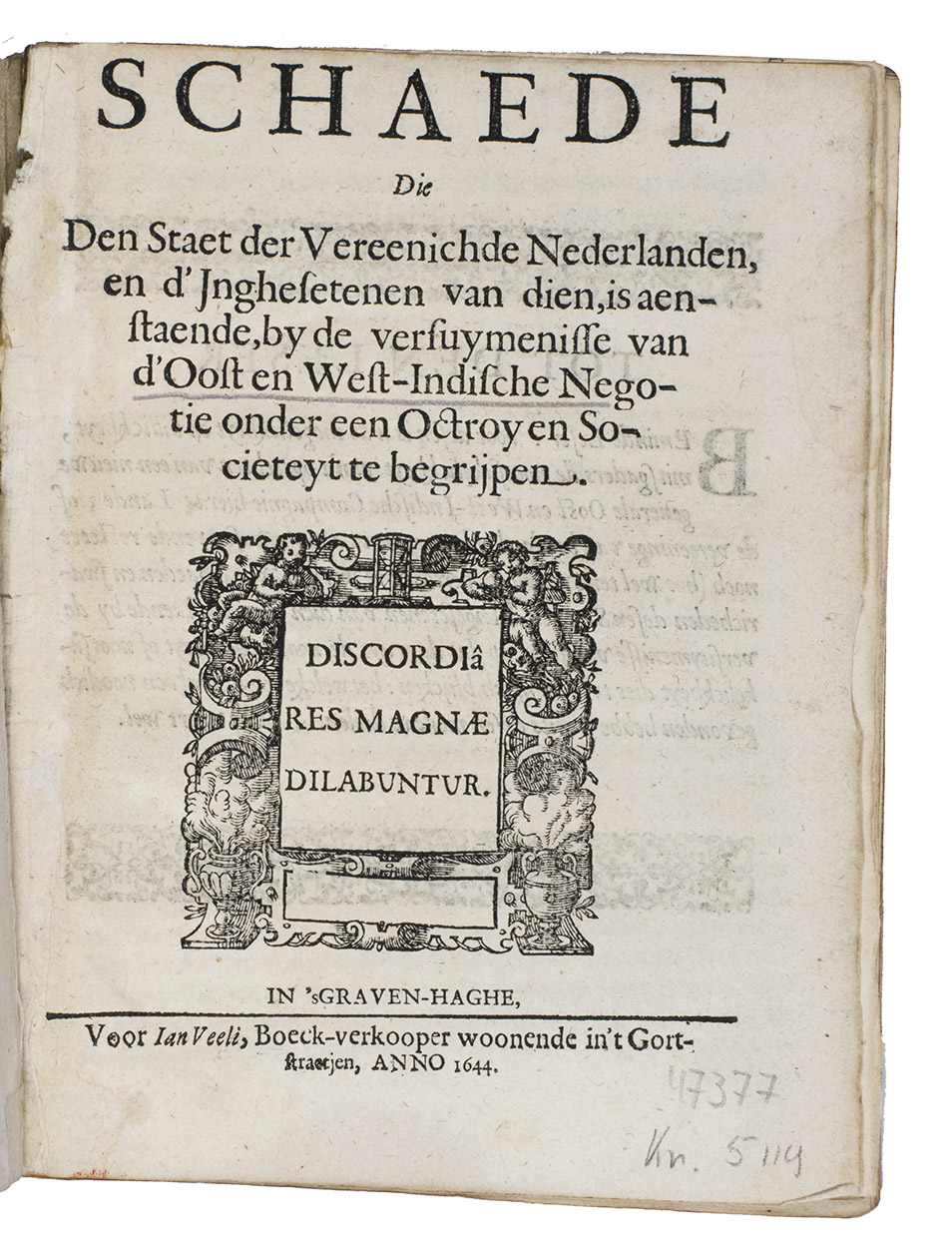 Curiously, the back paste-down is made from a discarded title-page from Verhaal van drie voorname reizen naar Oostindien (Amsterdam, 1671) while four of the six copies known to the STCN lack the title-page. With the gutter margin of the title-page damaged, some minor stains and part of the paper covering the spine lost. A passionate plea for the formation of a united Dutch East and West India Company, giving detailed arguments based on circumstances in Brazil and other lands where they operated. Alden & Landis 644/139 (5 copies); Asher 191; James Ford Bell Library, S121; Knuttel 5119; Landwehr, VOC 62 (2 copies); Sabin 77475; STCN 852673019 (8 copies); Tiele/Muller 2934; not in Borba de Moraes; JCB.