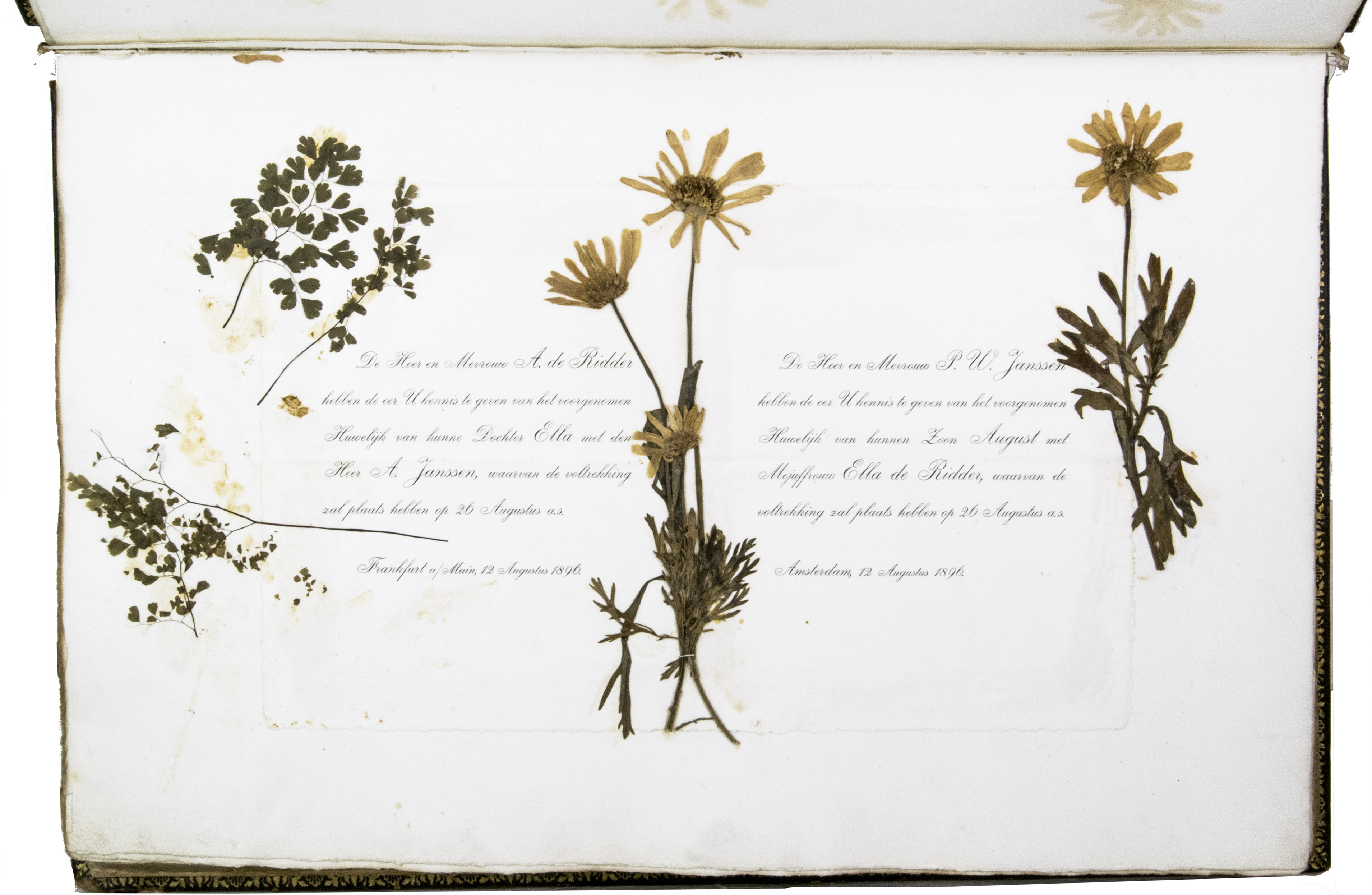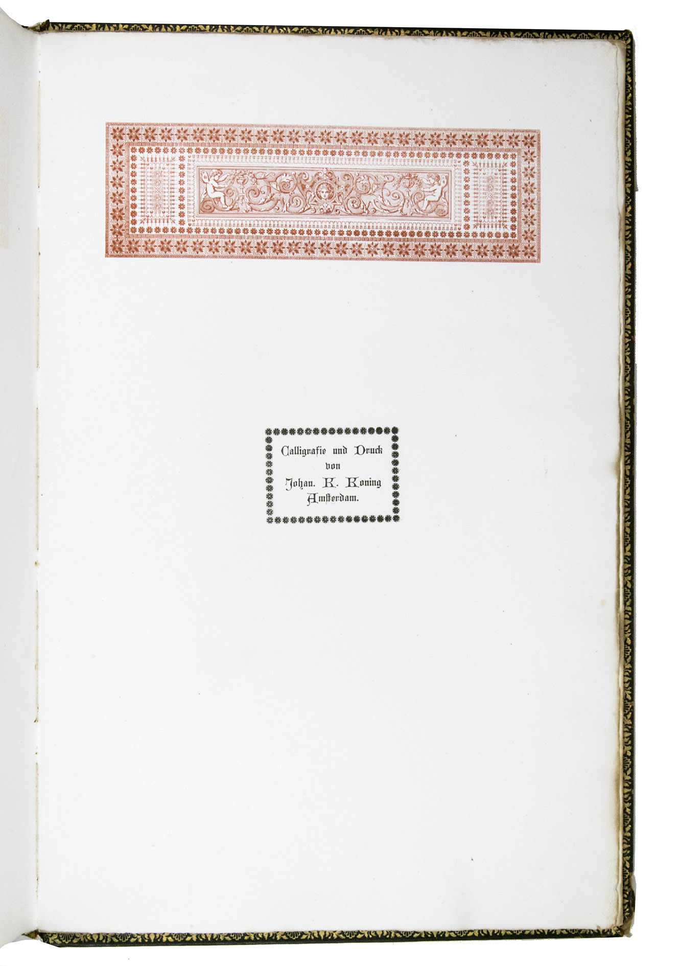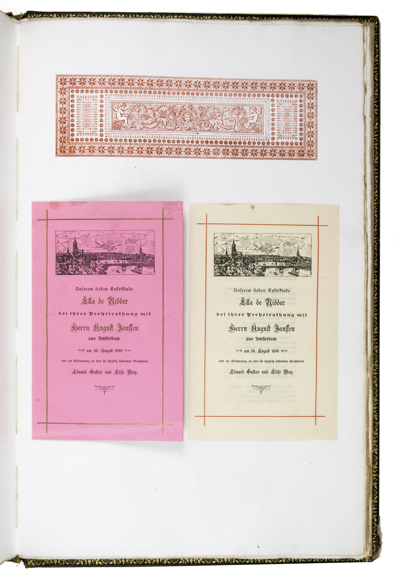 A unique wedding album of two members of prominent German-Dutch business families, written and printed in 1896 as a special single copy publication. The album was produced in Amsterdam by Johan K. Koning, who took care of the calligraphy of the texts and the printing of the (divisonal) titles, explanatory leaves and vignettes.