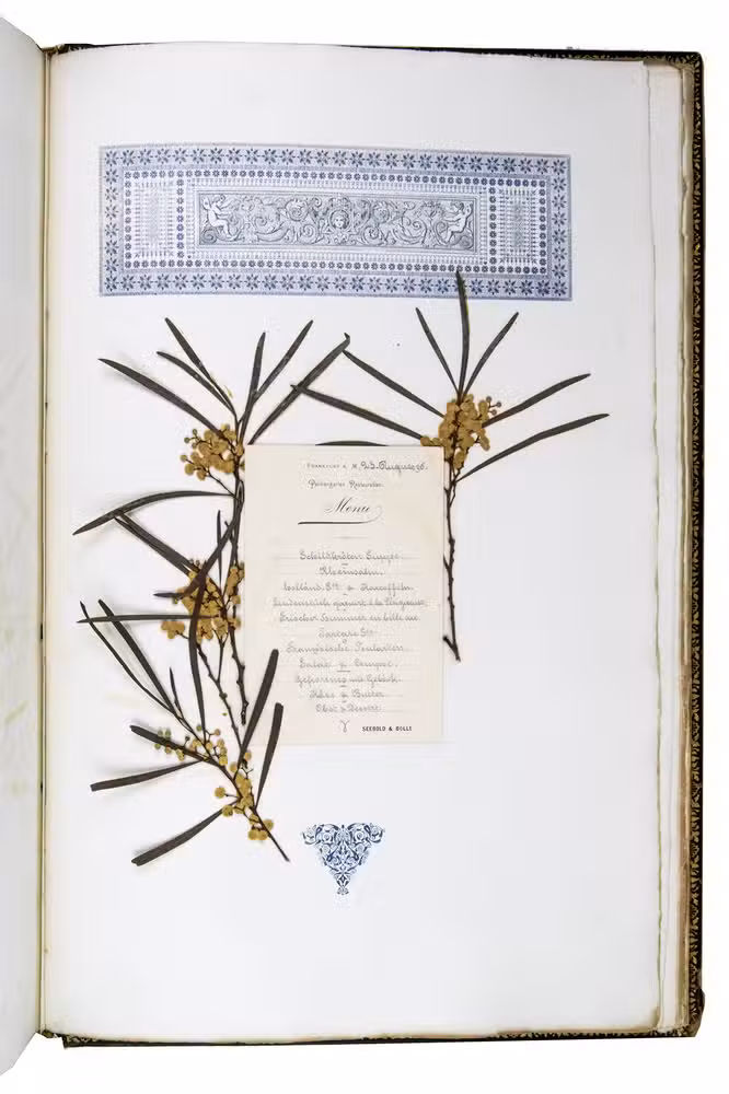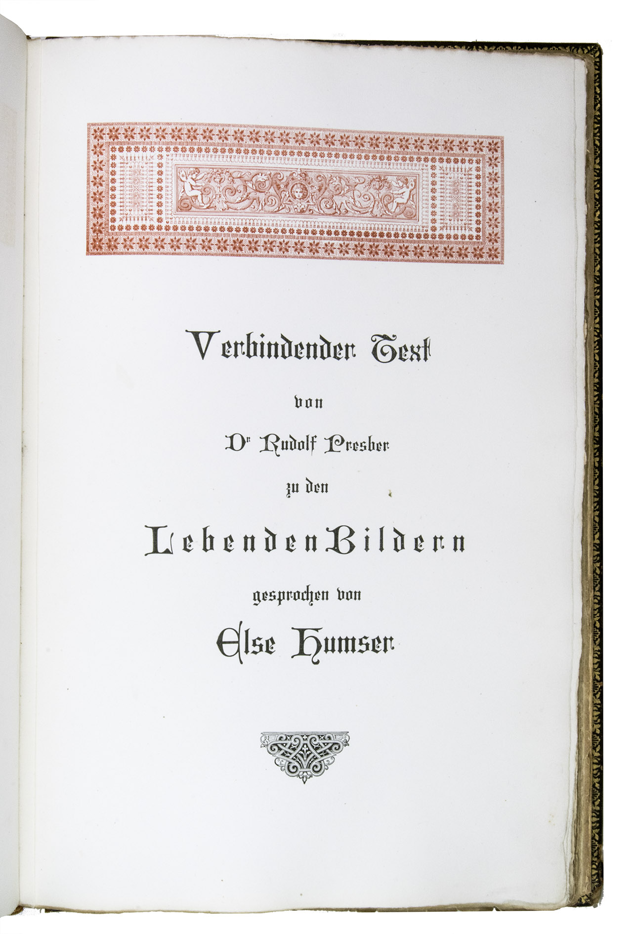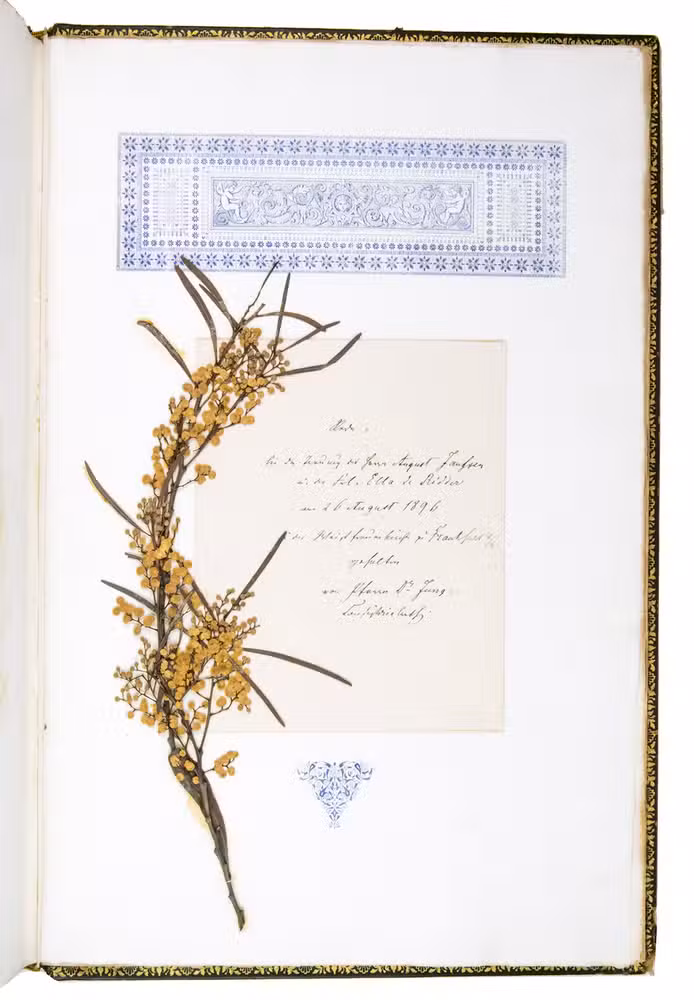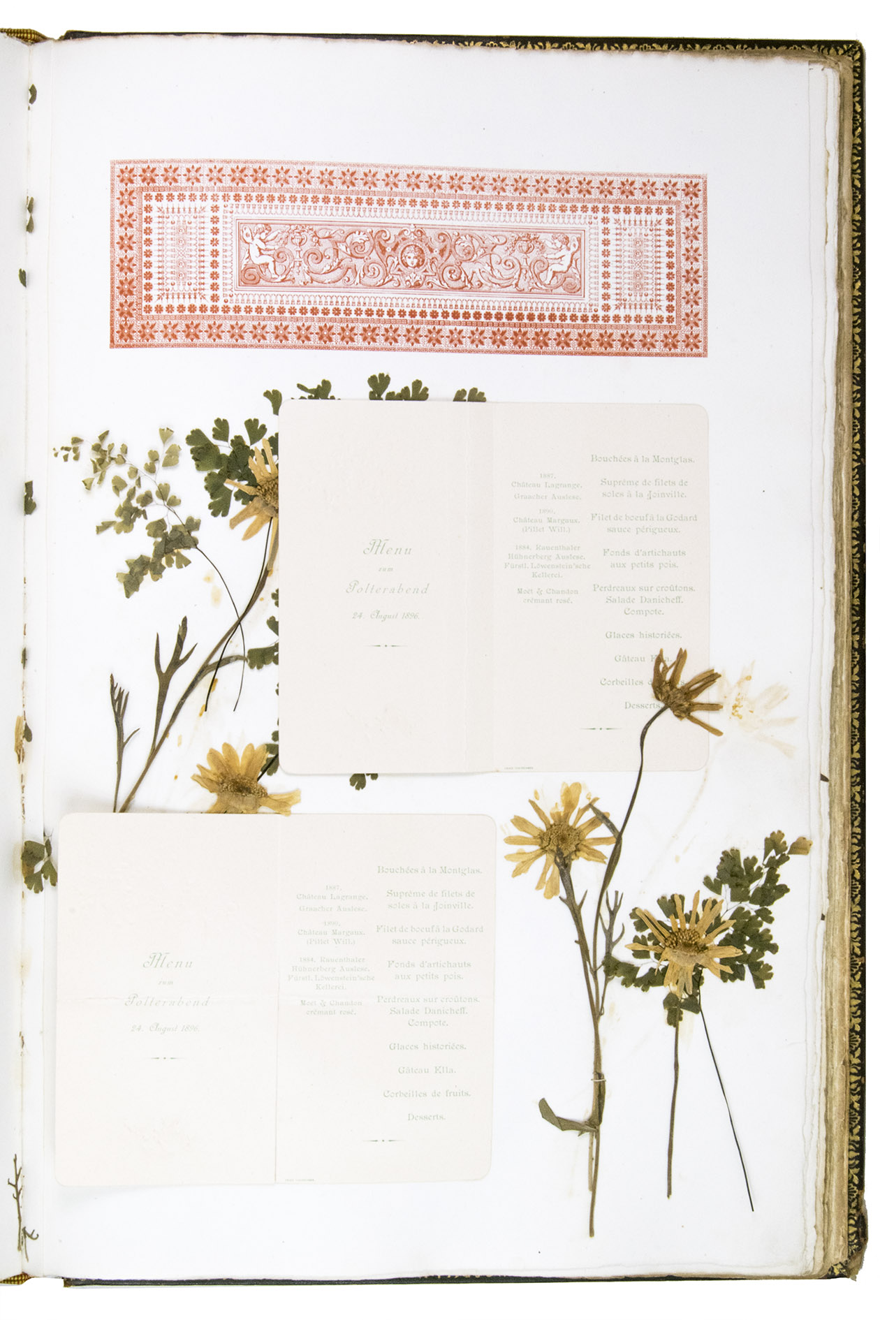 A unique wedding album of two members of prominent German-Dutch business families, written and printed in 1896 as a special single copy publication. The album was produced in Amsterdam by Johan K. Koning, who took care of the calligraphy of the texts and the printing of the (divisonal) titles, explanatory leaves and vignettes.