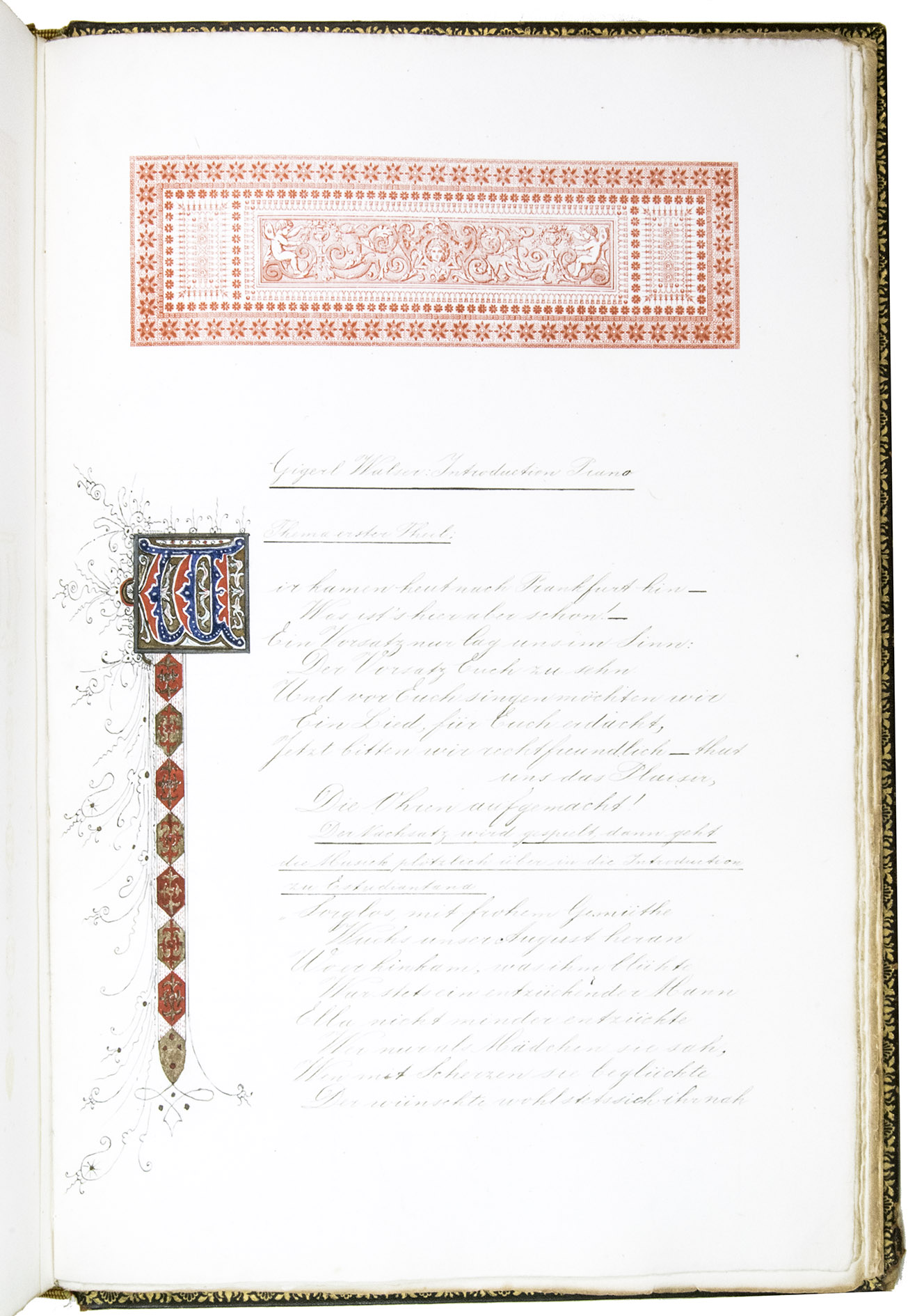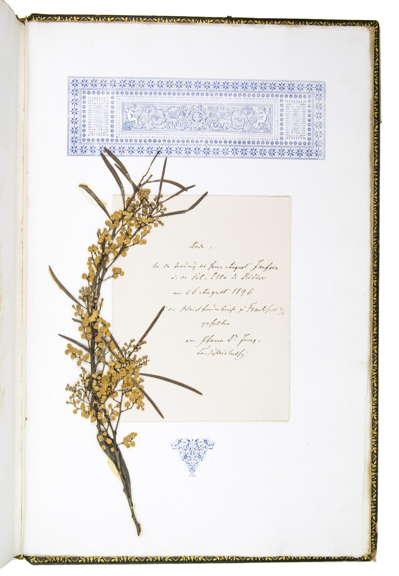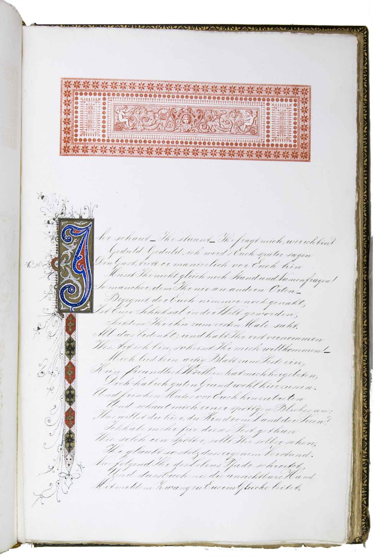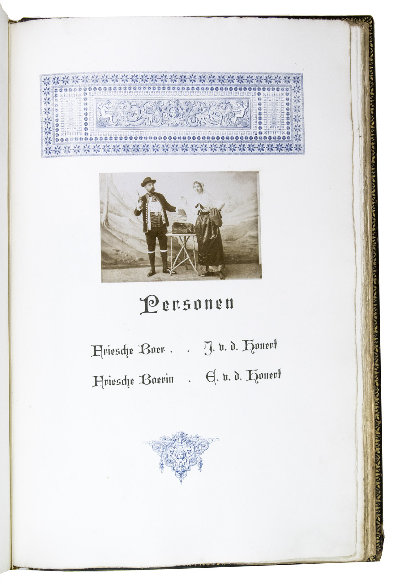 (Colophon:) Amsterdam, Calligrafie und Druck von Johan. K. Koning, [1896]. Large folio (ca. 51 x 33 cm). Wedding album comprising five manuscript texts of occasional plays (4 in German, 1 in Dutch), written in a neat cursive in blank ink on thick laid paper, each illuminated with a 4-line decorated initial in red, blue and white on a gold/bronze field, richly decorated with penwork in black ink (extending down into the inner margin). Each text is preceded by a letterpress title leaf set in neo-Gothic type, also used for the general title, several text leaves, and the colophon. Further with 1 gouache illustration on grey paper (sheet size ca. 32 x 24.5 cm, mounted on the first leaf) showing a bouquet of flowers, 14 printed ephemera relating to the "Polterabend" (wedding-eve party) and the wedding on single or double leaves in various sizes (the wedding announcement/introduction to the wedding-eve party and attached is a photo of the couple in a circular frame of red wax, 5 menu cards, the lyrics to 6 German songs, a musical score by the German composer Wilhelm Aletter (1867-1934), and an announcement of the comic opera Des Teufels Antheil by the French composer Daniel Auber (1782-1871), performed by the Frankfurter Opernhaus on 25 August 1896 in Frankfurt am Main. Also with two manuscript wedding speeches in German, written in black ink on paper, two mounted albumen prints, the first showing two actors dressed as a Frisian farmer and his wife and the other showing a man in Chinese dress, 56 large ornamental vignettes printed in red or blue throughout, 17 ornamental tailpieces printed in black, blue, and red, and some dried flowers mounted on several leaves. Contemporary gold-tooled burgundy leather, the front board with a large gold-stamped monogram as a centrepiece (the intertwined initials of the couple: AJ and EdR) with the date ("24-26 August") above and the year ("1896") below lettered in gold, both boards show a single fillet frame along the outer edges, gold-tooled turn-ins, beige watered silk endleaves. [60] ll.