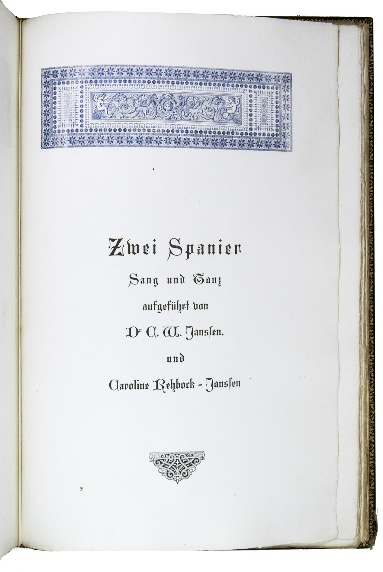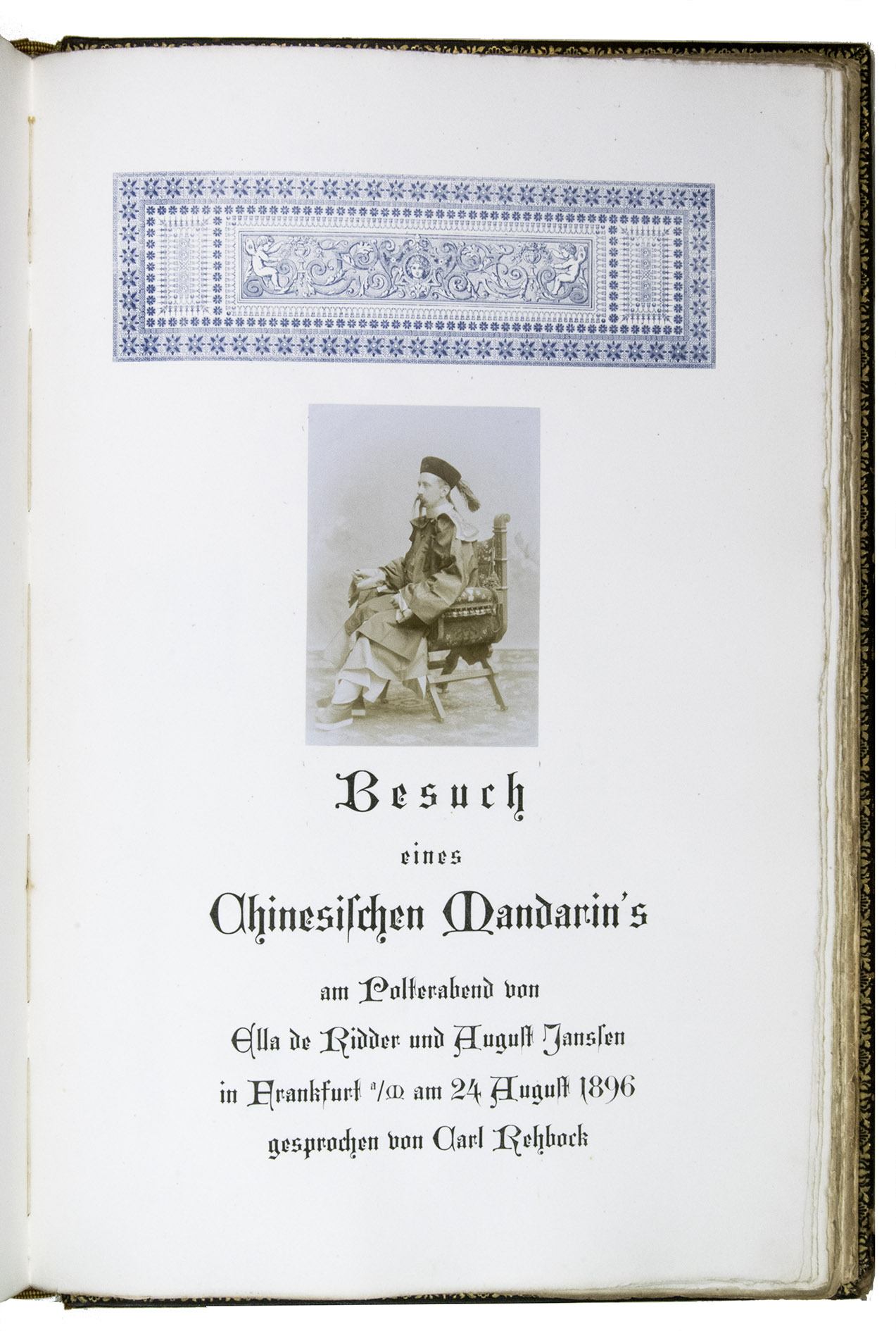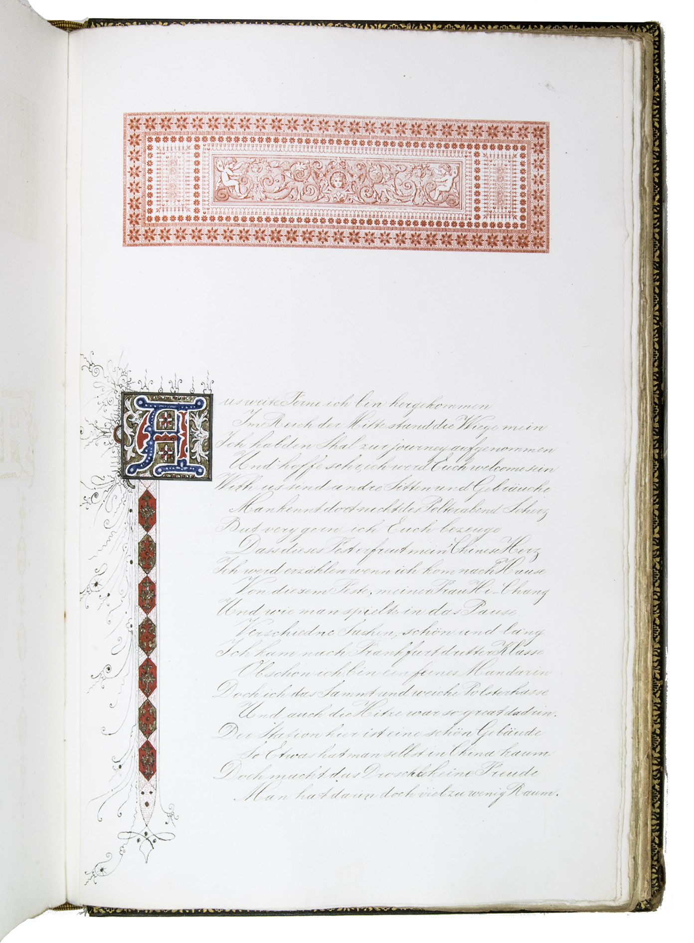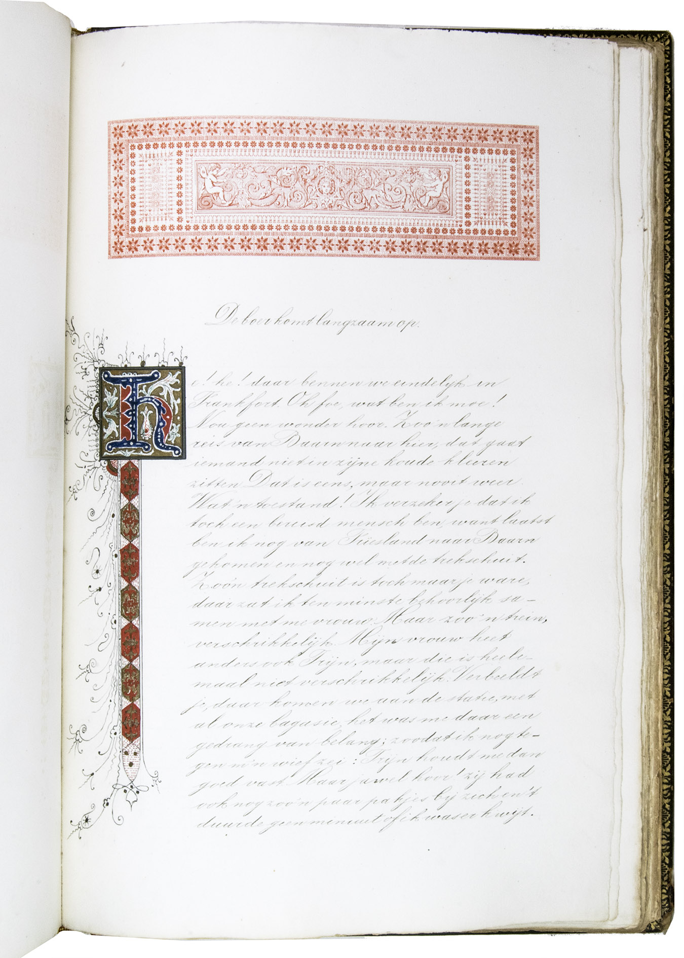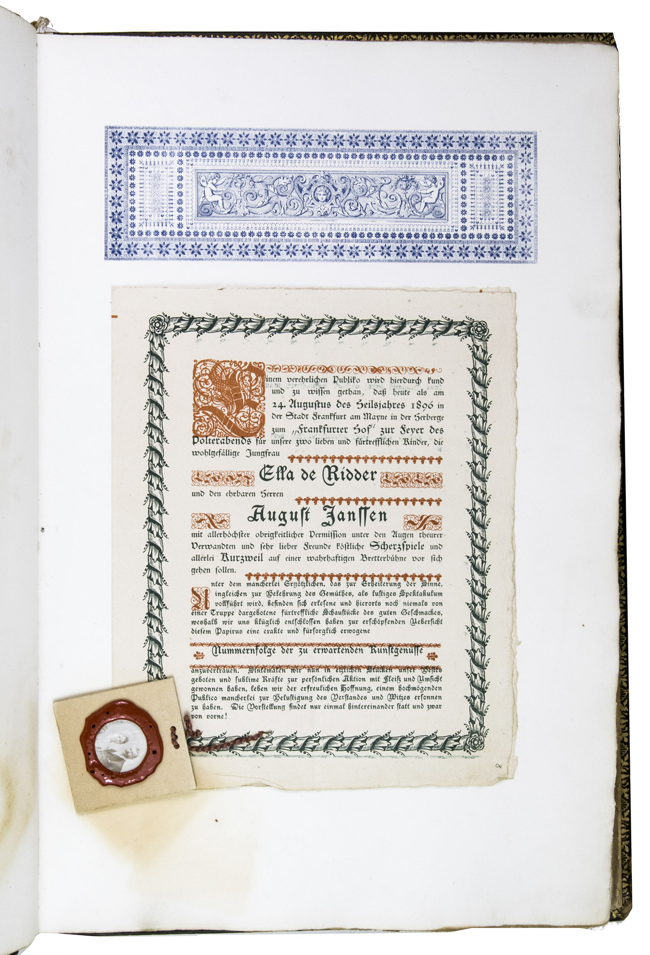 (Colophon:) Amsterdam, Calligrafie und Druck von Johan. K. Koning, [1896]. Large folio (ca. 51 x 33 cm). Wedding album comprising five manuscript texts of occasional plays (4 in German, 1 in Dutch), written in a neat cursive in blank ink on thick laid paper, each illuminated with a 4-line decorated initial in red, blue and white on a gold/bronze field, richly decorated with penwork in black ink (extending down into the inner margin). Each text is preceded by a letterpress title leaf set in neo-Gothic type, also used for the general title, several text leaves, and the colophon. Further with 1 gouache illustration on grey paper (sheet size ca. 32 x 24.5 cm, mounted on the first leaf) showing a bouquet of flowers, 14 printed ephemera relating to the "Polterabend" (wedding-eve party) and the wedding on single or double leaves in various sizes (the wedding announcement/introduction to the wedding-eve party and attached is a photo of the couple in a circular frame of red wax, 5 menu cards, the lyrics to 6 German songs, a musical score by the German composer Wilhelm Aletter (1867-1934), and an announcement of the comic opera Des Teufels Antheil by the French composer Daniel Auber (1782-1871), performed by the Frankfurter Opernhaus on 25 August 1896 in Frankfurt am Main. Also with two manuscript wedding speeches in German, written in black ink on paper, two mounted albumen prints, the first showing two actors dressed as a Frisian farmer and his wife and the other showing a man in Chinese dress, 56 large ornamental vignettes printed in red or blue throughout, 17 ornamental tailpieces printed in black, blue, and red, and some dried flowers mounted on several leaves. Contemporary gold-tooled burgundy leather, the front board with a large gold-stamped monogram as a centrepiece (the intertwined initials of the couple: AJ and EdR) with the date ("24-26 August") above and the year ("1896") below lettered in gold, both boards show a single fillet frame along the outer edges, gold-tooled turn-ins, beige watered silk endleaves. [60] ll.