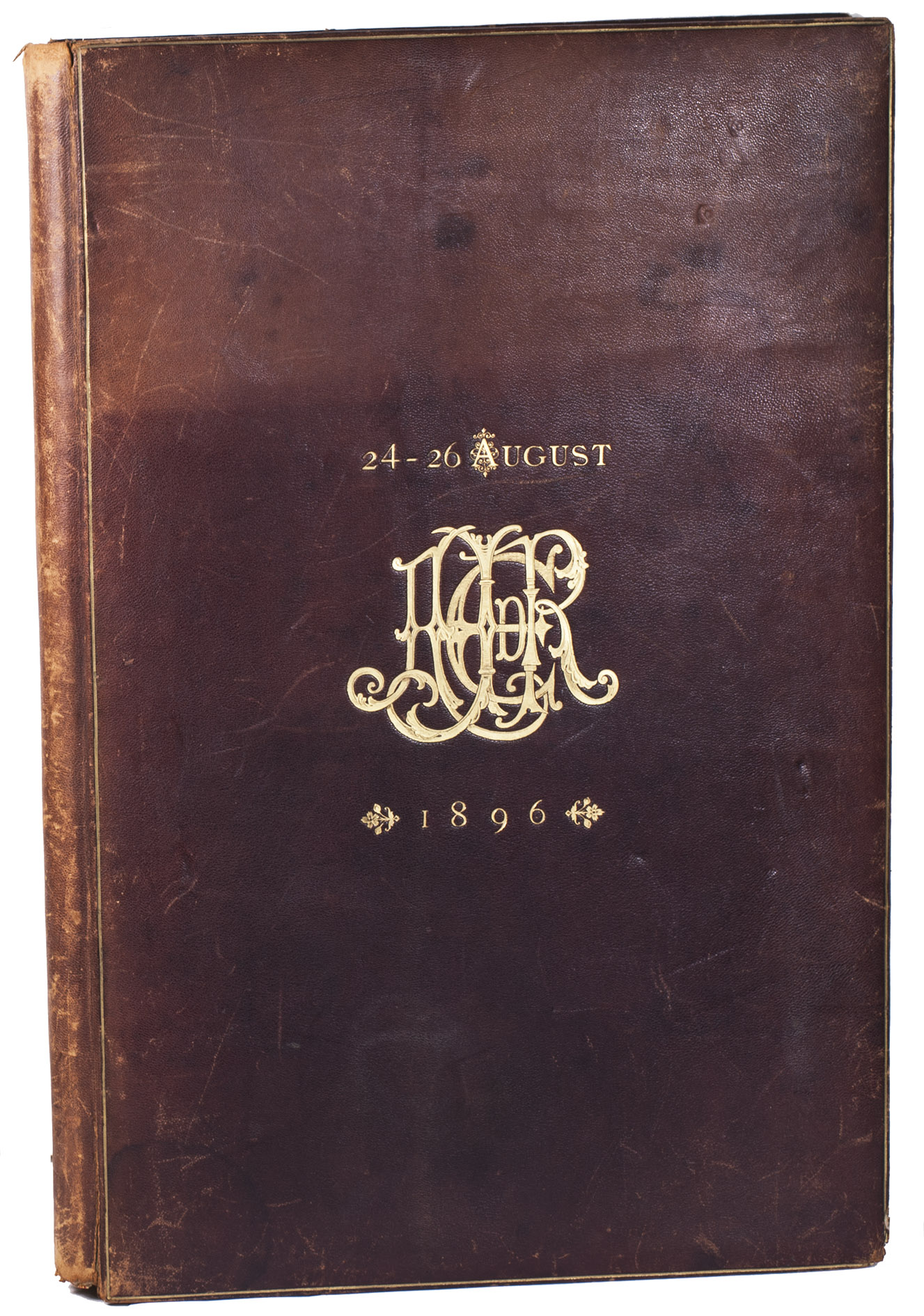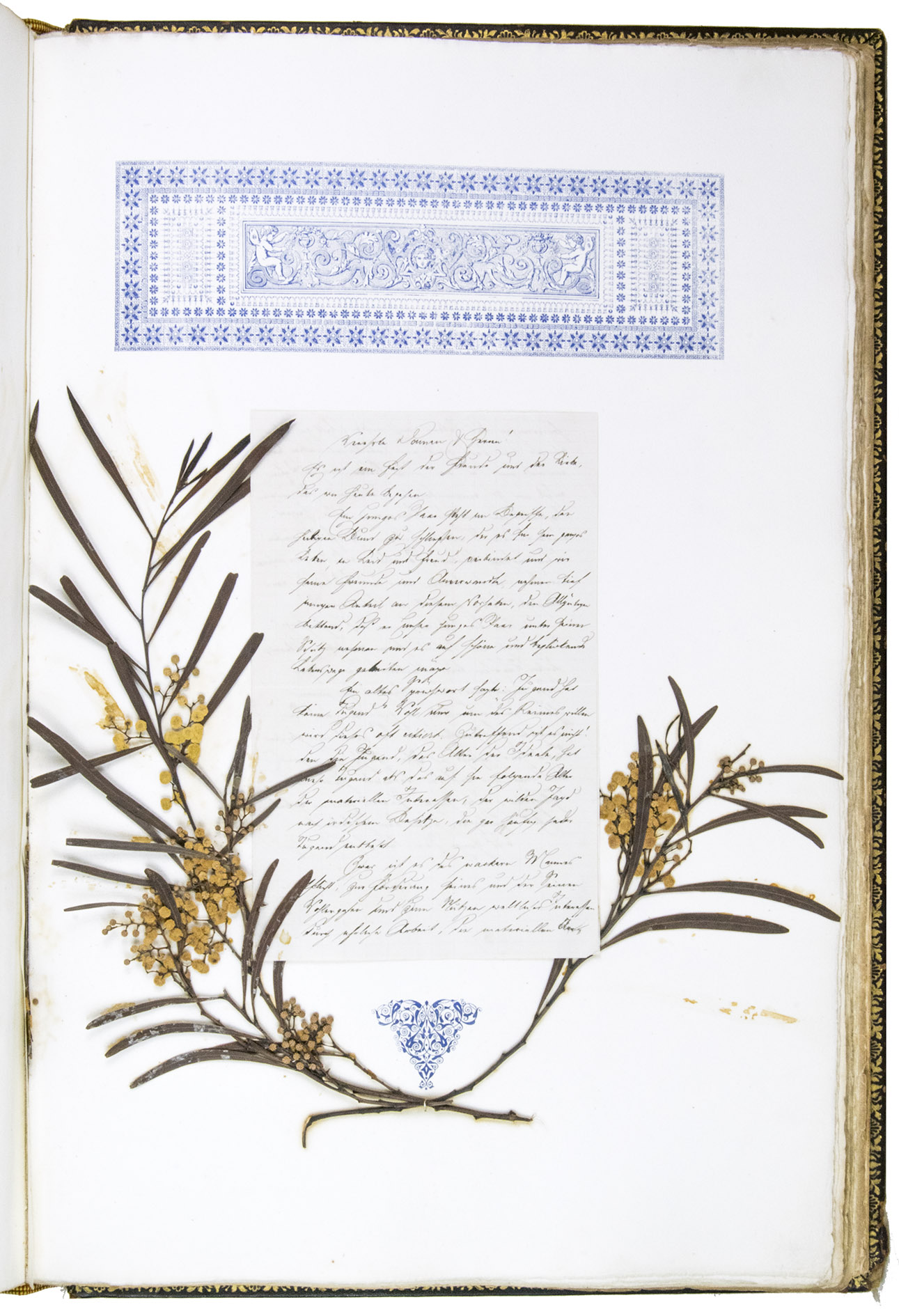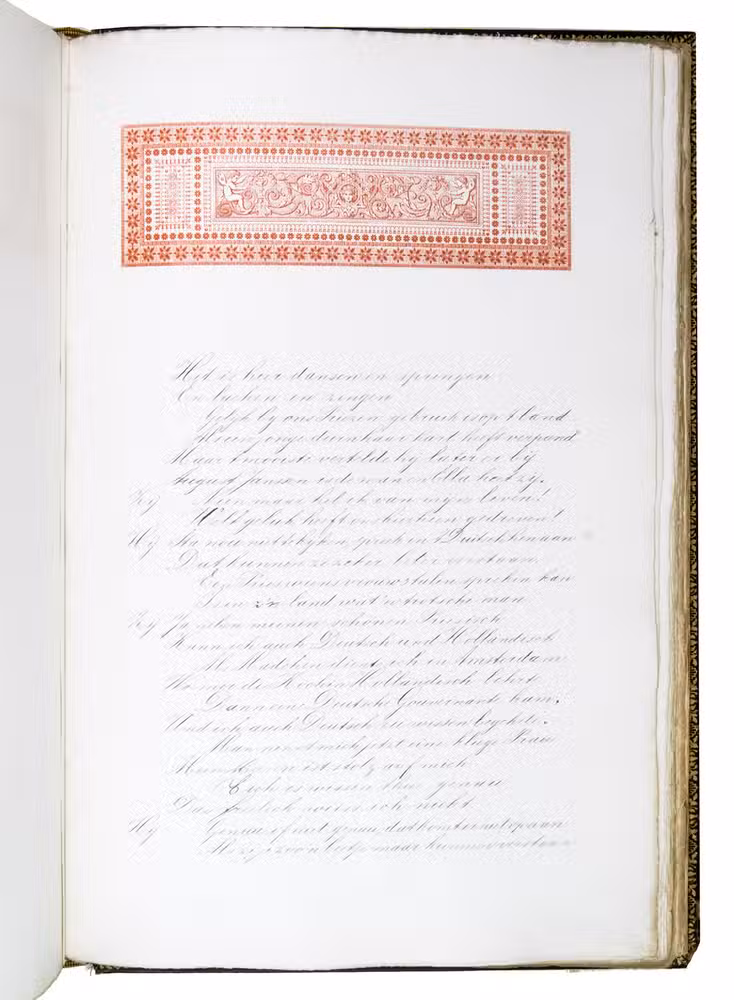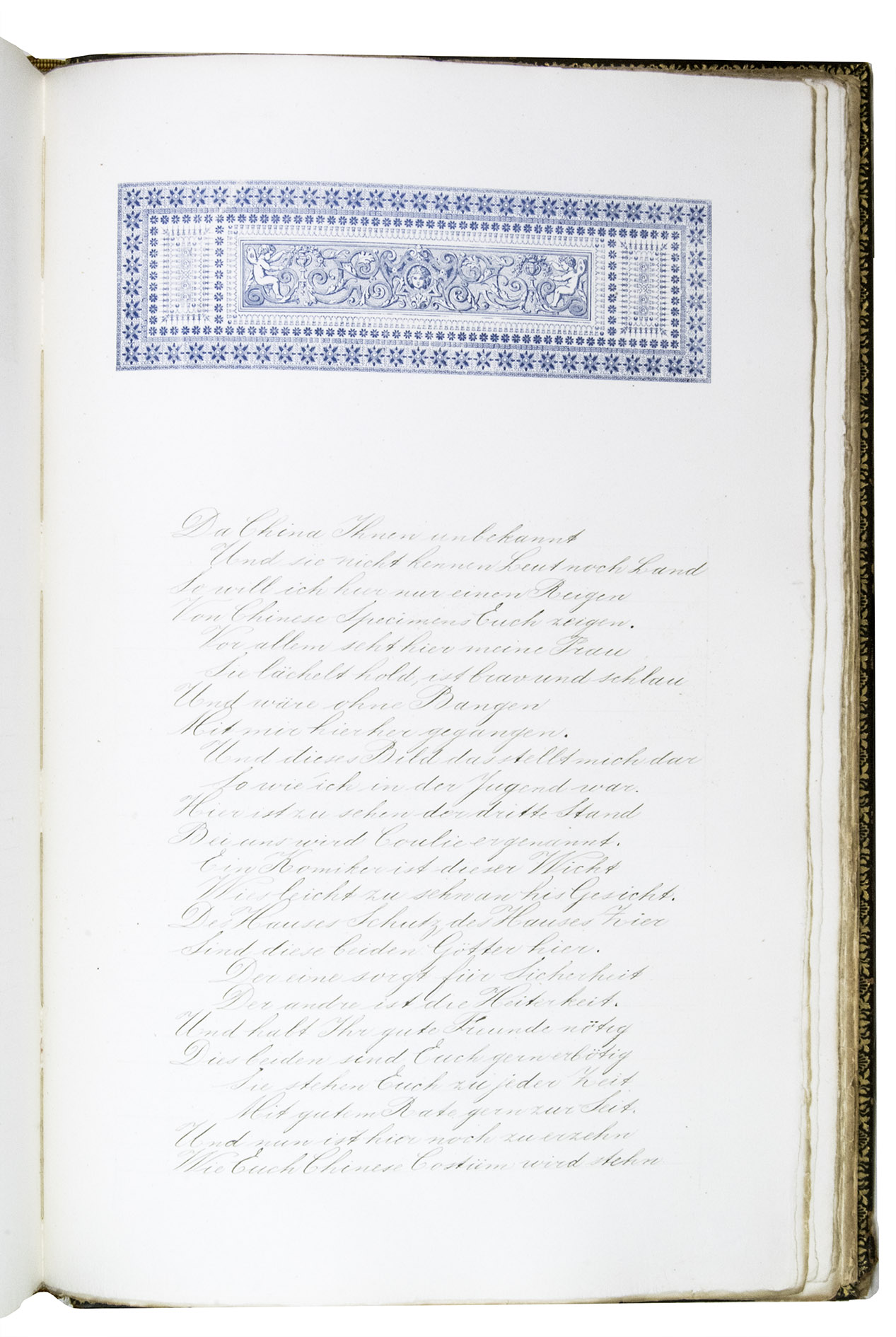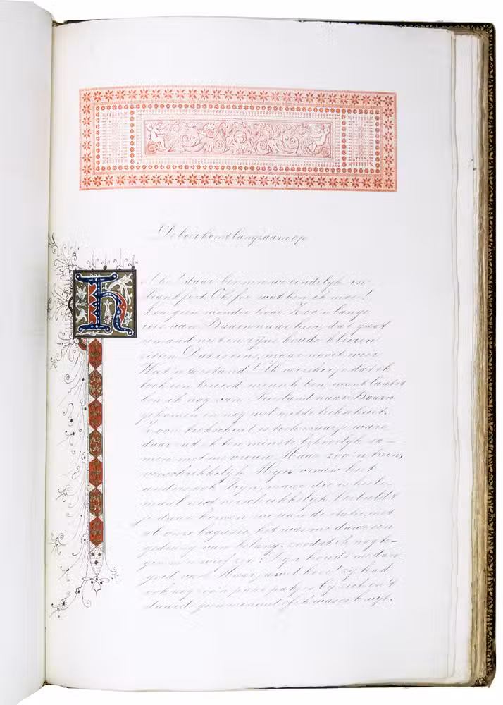 (Colophon:) Amsterdam, Calligrafie und Druck von Johan. K. Koning, [1896]. Large folio (ca. 51 x 33 cm). Wedding album comprising five manuscript texts of occasional plays (4 in German, 1 in Dutch), written in a neat cursive in blank ink on thick laid paper, each illuminated with a 4-line decorated initial in red, blue and white on a gold/bronze field, richly decorated with penwork in black ink (extending down into the inner margin). Each text is preceded by a letterpress title leaf set in neo-Gothic type, also used for the general title, several text leaves, and the colophon. Further with 1 gouache illustration on grey paper (sheet size ca. 32 x 24.5 cm, mounted on the first leaf) showing a bouquet of flowers, 14 printed ephemera relating to the "Polterabend" (wedding-eve party) and the wedding on single or double leaves in various sizes (the wedding announcement/introduction to the wedding-eve party and attached is a photo of the couple in a circular frame of red wax, 5 menu cards, the lyrics to 6 German songs, a musical score by the German composer Wilhelm Aletter (1867-1934), and an announcement of the comic opera Des Teufels Antheil by the French composer Daniel Auber (1782-1871), performed by the Frankfurter Opernhaus on 25 August 1896 in Frankfurt am Main. Also with two manuscript wedding speeches in German, written in black ink on paper, two mounted albumen prints, the first showing two actors dressed as a Frisian farmer and his wife and the other showing a man in Chinese dress, 56 large ornamental vignettes printed in red or blue throughout, 17 ornamental tailpieces printed in black, blue, and red, and some dried flowers mounted on several leaves. Contemporary gold-tooled burgundy leather, the front board with a large gold-stamped monogram as a centrepiece (the intertwined initials of the couple: AJ and EdR) with the date ("24-26 August") above and the year ("1896") below lettered in gold, both boards show a single fillet frame along the outer edges, gold-tooled turn-ins, beige watered silk endleaves. [60] ll.