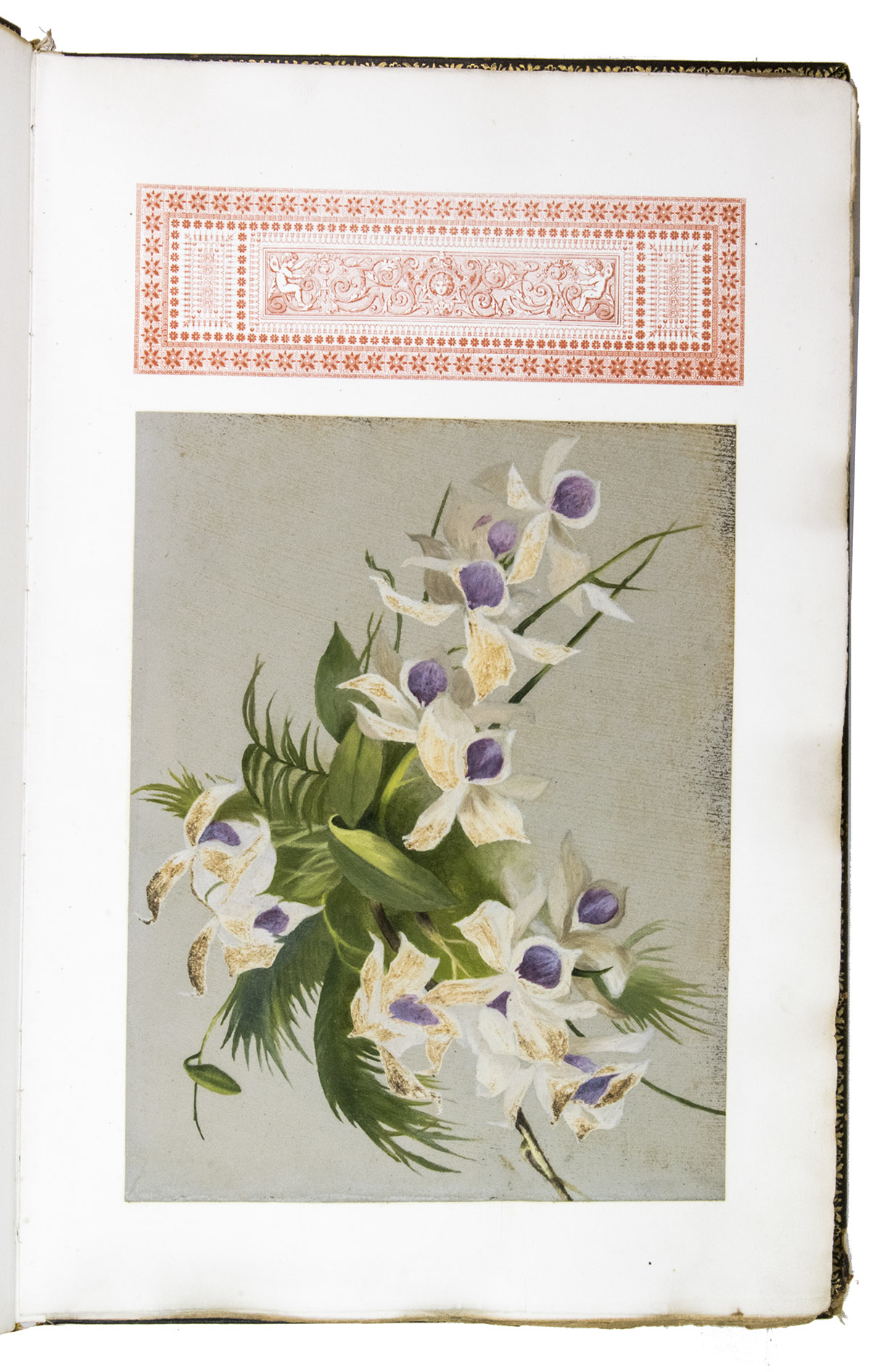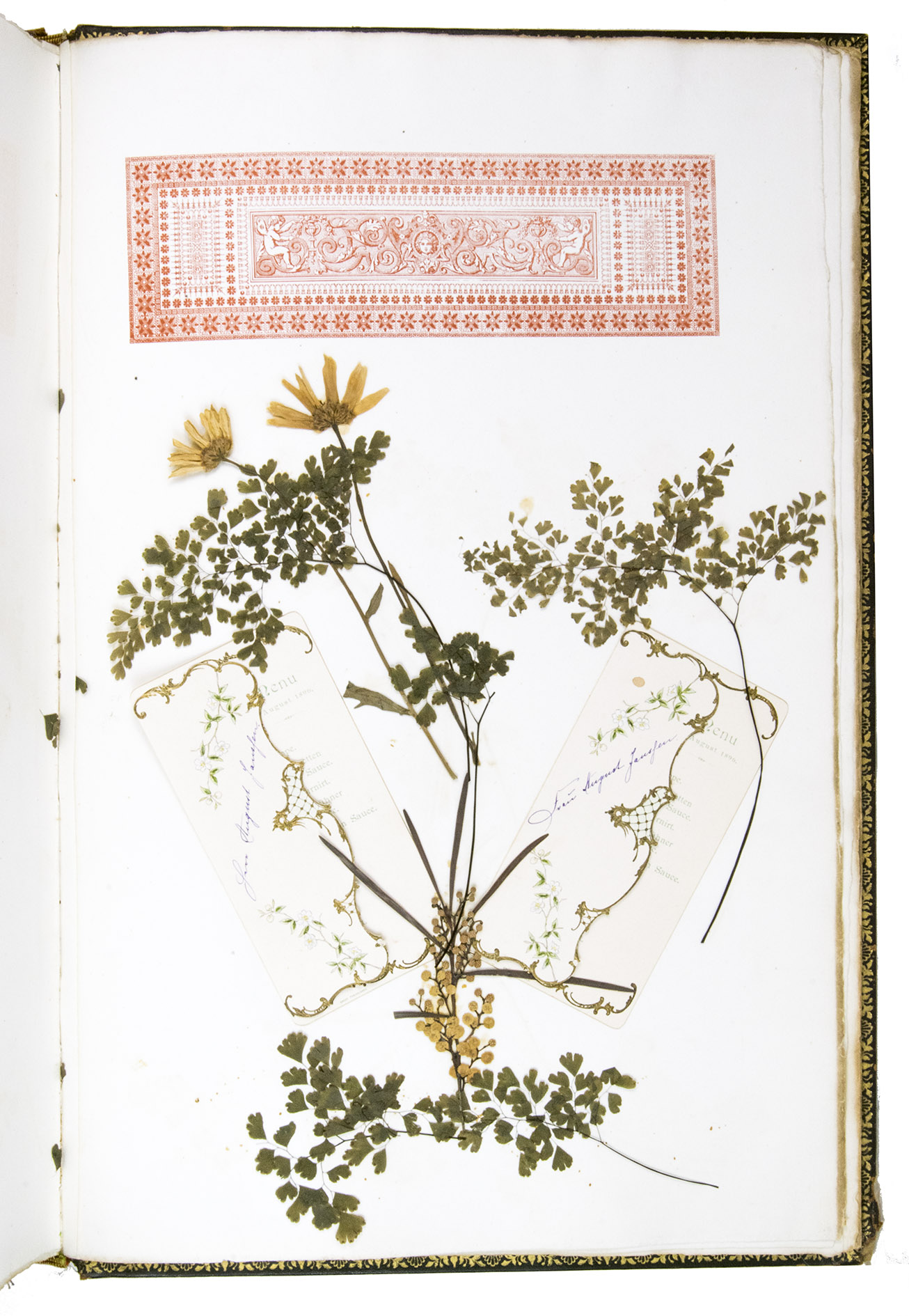 The spine and edges and corners of the boards show signs of wear with some minor loss of material at the foot of the sipne and the tips of the corners of the boards, the leather is somewhat faded adn scratched, all without affecting the general clarity of the tooling or the integrity of the binding. The watered silk on the first free flyleaf is torn, some offsetting to the blank versos of the leaves, and some glue residue on the leaves with dried flowers. Otherwise in good condition.