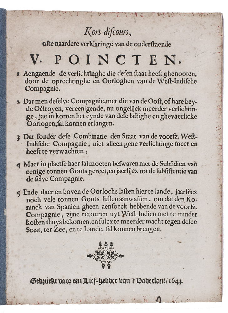 Kort discours, ofte naardere verklaringe van de onderstaende V. poincten, 1 aengaende de verlichtinghe die desen staat heeft ghenooten door de oprechtinghe en oorloghen van de West-Indische Compagnie. ...