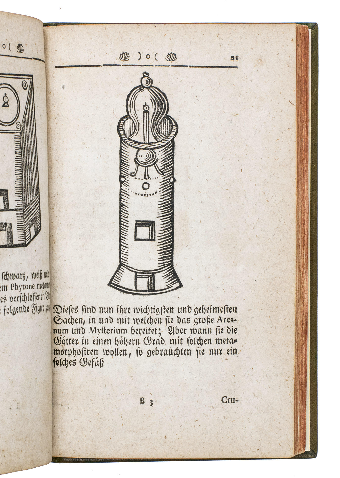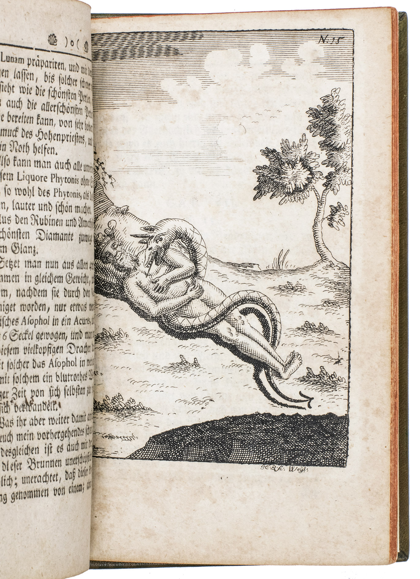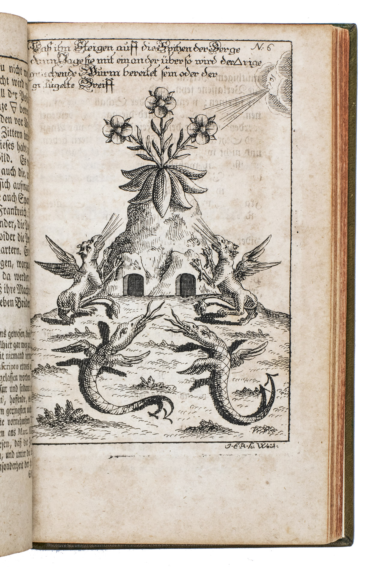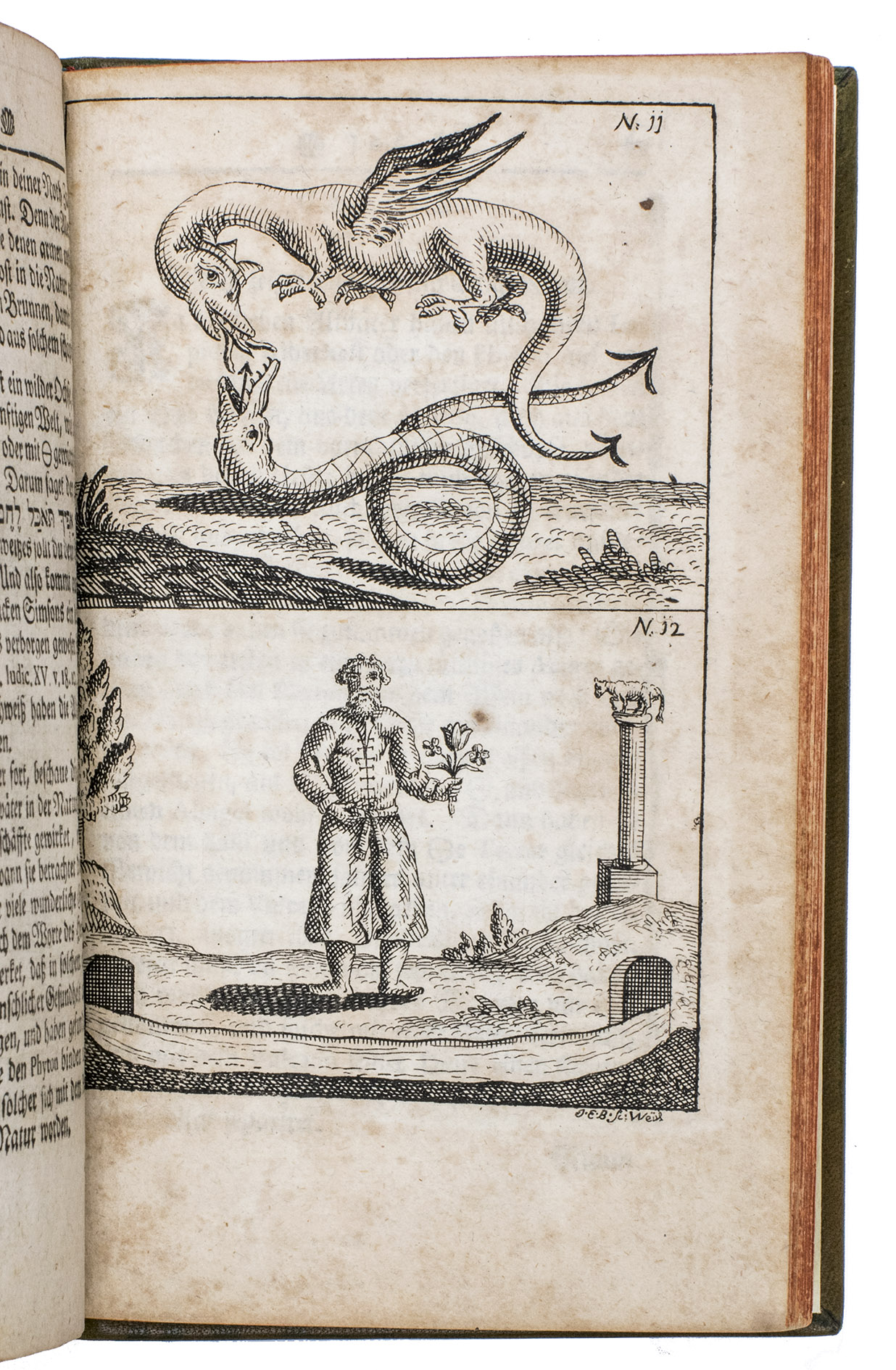 Leipzig, Lankischens Buchhandlung, 1760. 2 parts in 1 volume. 8vo. With an engraved frontispiece, 15 numbered full-page engravings, numerous woodcut illustrations in the text, woodcut decorated initials, and woodcut head- and tailpieces at the beginning and end of each part. Modern silver- and blind-tooled greenish-brown leather with a red morocco title label lettered in silver on the spine, red edges. [1], [1 blank], [26], 122, [14], [1], [1 blank], [10]; [1], [1 blank], 104, [12] pp.