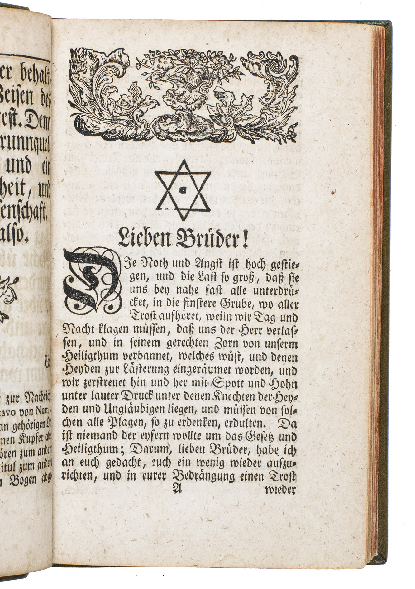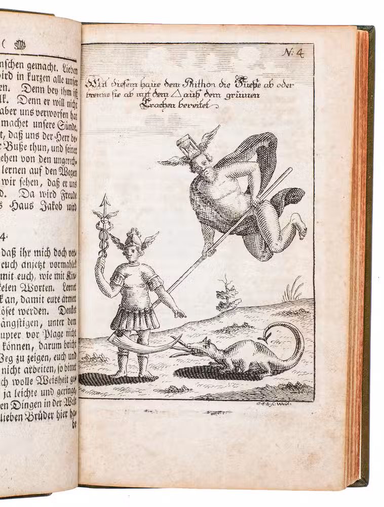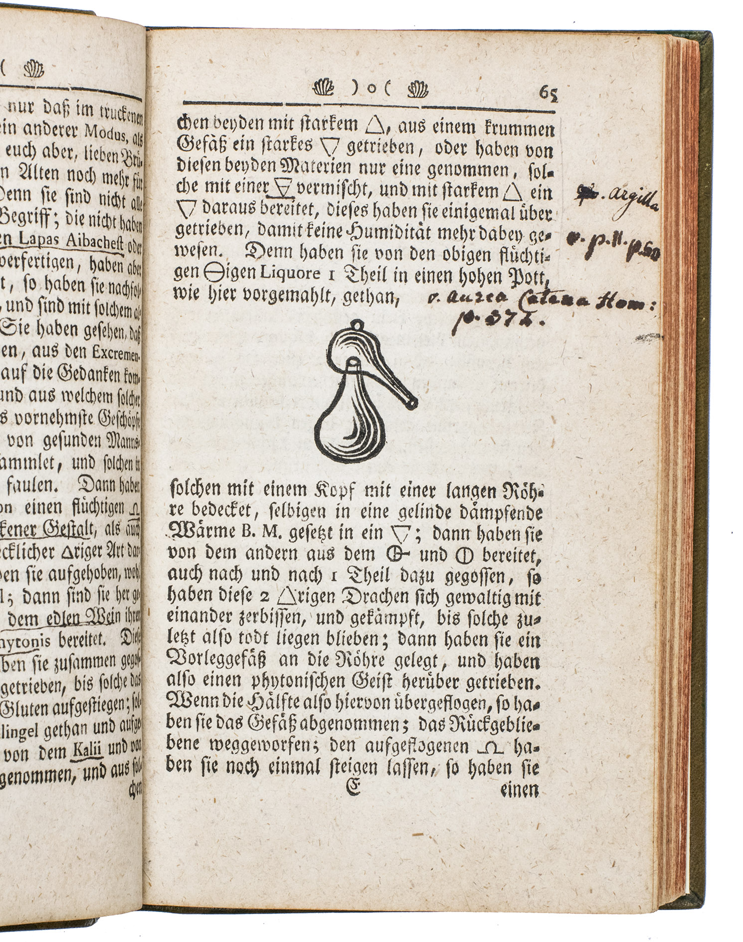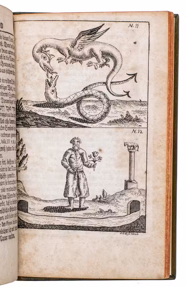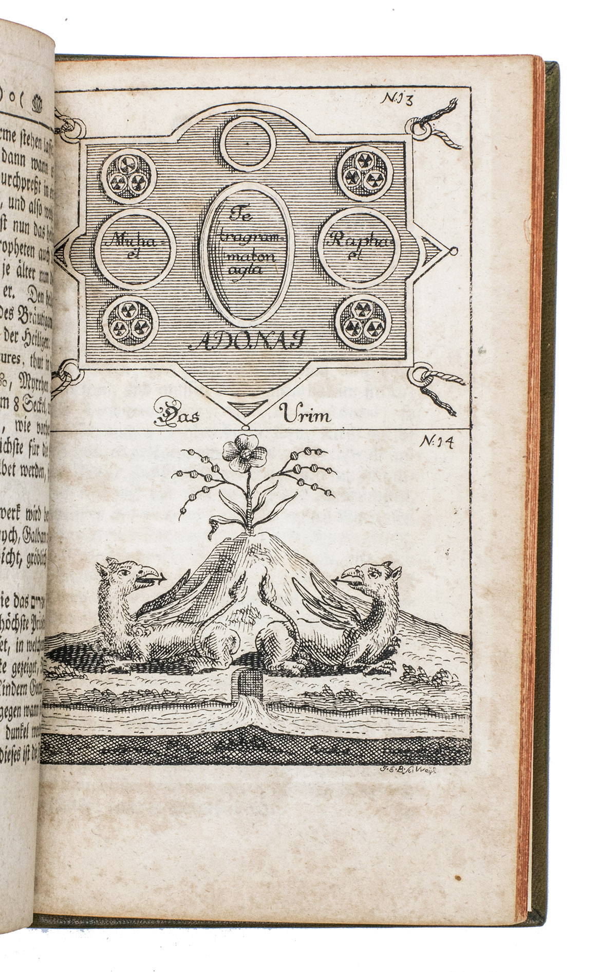 Leipzig, Lankischens Buchhandlung, 1760. 2 parts in 1 volume. 8vo. With an engraved frontispiece, 15 numbered full-page engravings, numerous woodcut illustrations in the text, woodcut decorated initials, and woodcut head- and tailpieces at the beginning and end of each part. Modern silver- and blind-tooled greenish-brown leather with a red morocco title label lettered in silver on the spine, red edges. [1], [1 blank], [26], 122, [14], [1], [1 blank], [10]; [1], [1 blank], 104, [12] pp.