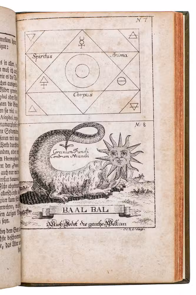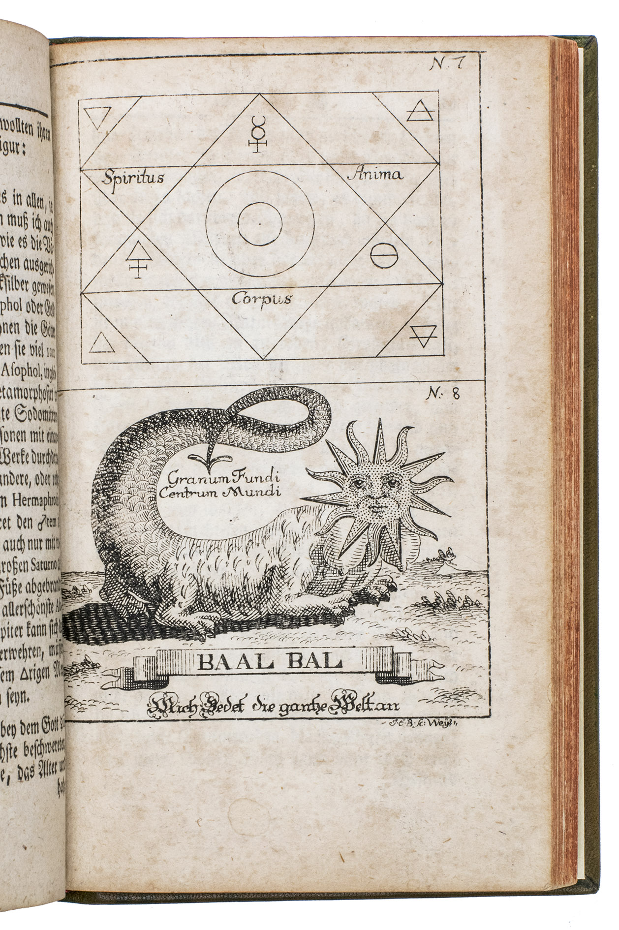 In the preface, editor Julius Gervasius von Schwarzburg (dates unknown) states that the present work was transcribed from a highly sought after manuscript, known as The Book of Abraham the Jew, which was allegedly owned by Flamel. This manuscript was a principal source on alchemy, as Abraham de Jew, or Abraham Eleazar, had copied the notions and illustrations in it directly from the copper tables of Tubal-Cain, the first blacksmith from the Bible. However, this manuscript has never been found, and the current consensus is that the present work was written by Gervasius himself. Both the first (1735) and second edition of his work are relatively scarce, especially complete. The beautiful alchemical plates capture the imagination and are therefore often removed and sold separately. The present copy, however, contains all illustrations.