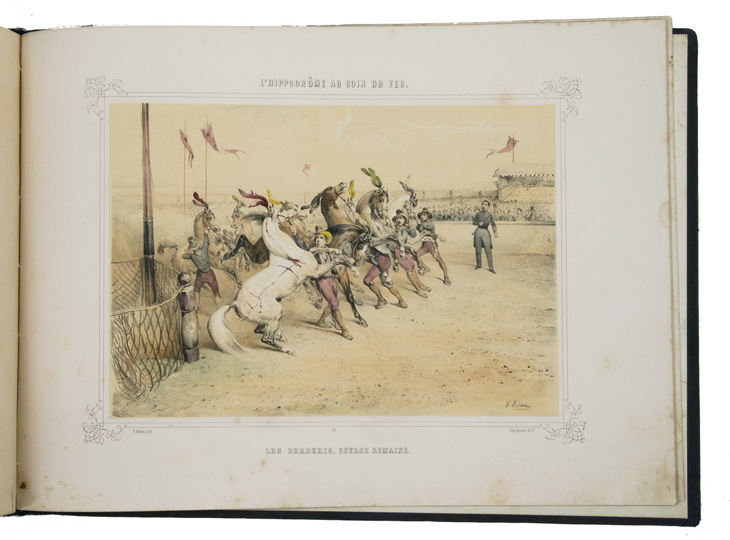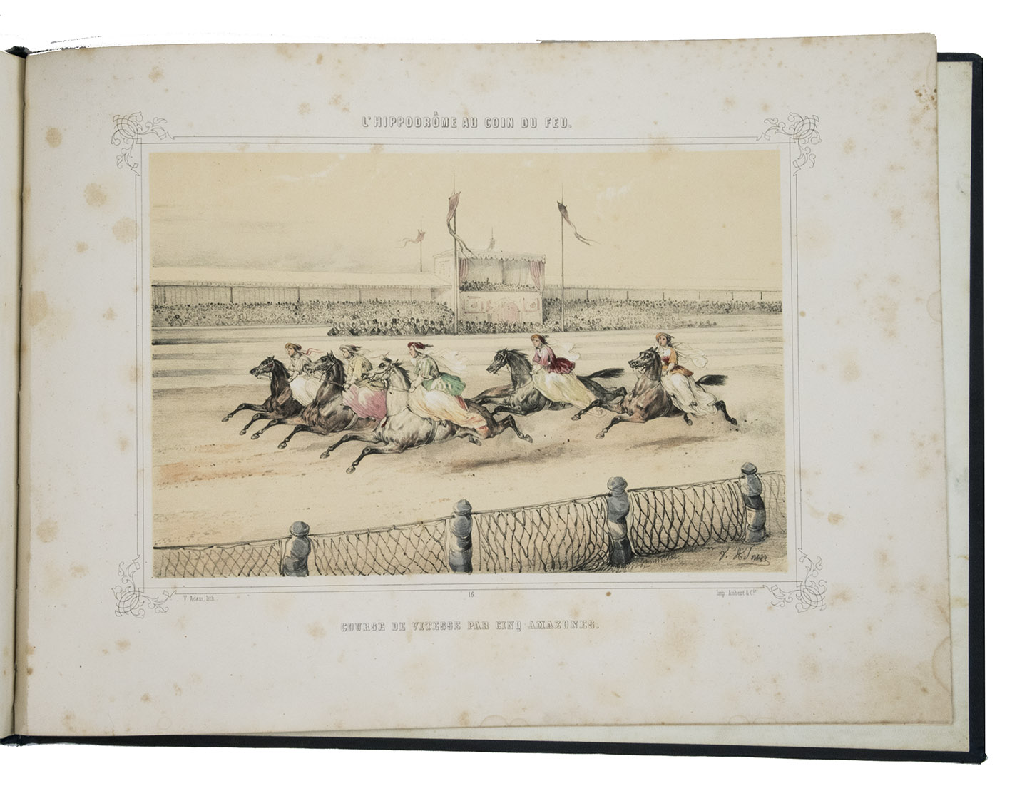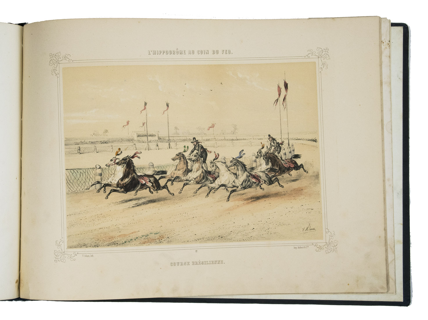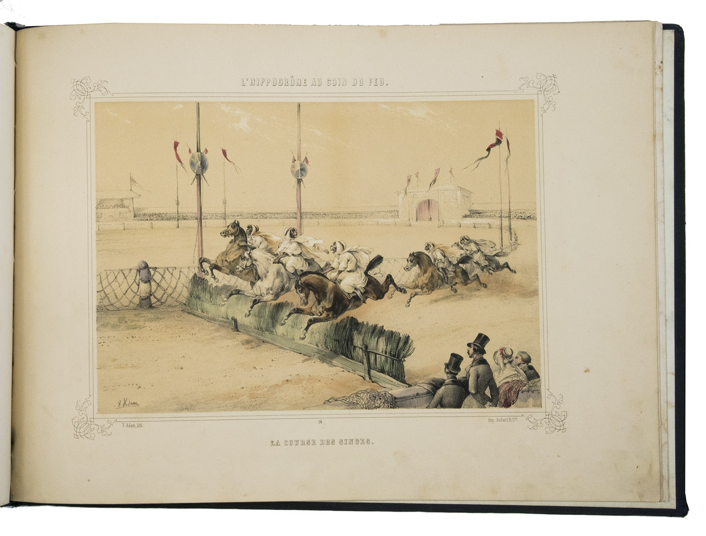 A fine example of Adam's expertise in lithography. The plates depict a variety of unusual equestrian racing scenes including chariot racing with women driving, and monkeys riding horseback.