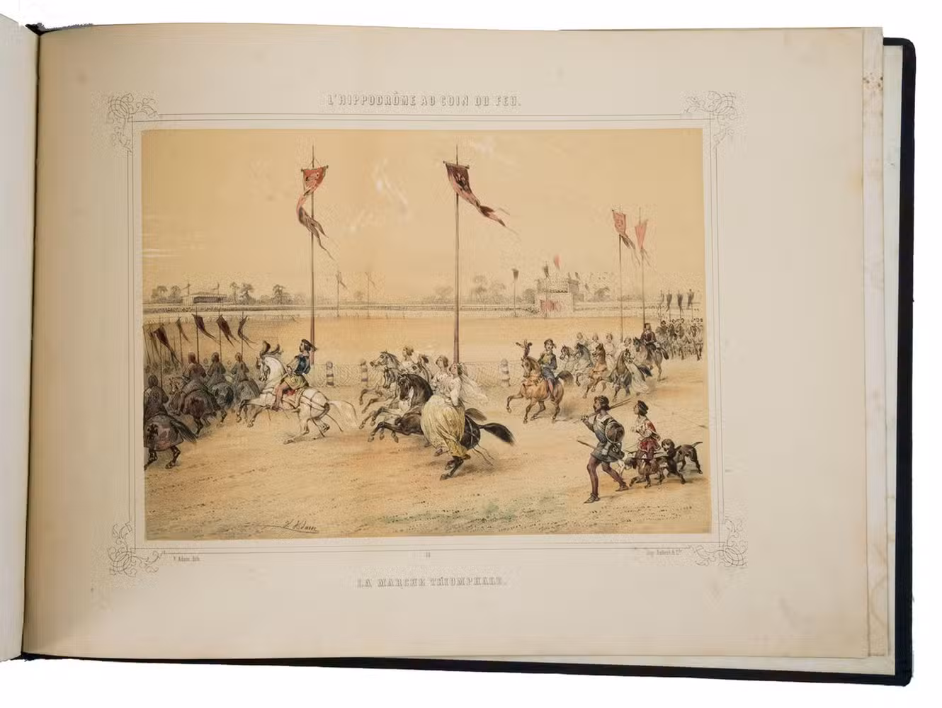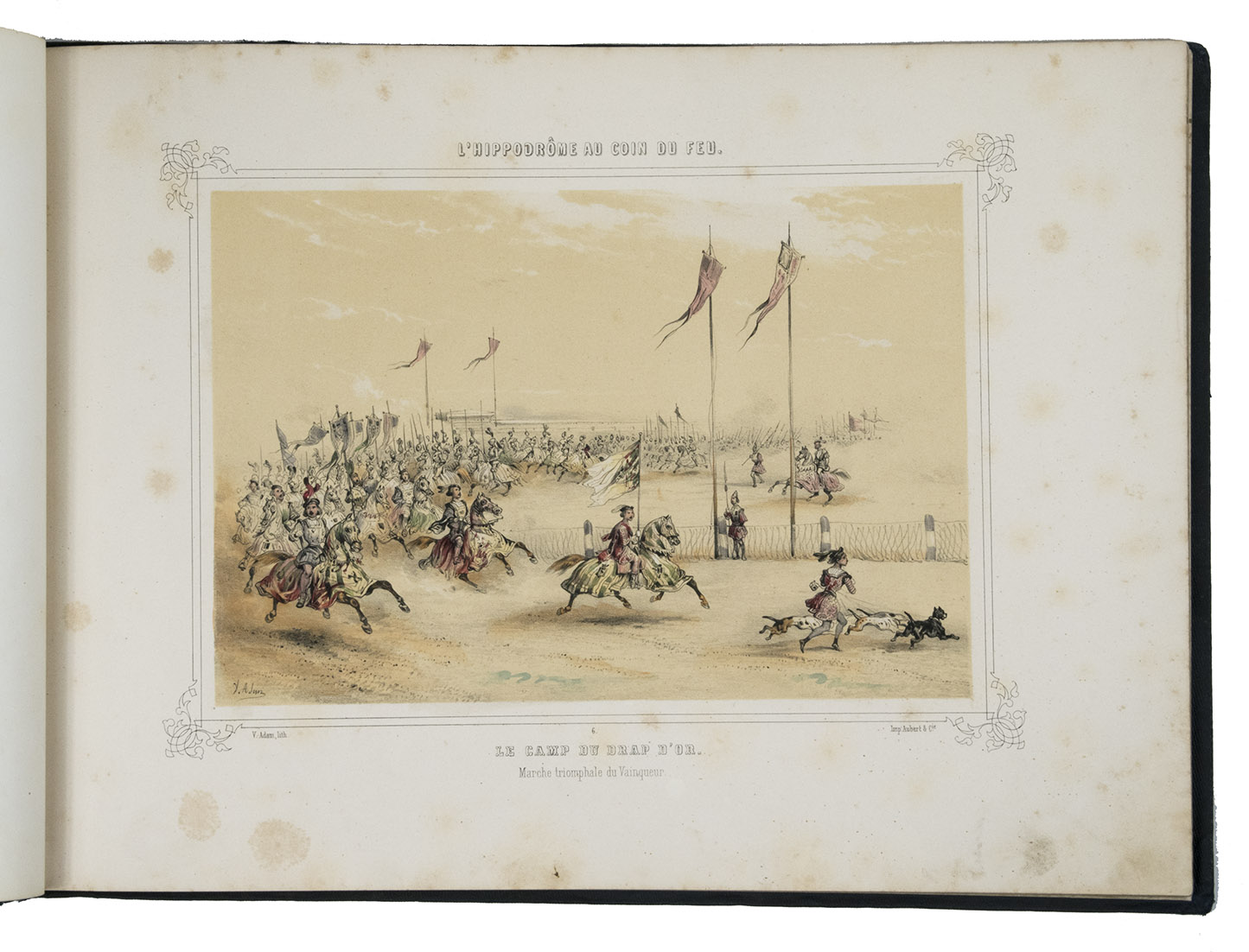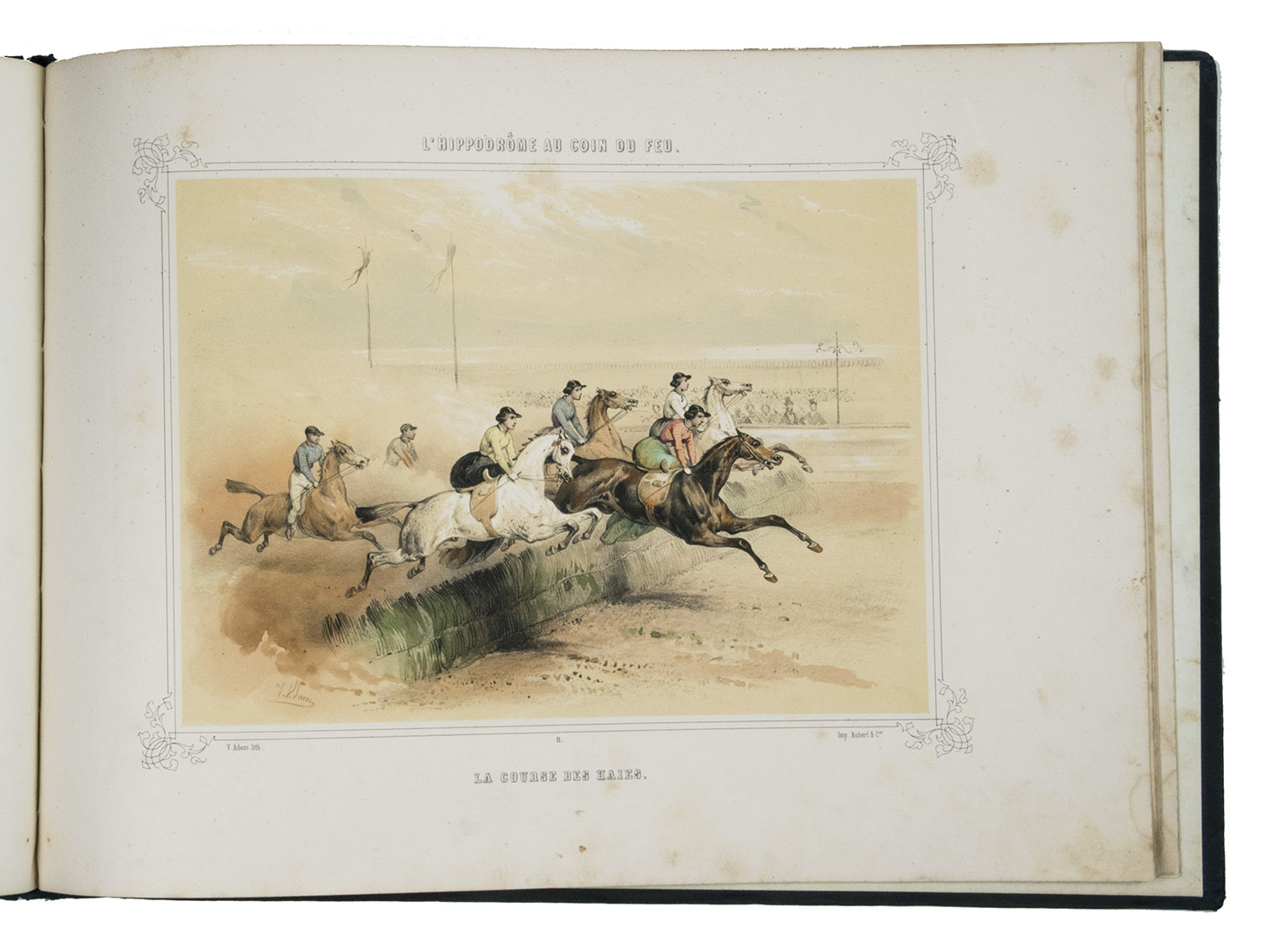 A fine example of Adam's expertise in lithography. The plates depict a variety of unusual equestrian racing scenes including chariot racing with women driving, and monkeys riding horseback.