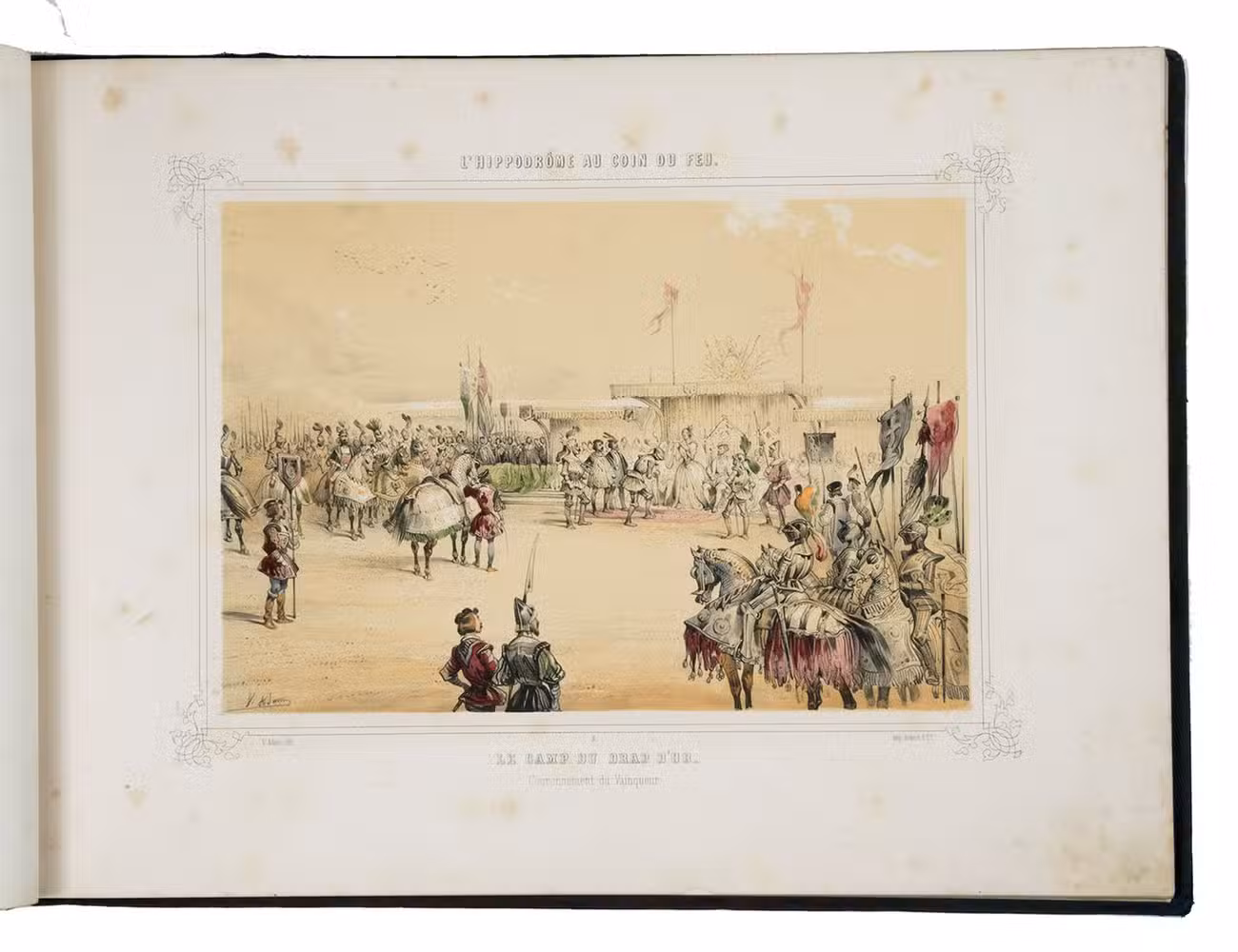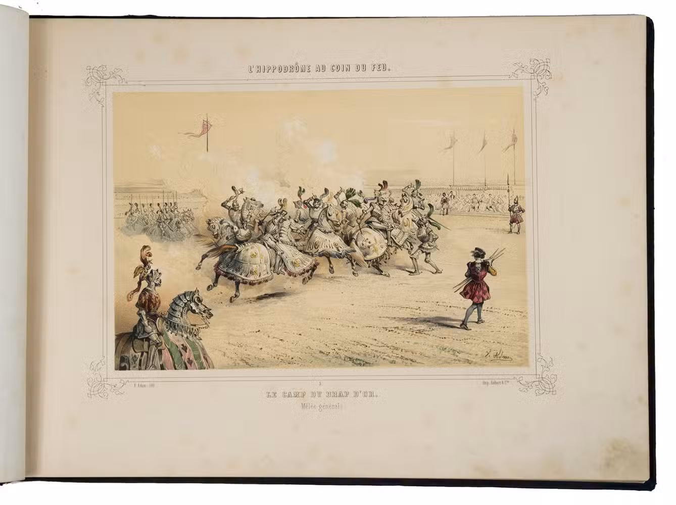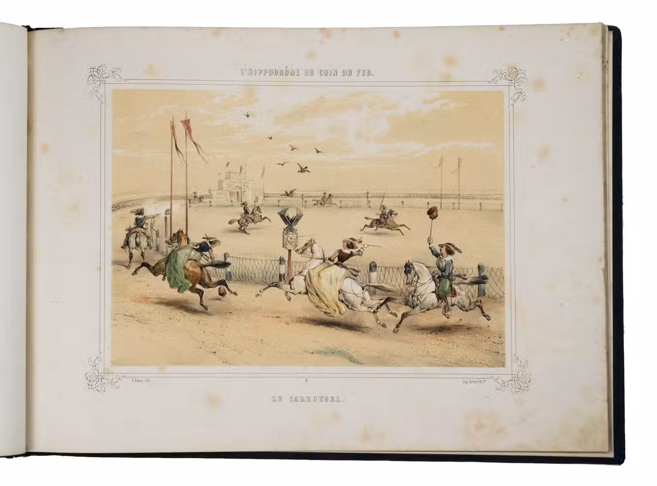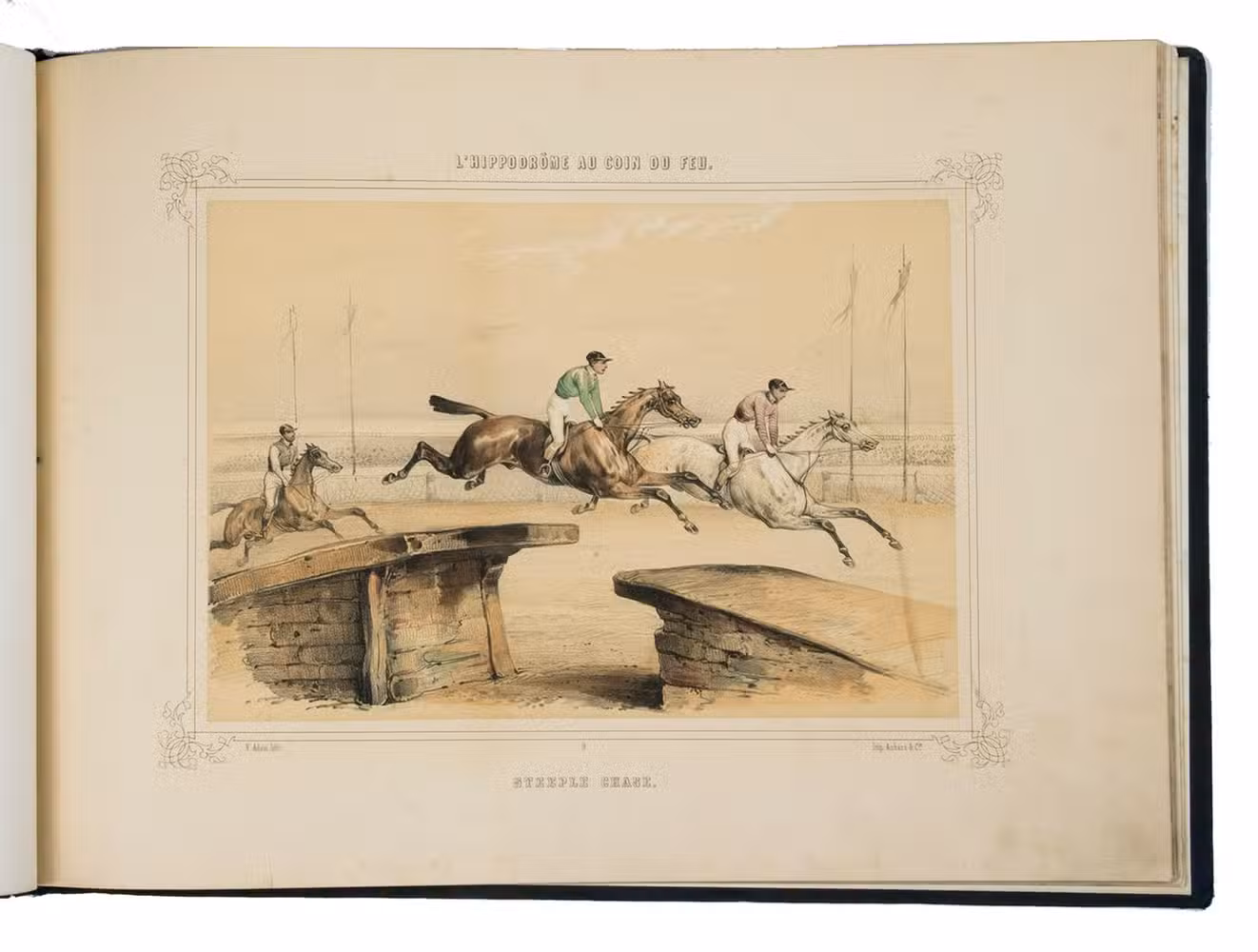 A fine example of Adam's expertise in lithography. The plates depict a variety of unusual equestrian racing scenes including chariot racing with women driving, and monkeys riding horseback.