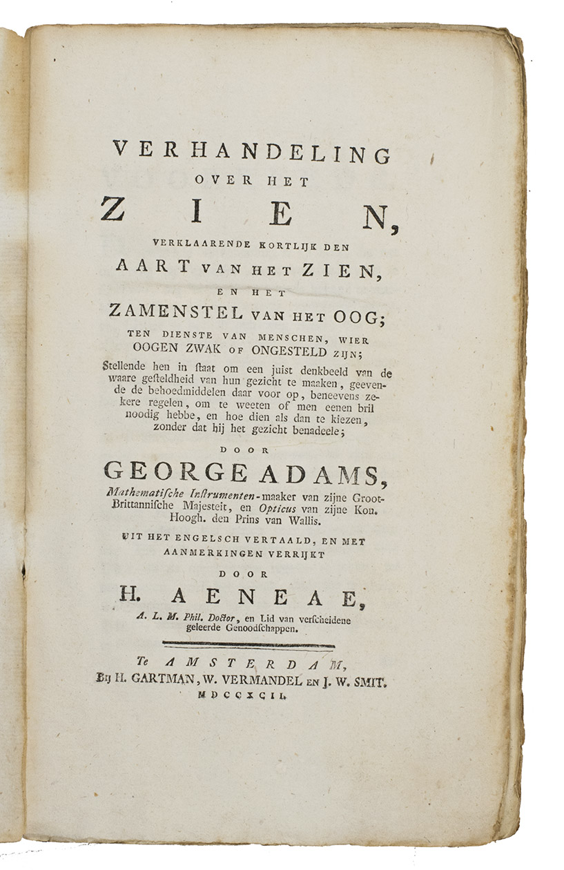 First and only edition of the Dutch translation, after the second English edition of 1792, of a detailed account of the anatomy of the eye, the use of spectacles and the improvement of vision by their use. The first edition of Adams's work had appeared in 1787 under the title An essay on vision, briefly explaining the fabric of the eye. George Adams (1750-1795), a famous London optician, served King George III as a mathematical instrument maker. He earned a worldwide reputation as a maker of spectacles and microscope lenses and wrote many elementary scientific works, which gave regular and systematic instruction in the most important branches of natural science with all its modern improvements.