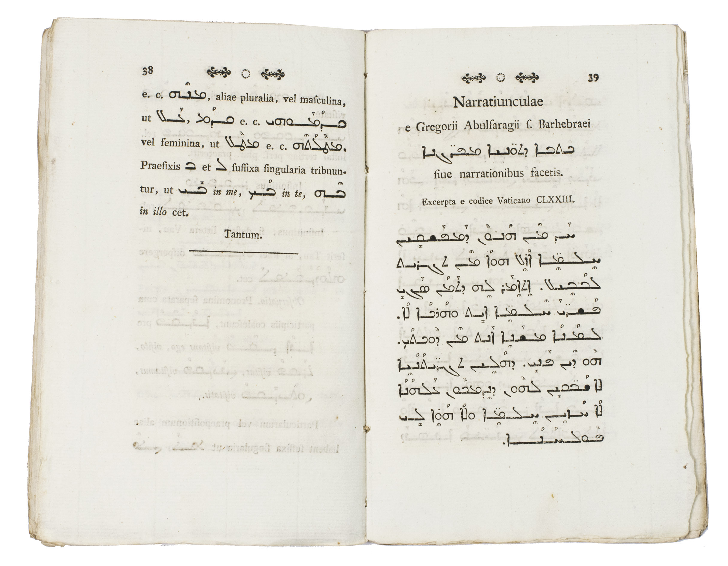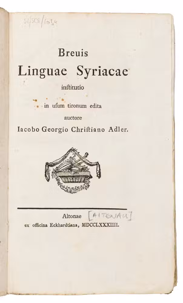 First edition of a Syriac grammar for beginners, written by Jakob Georg Christian Adler (1756-1834). It starts with a short introduction to Syriac grammar and is followed by excerpts from works by two important Syrian Christian authors: Gregory Bar Hebraeus (1226-1286), a prominent writer and church figure, and Jacob of Edessa (640-708), the bishop of Edessa and one of the most important scholars of the Christian-Aramean tradition.