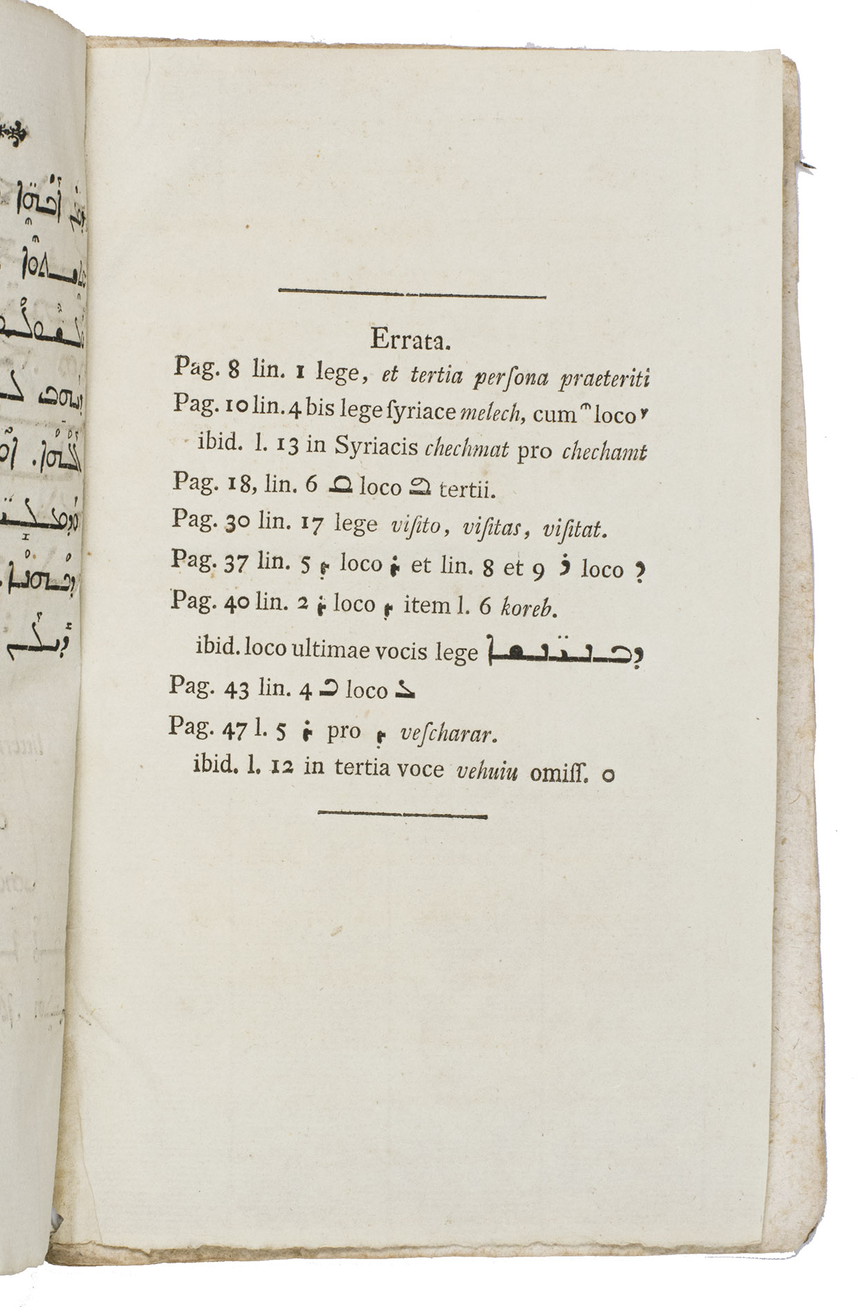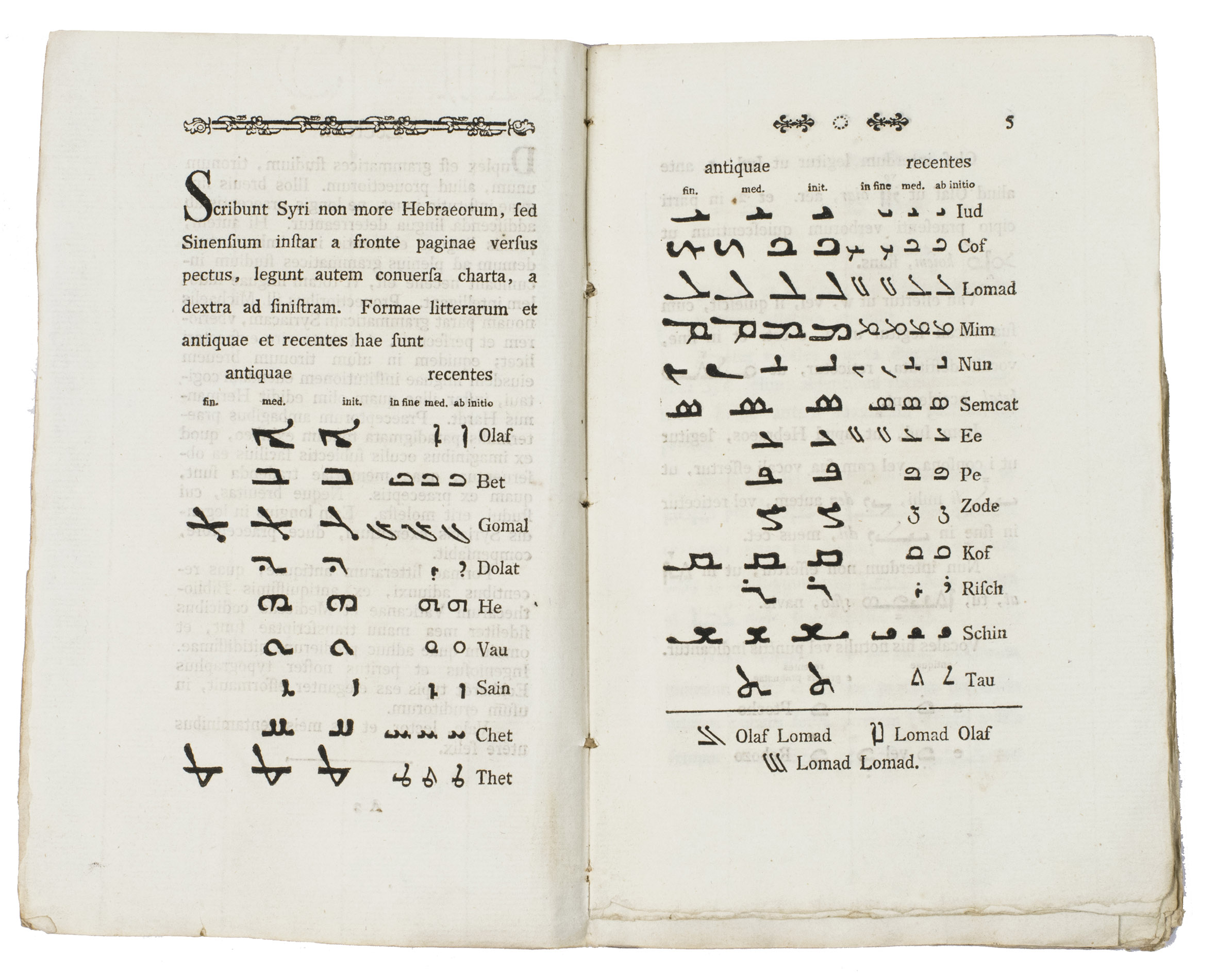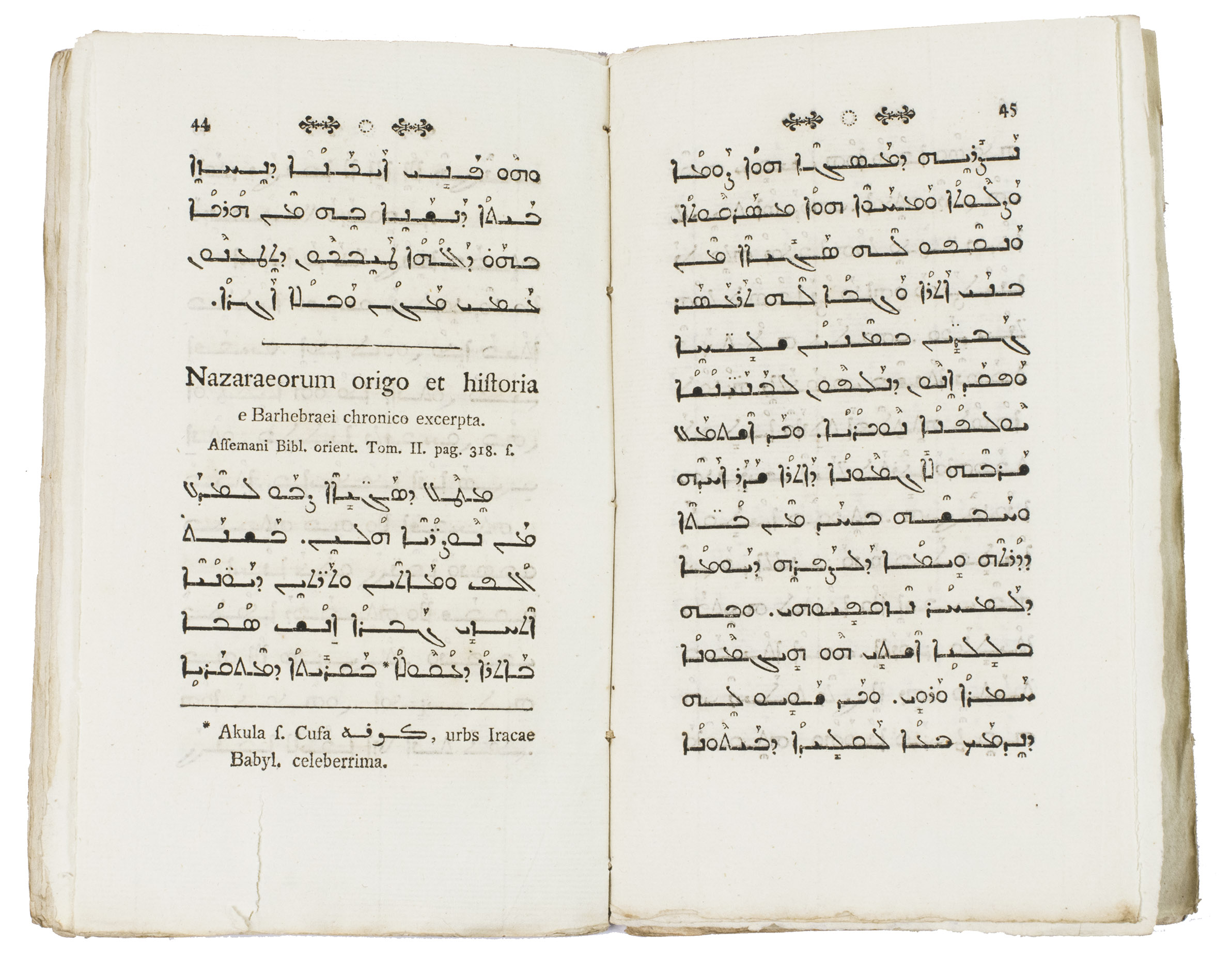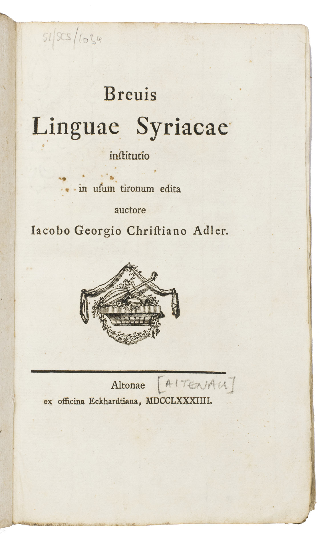 Altona, Johann David Adam Eckhardt, 1784. 8vo. With a woodcut vignette on the title-page and typographical ornaments at the head of every page. The text is set in Roman and Syriac type. Early 19th-century blue marbled paper wrappers. 64, [1], [1 blank] pp.