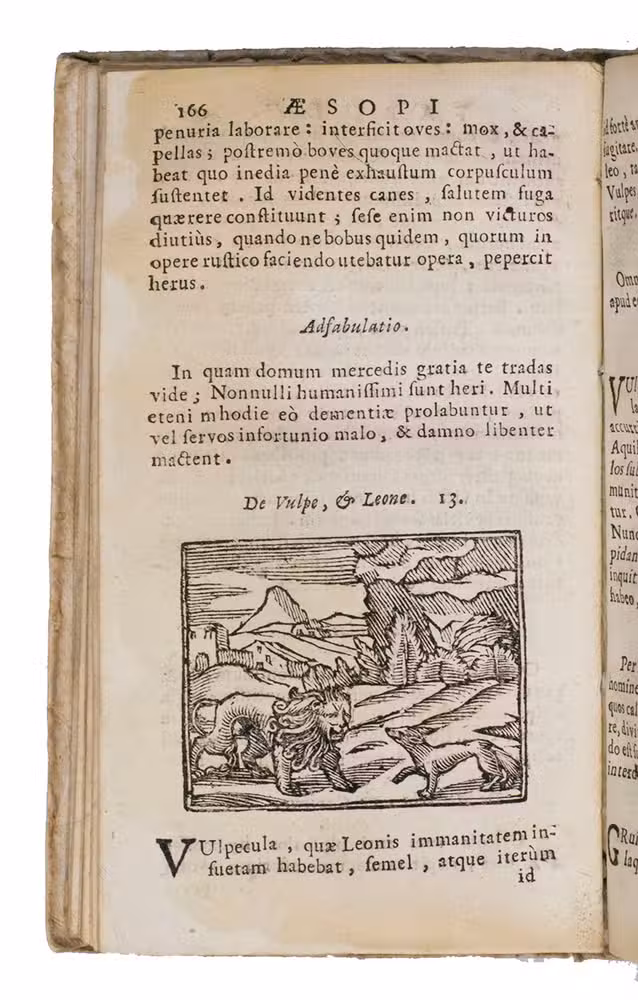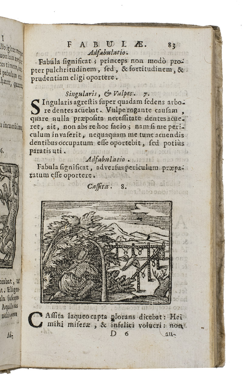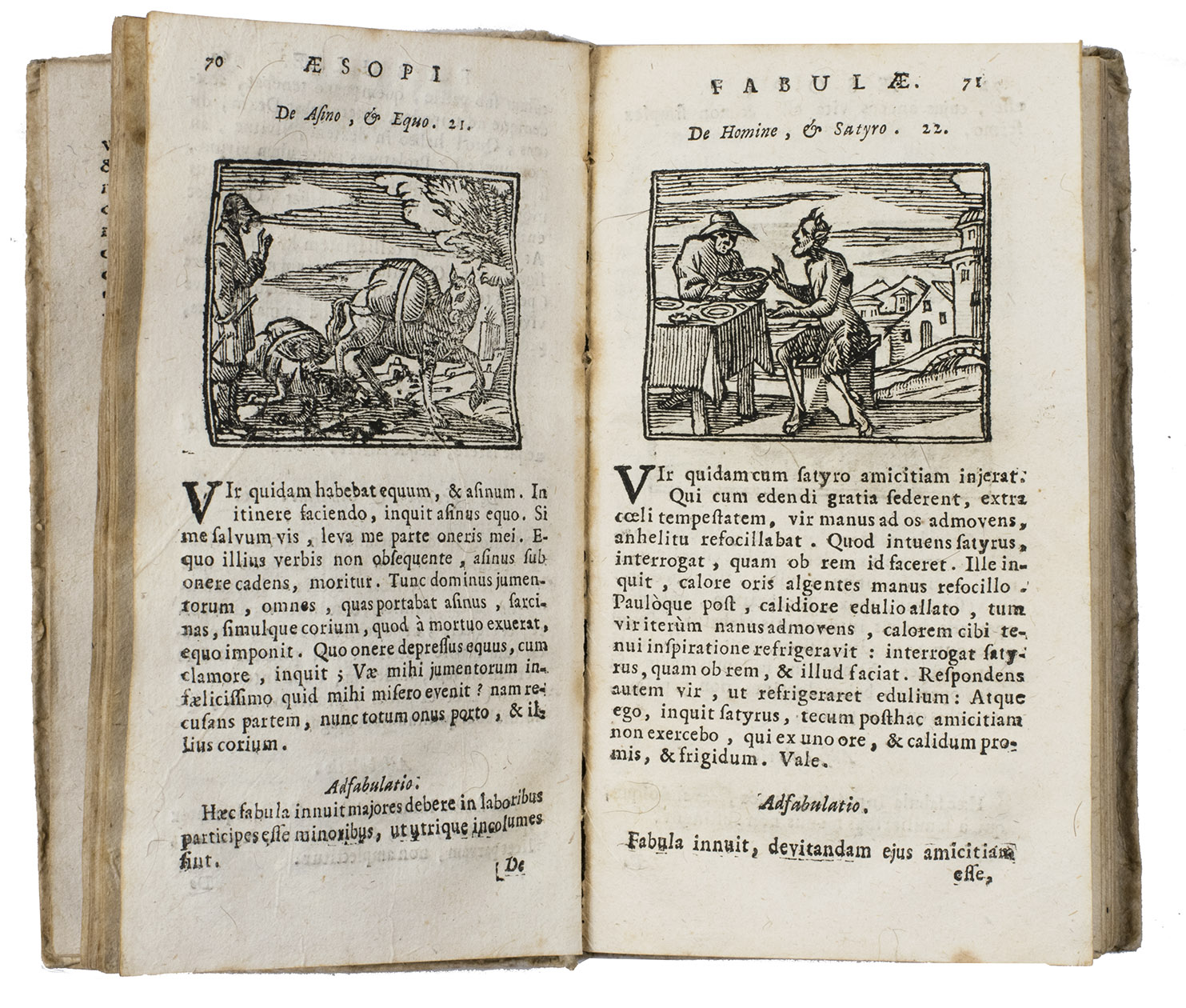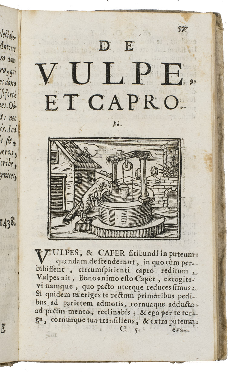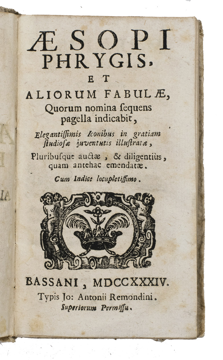 Elegant edition of de Dorpius redaction of the Aesop fables. All Latin 349 fables in prose are printed in one column, each with a Adfabulation. The edition is an almost page-for-page reprint of an earlier Bassano edition (see nr. 35) which is a reprint of the Brescia edition of 1623 (Bodemann, 64.1), with partly the same woodcuts as in the undated earlier Bassano edition, which are after those in the 1623 edition but somewhat enlarged. The woodcuts in our edition (not all!) are more worn down than in the u dated Bassano edition). Bodemann, 64. 2 (variant, or printing error in Bodemann: 1743 = 1734?), see also 64.1 (& 31.1); not in Fabulae docet.