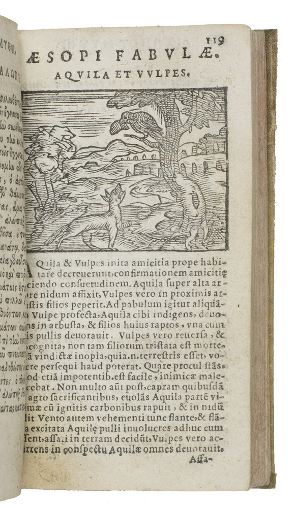 One of the many school editions of the fables of Aesop with the same title (at least 8 between 1524 and 1589, some printed in Basel by Froben, others in Venice), with parallel Greek and Latin text printed on facing pages.