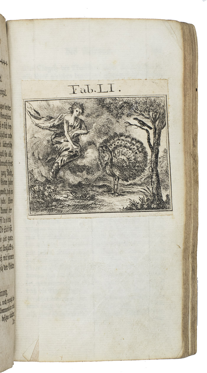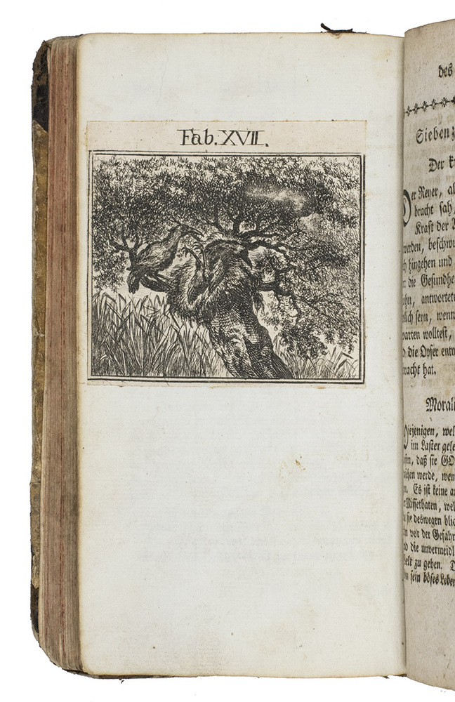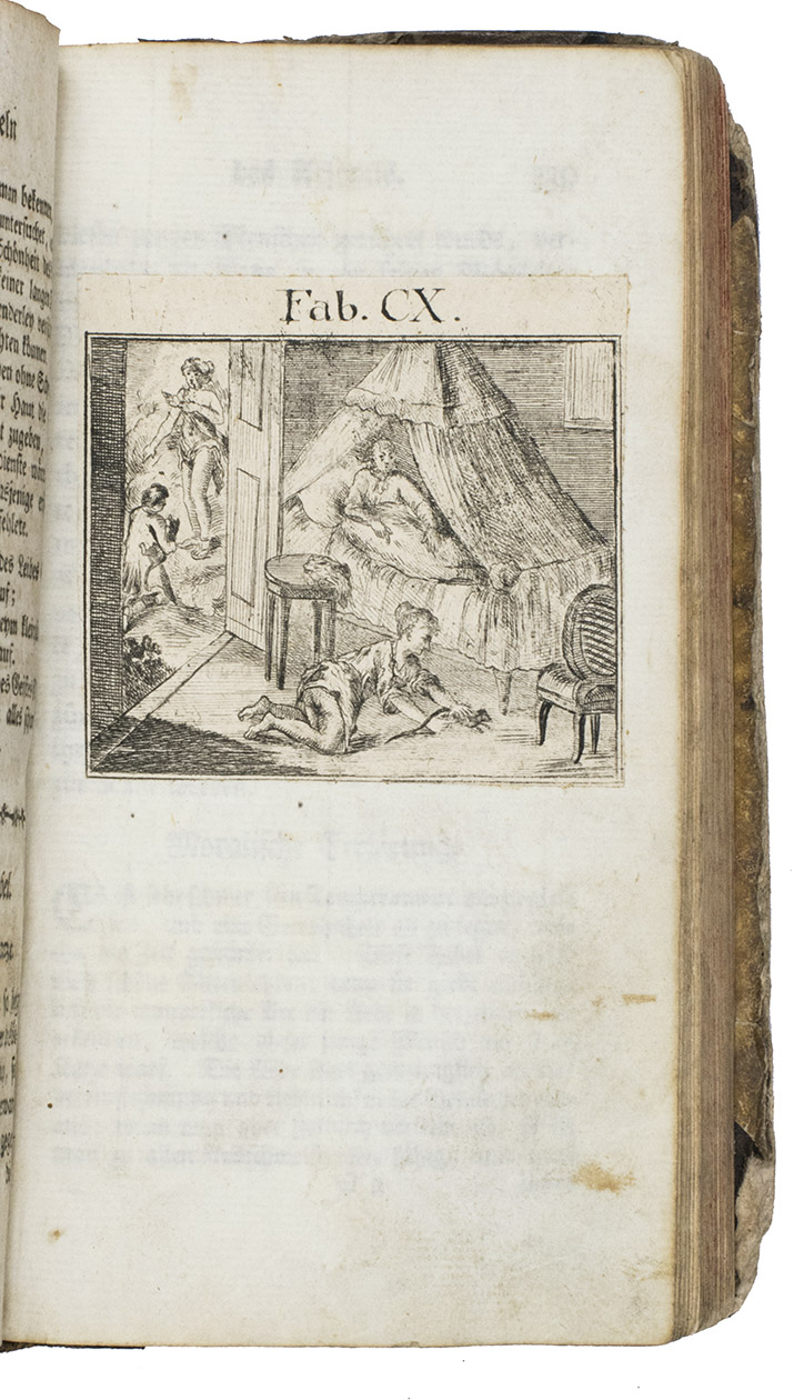 Copenhagen, [widow of Gabr. Christ. Rothen] & Leipzig, Christian Gottlob Prost, 1781. 8vo. With a woodcut title-vignette, woodcut head- and tailpieces and 117 etchings with captions "Fab. I-CXVII" illustrating the 117 Aesop fables, each pasted on separate leaves, except the last one (Fab. CXVII). Contemporary half calf, brown paper sides, brown morocco spine label with the title in (oxidized) gold. XXIV, 576 pp.