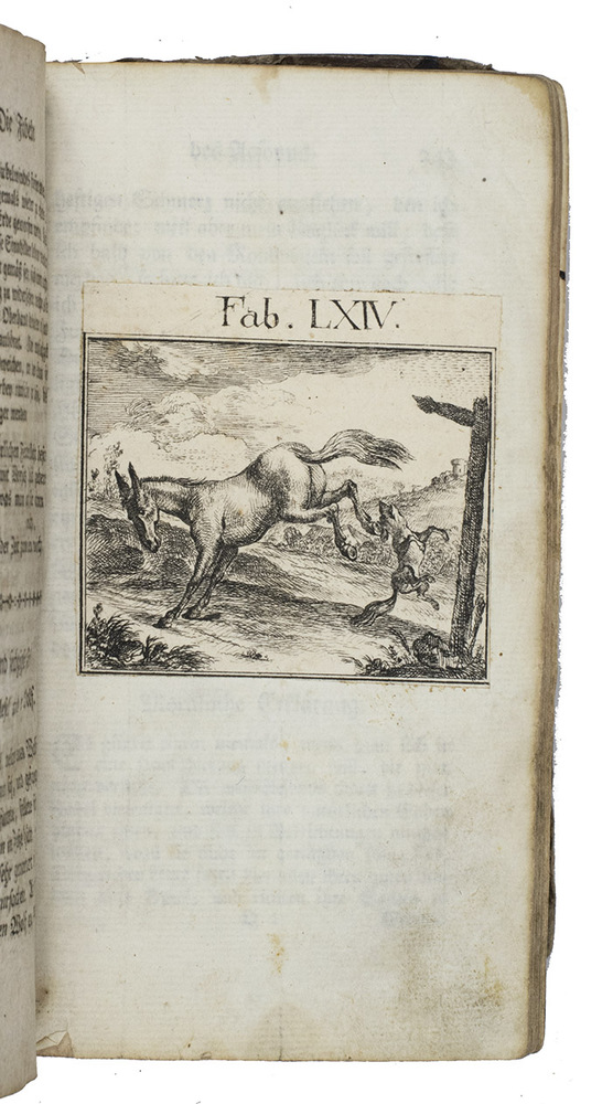 The second edition of the German translation of the French edition of the Aesop fables by Jean-Baptiste Morvan de Bellegarde (1648-1734), with extensive dialogues on the moral of each fable together with the life of Aesop by Planudes, the 18 fables of the Italian renaissance humanist and classical scholar Francesco Philelphus (1398-1481), and the fables of Gabrias and Avianus (Amsterdam, for Pierre Mortier, 1708). The first edition appeared in Copenhagen by the widow of Gabr. Christ. Rothen, und in 1769 in Leipzig by Christian Gottlob Prost (Bodemann, 97.4). The 117 etchings illustrating the Aesop fables are after the engravings of the first edition, but are different.