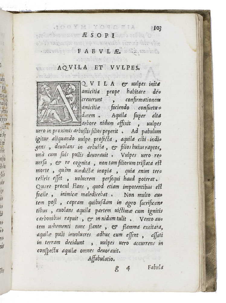 With a few contemporary manuscript notes in brown ink. With some marginal worm holes, mostly in the gutter of quires r and s, and some mostly marginal water stains, more serious in quire c, and a dark stain in the upper outside corner of 2 leaves, not approaching the text, otherwise in good condition. The binding is wrinkled, with a 1½ x 2 cm gap in the backstrip, some small tears and the 2 pair of ties lost. A nice early student edition of Aesop with very extensive additions. EDIT 16, CNCE 364; STC Italian, p. 8; USTC 807871.