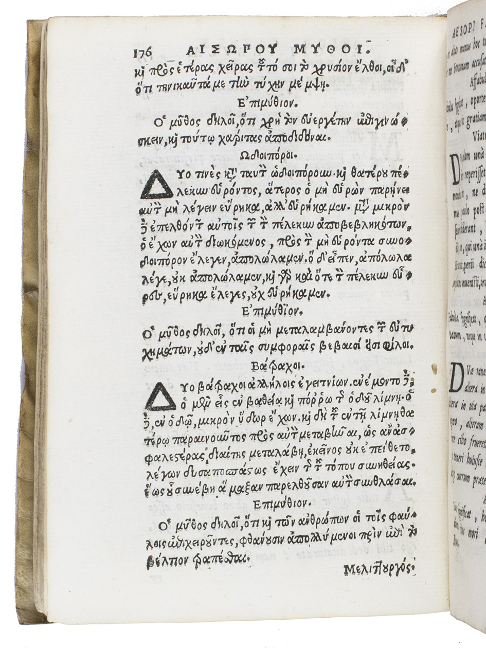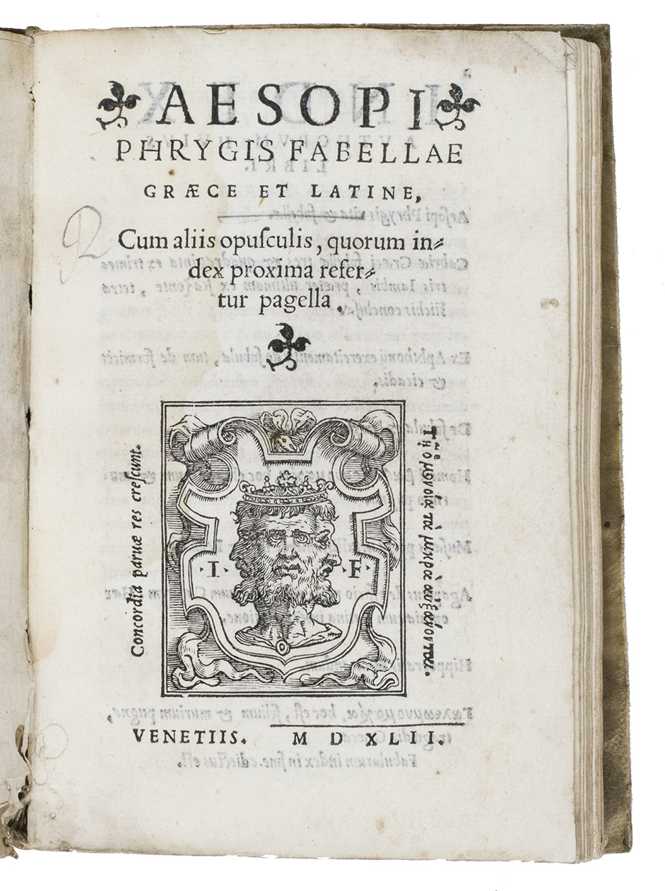 Venice school edition of Aesop's fables with parallel text in Greek and Latin. The book is neatly printed and the clear Greek type has relatively few ligatures. Besides the life of Aesop and Aesop's fables, the book contains several collections of fables and single fables by other authors (pp. 232-364): [Ignatius von Nicaea], Gabriae Graeci fabellae (often added to the Aesop canon); Aphthonius, Excercitamentis de fabula; Philostratus, De fabula; pseudo Homer, Batrachomyomachia (the battle of frogs and mice, a parody of Homer's Iliad); Musaeus, De Ero & Leandro (Hero and Leander; Agapetus, De officio regis; Hippocrates, Ius iurandum (the Hippocratic oath!), and [Theodorus Prodromus], Galeomnomachia (the battle between the cats and the mice), the last two in Greek only. The book ends with a 4-page index and the colophon.