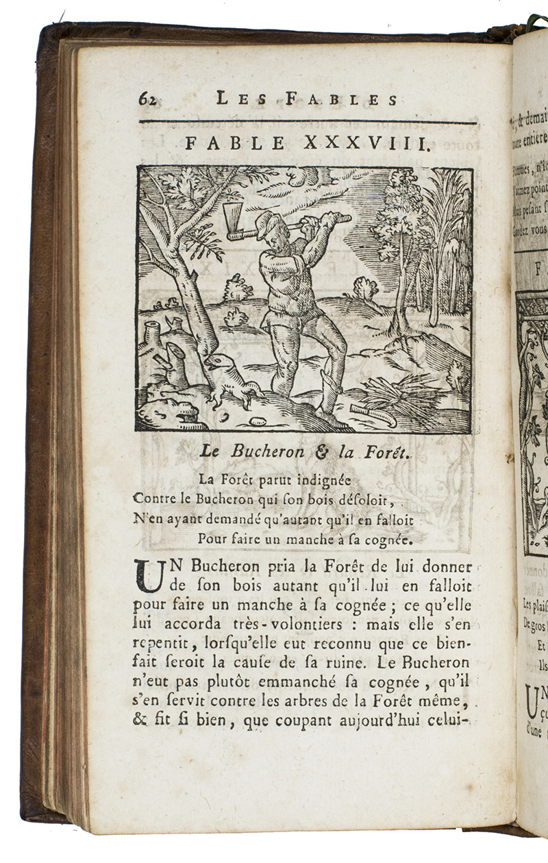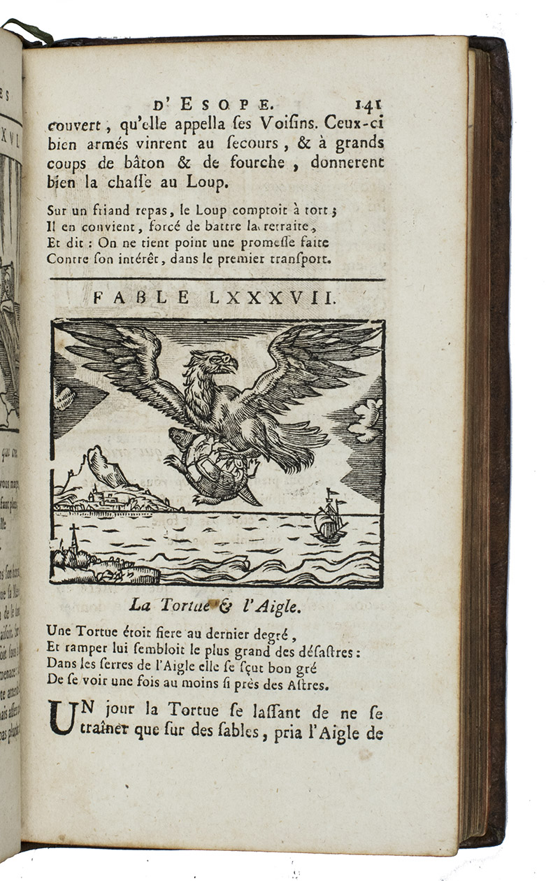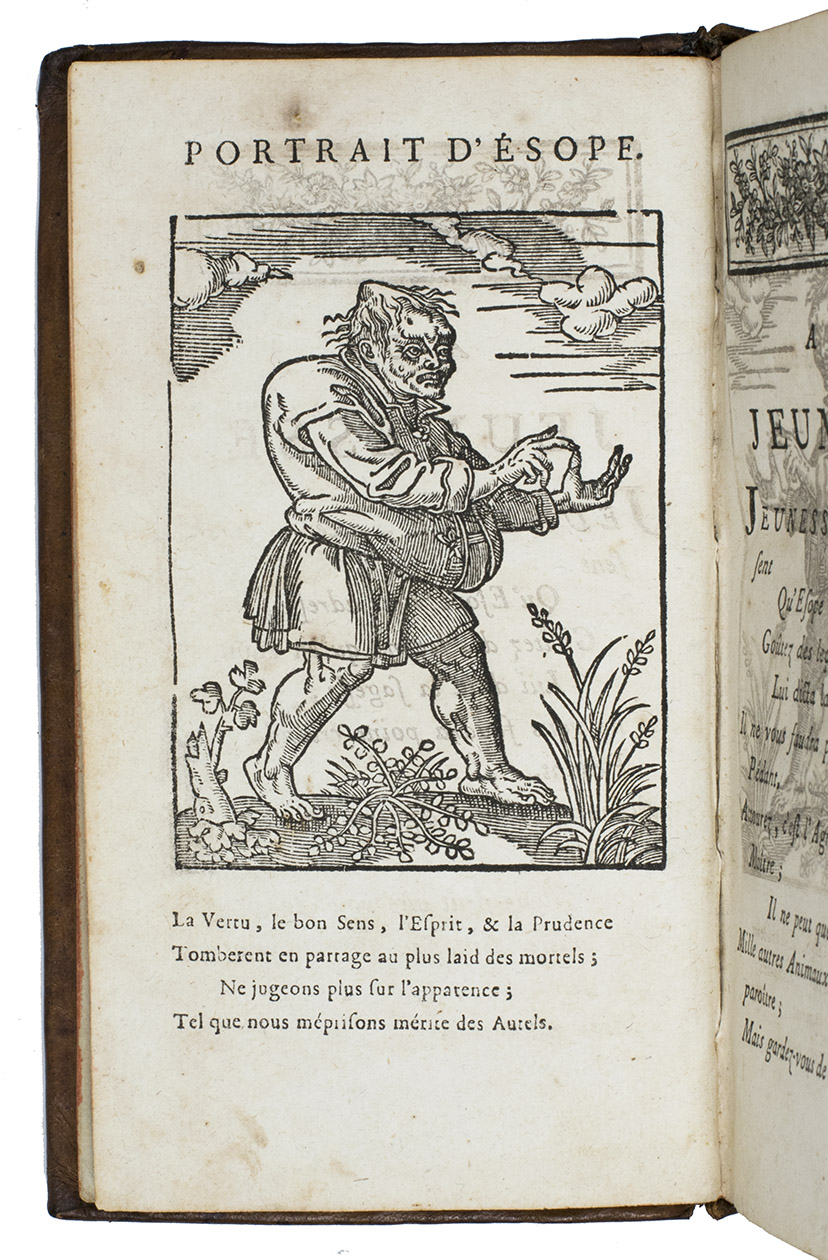 Augmented nicely illustrated re-edition of the editions of 1764 and 1787 with the same collation, printed by Richard Lallemant in Rouen (Bodemann, 113.1-2). As in these editions, also in our edition there are the 225 fables of Aesop in French prose with the quatrains by the French writer and dramaturge Isaac Benserade (1612-1691). The translation of the Vie dÉsope is illustrated with 28 woodcuts; the other 164 woodcuts illustrate 164 Fables. They are after the series of Bernard Salomon and Marcus Gheeraerts.