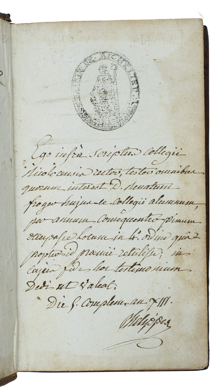 Library stamp, ownerships entries and a note (1805) written on the first fly-leaves. Cf. Bodemann, 113.1-2.